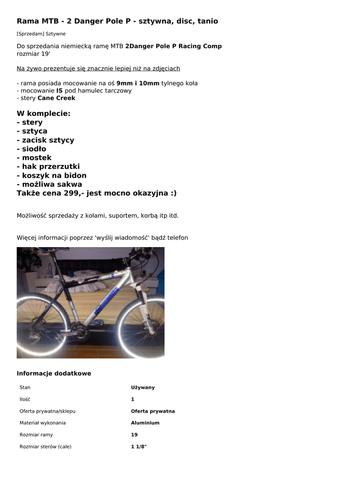 Rama MTB - 2 Danger Pole P - sztywna, disc, tanio [Sprzedam] Sztywne Do sprzedania niemiecką ramę MTB 2Danger Pole P Racing Comp rozmiar 19' Na żywo prezentuje się znacznie lepiej niż na zdjęciach - rama posiada mocowanie na oś 9mm i 10mm tylnego koła - mocowanie IS pod hamulec tarczowy - stery Cane Creek W komplecie: - stery - sztyca - zacisk sztycy - siodło - mostek - hak przerzutki - koszyk na bidon - możliwa sakwa Także cena 299,- jest mocno okazyjna :) Możliwość sprzedaży z kołami, suportem, korbą itp itd. Więcej informacji poprzez 'wyślij wiadomość' bądź telefon Informacje dodatkowe Stan Używany Ilość 1 Oferta prywatna/sklepu Oferta prywatna Materiał wykonania Aluminium Rozmiar ramy 19 Rozmiar sterów (cale) 1 1/8" Adres ogłoszenia http://rowerowybazar.com.pl/rama-mtb-2-danger-pole-p-sztywna-disc-tanio,o3973 Kontakt Mail: [email protected] Telefon: 690240543 Lokalizacja , Kraków Małopolskie (polska) Ogłoszenie dodano: 2016-05-17 18:29:58 Ogłoszenie wygasa: 2016-11-17 14:11:55 Powered by TCPDF (www.tcpdf.org)