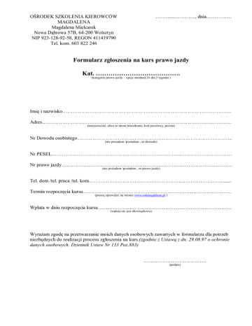 Formularz zgłoszenia na kurs prawo jazdy Kat.