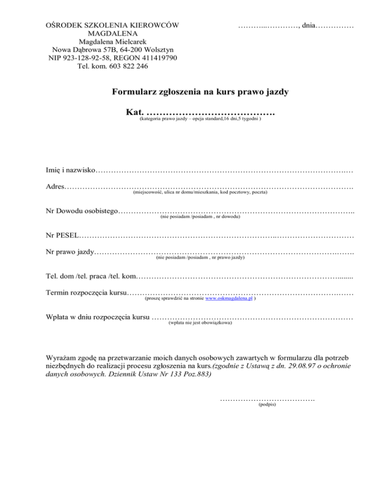 OŚRODEK SZKOLENIA KIEROWCÓW MAGDALENA Magdalena Mielcarek Nowa Dąbrowa 57B, 64-200 Wolsztyn NIP 923-128-92-58, REGON 411419790 Tel. kom. 603 822 246 ………...…………, dnia…………… Formularz zgłoszenia na kurs prawo jazdy Kat. …………………………………. (kategoria prawo jazdy – opcja standard,16 dni,5 tygodni ) Imię i nazwisko…………………………………………………………………………………….… Adres…………………………………………………………………………………………………. (miejscowość, ulica nr domu/mieszkania, kod pocztowy, poczta) Nr Dowodu osobistego……………………………………………………………………………….. (nie posiadam /posiadam , nr dowodu) Nr PESEL…………………………………………………………………..………………………… Nr prawo jazdy………………………………………………………………………………….……. (nie posiadam /posiadam , nr prawo jazdy) Tel. dom /tel. praca /tel. kom……………………………………………………………………........ Termin rozpoczęcia kursu……………………………………………………………………….…… (proszę sprawdzić na stronie www.oskmagdalena.pl ) Wpłata w dniu rozpoczęcia kursu …………………………………………………………………… (wpłata nie jest obowiązkowa) Wyrażam zgodę na przetwarzanie moich danych osobowych zawartych w formularzu dla potrzeb niezbędnych do realizacji procesu zgłoszenia na kurs.(zgodnie z Ustawą z dn. 29.08.97 o ochronie danych osobowych. Dziennik Ustaw Nr 133 Poz.883) ………………………………. (podpis) REGULAMIN OŚRODKA SZKOLENIA KIEROWCÓW MAGDALENA 1. Ośrodek szkolenia kierowców MAGDALENA prowadzi szkolenia kandydatów na kierowców kat B w zakresie szkolenia podstawowego , dodatkowego i uzupełniającego. 2. Ośrodek Szkolenia kierowców MAGDALENA jest zobowiązany do przeprowadzenia zajęć teoretycznych i praktycznych w określonym miejscu i czasie w ilości ustalonej w cenie kursu i nie mniejszej jak ustawowa. Godzina zajęć teoretycznych równa się 45min, a praktycznych 60min 3. Szkolenie zakończone jest egzaminem wewnętrznym teoretycznym i praktycznym przeprowadzonym w obecności instruktora prowadzącego. 4. Pozytywny wynik egzaminu praktycznego jest jednoznaczny z wydaniem zaświadczenia o ukończeniu kursu, a egzamin taki jest przeprowadzany bezpłatnie. 5. Do egzaminu można przystępować wielokrotnie z tym ,że egzamin poprawkowy teoretyczny jest bezpłatny , natomiast egzamin praktyczny jest płatny tak jak za jedną godzinę jazdy według cennika w ośrodku. 6. Ośrodek zapewnia, badania lekarskie na terenie ośrodka, zajęcia z pierwszej pomocy przedlekarskiej, z wykwalifikowanymi ratownikami medycznymi, w obecności lekarza uprawnionego. 7. Kandydat na kierowcę zwany również kursantem jest zobowiązany do systematycznego uczestnictwa w zajęciach teoretycznych i praktycznych. 8. W przypadku braku możliwości uczestniczenia w zajęciach kursant jest zobowiązany powiadomić o nieobecności instruktora prowadzącego, i kierownika ośrodka minimum 24 godziny przed zajęciami, a w przypadku braku powiadomienia uiszczenia opłaty za każdą umówioną godzinę jazdy według cennika ośrodka. 9.Kandydat na kierowcę ma prawo do zmiany instruktora prowadzącego również bez podania przyczyny zmiany. 10. Kursant jest zobowiązany powiadomić kierownika ośrodka o wszelkich problemach związanych ze szkoleniem, a kierownik ośrodka do rozpatrzenia roszczeń w trybie pilnym i podjęcia właściwych kroków. 11. W przypadkach uzasadnionych, sytuacjami losowymi istnieje możliwość odstąpienia od opłaty zawartej w pkt. 8 poprzez pisemny wniosek do kierownika ośrodka. 12. Kursant jest zobowiązany do systematycznych wpłat tak, aby kończąc kurs miał uregulowaną całą opłatę. 13 W sprawach nie uregulowanych niniejszym regulaminem zastosowanie mają przepisy kodeksu cywilnego. ………………………….. (data i podpis kursanta) OŚWIADCZENIE 1. Oświadczam ,że w przypadku nie zapłacenia należności za kurs poddaje się egzekucji poprzez firmę windykacyjną, i poniosę wszelkie koszty z tym związane z ustawowymi odsetkami włącznie. 2. Oświadczam, że wyrażam nie wyrażam (niepotrzebne skreślić) zgodę na umieszczenie mojego zdjęcia na firmowej stronie www ośrodka. 3.Wyrażam zgodę na przetwarzanie moich danych osobowych dla potrzeb niezbędnych dla realizacji procesu szkolenia oraz marketingu zgodnie z ustawą z dnia 29. 08 .97 roku o Ochronie Danych Osobowych Dz. U. Nr. 133 poz. 883 /" ………………………….. (data i podpis kursanta) REGULAMIN OŚRODKA SZKOLENIA KIEROWCÓW MAGDALENA 1. Ośrodek szkolenia kierowców MAGDALENA prowadzi szkolenia kandydatów na kierowców kat B w zakresie szkolenia podstawowego , dodatkowego i uzupełniającego. 2. Ośrodek Szkolenia kierowców MAGDALENA jest zobowiązany do przeprowadzenia zajęć teoretycznych i praktycznych w określonym miejscu i czasie w ilości ustalonej w cenie kursu i nie mniejszej jak ustawowa. Godzina zajęć teoretycznych równa się 45min, a praktycznych 60min 3. Szkolenie zakończone jest egzaminem wewnętrznym teoretycznym i praktycznym przeprowadzonym w obecności instruktora prowadzącego. 4. Pozytywny wynik egzaminu praktycznego jest jednoznaczny z wydaniem zaświadczenia o ukończeniu kursu, a egzamin taki jest przeprowadzany bezpłatnie. 5. Do egzaminu można przystępować wielokrotnie z tym ,że egzamin poprawkowy teoretyczny jest bezpłatny , natomiast egzamin praktyczny jest płatny tak jak za jedną godzinę jazdy według cennika w ośrodku. 6. Ośrodek zapewnia, badania lekarskie na terenie ośrodka, zajęcia z pierwszej pomocy przedlekarskiej, z wykwalifikowanymi ratownikami medycznymi, w obecności lekarza 