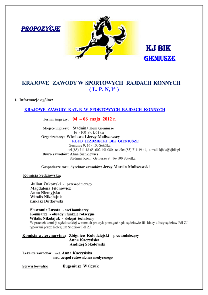 PROPOZYCJE KJ BIK GIENIUSZE KRAJOWE ZAWODY W SPORTOWYCH RAJDACH KONNYCH ( L, P, N, l* ) I. Informacje ogólne: KRAJOWE ZAWODY KAT. B W SPORTOWYCH RAJDACH KONNYCH Termin imprezy: 04 – 06 maja 2012 r. Miejsce imprezy: Stadnina Koni Gieniusze 16 - 100 S o k ó ł k a Organizatorzy: Wiesława i Jerzy Maliszewscy KLUB JEŹDZIECKI BIK GIENIUSZE Geniusze 9, 16 - 100 Sokółka tel.(85) 711 18 65, 602 151 080, tel./fax.(85) 711 19 44, e-mail: [email protected] Biuro zawodów: Alina Sienkiewicz Stadnina Koni, Geniusze 9, 16-100 Sokółka Gospodarze toru, dyrektor zawodów: Jerzy Marcin Maliszewski Komisja Sędziowska: Julian Żukowski - przewodniczący Magdalena Fiłonowicz Anna Niemyjska Witalis Nikołajuk Łukasz Dutkowski Sławomir Lasota - szef komisarzy Komisarze - obsady i funkcje rotacyjne Witalis Nikołajuk - delegat techniczny W pracach komisji sędziowskiej w ramach praktyk pomagać będą sędziowie III klasy z listy sędziów Pdl ZJ typowani przez Kolegium Sędziów Pdl ZJ. Komisja weterynaryjna: Zbigniew Kołodziejski - przewodniczący Anna Kaczyńska Andrzej Sokołowski Lekarze zawodów: wet. Anna Kaczyńska med. zespół ratownictwa medycznego Serwis kowalski : Eugeniusz Walczuk II. Program zawodów Planowane konkursy: - Konkurs nr Konkurs nr Konkurs nr Konkurs nr 1 2 3 4 - kategoria 1* na dystansie kategoria N na dystansie kategoria P na dystansie kategoria L na dystansie 85,7 km o Puchar Starosty Sokólskiego 85,7 km o Puchar Burmistrza Sokółki 45,5 km o Puchar Prezesa Metal-Fach Sokółka 32,5 km o Puchar Prezesa KJ BIK Gieniusze Konkursy 1, 2, 3, 4 rozegrane zostaną w ramach zawodów krajowych kat. B. W kategorii 1* rozegrany zostanie konkurs Best Condition. Piątek - 04. 05. 2012 r. Godzina 16.00 - przegląd weterynaryjny Godzina 18.00 - odprawa techniczna Sobota - 05. 05. 2012r. Godzina 7.00 - start do KONKURSU 1 kat. 1 * - dystans 85,7 km na czas (pętle; 32,5 km: 32,5 km: 20,7 km) - trasa: 32,5 km --- 32,5 km --- (13 + 7,7) km, km 85,7 Liczba pętli 3 Bramki weterynaryjne: km 32,5 obowiązkowy odpoczynek 30 min km 65 obowiązkowy odpoczynek 40 min km 85,7 meta Zasady rozgrywania konkursu zgodne z regulaminem dyscypliny obowiązującym w dniu zawodów. W konkursie prowadzona będzie klasyfikacja z podziałem na kategorie wiekowe. Godzina 8.00 - start do KONKURSU 2 kat. N - dystans 85,7 km na normę czasu (pętle; 32,5 km: 32,5 km: 20,7 km) - trasa: 32,5 km --- 32,5 km --- (13 + 7,7) km, km 85,7 Liczba pętli 3 Bramki weterynaryjne: km 32,5 obowiązkowy odpoczynek 30 min km 65 obowiązkowy odpoczynek 40 min km 85,7 meta Zasady rozgrywania konkursu zgodne z regulaminem dyscypliny obowiązującym w dniu zawodów. Godzina 19.00 - spotkanie integracyjne, ognisko, … Niedziela - 06. 05. 2012r. Godzina 8.00 - start do KONKURSU 3 kat. P - dystans 53,2 km na normę czasu (pętle: 32,5 km: 13 km) - trasa: 32,5 km --- 13 km, km 45,5 Liczba pętli 2 Bramki weterynaryjne: km 32,5 obowiązkowy odpoczynek 40 min km 45,5 meta Zasady rozgrywania konkursu zgodne z regulaminem dyscypliny obowiązującym w dniu zawodów. Godzina 9.00 - start do KONKURSU 4 kat. L - dystans 32,5 km na normę czasu (pętla: 32,5 km) - bramki weterynaryjne: w połowie dystansu (lotna) i na mecie. Zasady rozgrywania konkursu zgodne z regulaminem dyscypliny obowiązującym w dniu zawodów. Godzina 14.30 Ogłoszenie wyników, wręczenie nagród, zakończenie zawodów. III. Informacje o trasie Pętle o długości: 32,5 km; 13 km; 7,7 km Podłoże: piaszczyste, trawiaste, żwirowe, asfalt. Trasa przebiega drogami polnymi i leśnymi, częściowo szosą asfaltową (ok. 2,5 km) prowadzącymi pomiędzy polami, doliną rzeki Sokołdy oraz duktami Puszczy Knyszyńskiej i drogami pomiędzy Wzgórzami Sokólskimi. Różnica wzniesień na pętli do 40 metrów. IV. Sprawy weterynaryjne Lp Funkcja Imię i nazwisko telefon 1. Powiatowy lekarz weterynarii 2. Dyżurny lekarz weterynarii w lecznicy Paweł Mędrek Eugeniusz Pawlak (85) 711 23 27 (85) 711 26 16 3. Lekarz weterynarii zawodów Anna Kaczyńska 692 455 458 Szczepienia ochronne przeciwko grypie koni. Obowiązuje następujący schemat szczepień: a. szczepienie podstawowe: « pierwsze szczepienie - w dniu rozpoczęcia szczepień « drugie szczepienie - nie wcześniej niż 21 dnia i nie później niż 92 dnia od pierwszego szczepienia. b. szczepienie przypominające: « co 6 miesięcy od ostatniego szczepienia (jest dopuszczalny 21 dniowy okres karencji); żadne szczepienie przypominające nie może się odbyć później niż na 7 dni przed przybyciem na zawody. V. Sprawy organi zacyjne Opłaty: Wpisowe Konkurs Konkurs nr 1 Konkurs nr 2 Konkurs nr 3 Konkurs nr 4 /4A== 180, - zł 160, - zł 140, - zł 120, - zł Opł. antydopingowa . Opłata za boks: 150,- zł/zawody (w tym słoma i siano) 15,- zł 15,- zł 15,- zł 15,- zł Zakwaterowanie i wyżywienie: - „Verde” Opłaty na miejscu po przybyciu na zawody Zgłoszenia nadsyłać: fax: (85) 711 19 44 tel. (85) 711 18 65, 602 151 080 e-mail: [email protected] preferowane- www.rajdykonne.org.pl - hotel, restauracja - Sokółka, ul.Białostocka 200 tel. 85 711 0145 . - „Kresowia” - bar - Sokółka, ul.Białostocka 129 a tel. 85 711 4784 - „Zajazd” - hotel, śniadanie - Sokółka, ul.Mickiewicza 2 tel. 85 711 2793 - „Zajazd Leśny” - hotel, śniadanie - Czarna Białostocka, tel. 85 710 3424 - Catering na miejscu zawodów Zgłoszenia ostateczne tylko na drukach PZJ do dnia 22. 04. 2012 r. (zgłoszenie po terminie powoduje wzrost wpisowego o 50%) Zgłoszenie na zawody jest jednocześnie przyjęciem obowiązku wniesienia w/w opłat. VI. Warunki startu i niezbędne dokumenty Obowiązuje dokumentacja dla konia i zawodnika zgodna z przepisami Polskiego Związku Jeździeckiego. W konkursach 1, 2, 3, 4 mogą startować zawodnicy zarejestrowani w PZJ/WZJ i posiadający aktualną licencję sportową PZJ lub WZJ. Konie muszą posiadać aktualną licencję WZJ lub PZJ oraz Paszport PZJ lub PZHK. W czasie rajdu i treningu prz