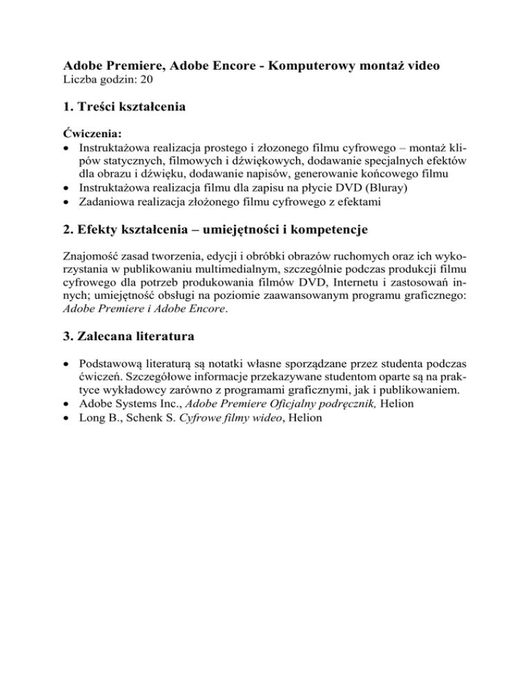 Adobe Premiere, Adobe Encore - Komputerowy montaż video Liczba godzin: 20 1. Treści kształcenia Ćwiczenia: • Instruktażowa realizacja prostego i złozonego filmu cyfrowego – montaż klipów statycznych, filmowych i dźwiękowych, dodawanie specjalnych efektów dla obrazu i dźwięku, dodawanie napisów, generowanie końcowego filmu • Instruktażowa realizacja filmu dla zapisu na płycie DVD (Bluray) • Zadaniowa realizacja złożonego filmu cyfrowego z efektami 2. Efekty kształcenia – umiejętności i kompetencje Znajomość zasad tworzenia, edycji i obróbki obrazów ruchomych oraz ich wykorzystania w publikowaniu multimedialnym, szczególnie podczas produkcji filmu cyfrowego dla potrzeb produkowania filmów DVD, Internetu i zastosowań innych; umiejętność obsługi na poziomie zaawansowanym programu graficznego: Adobe Premiere i Adobe Encore. 3. Zalecana literatura • Podstawową literaturą są notatki własne sporządzane przez studenta podczas ćwiczeń. Szczegółowe informacje przekazywane studentom oparte są na praktyce wykładowcy zarówno z programami graficznymi, jak i publikowaniem. • Adobe Systems Inc., Adobe Premiere Oficjalny podręcznik, Helion • Long B., Schenk S. Cyfrowe filmy wideo, Helion