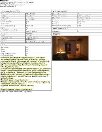 ABC HOUSE MARSZAŁKOWSKA 115/218, 01-102 Warszawa tel.600 888 674 fax. e-mail:[email protected] www.abc-house.com.pl Informacje ogólne Nieruchomość Oferta nr ABH-MS-124 Standard 5 Rodzaj sprzedaż Rodzaj mieszkania jednopoziomowe Lokalizacja Warszawa Stan lokalu do wprowadzenia Dzielnica Śródmieście Okna nowe drewniane Rodzaj budynku blok Instalacje wymienione Ilość pokoi 1 Balkon brak Pow. całkowita [m2] 60.00 m² Powierzchnia działki [m2] 0.00 Piętro 4p Ilość pięter w budynku 4 Cena 599000.00 PLN Cena/m2 9983.33 Status aktualna Imię i nazwisko Wojciech Filipecki Telefon 600 888 674 E-mail [email protected] Opis Plac zabaw nie Alarm nie Winda nie Drzwi antywłamaniowe nie Ilość kondygnacji 4 Na sprzedaż mieszkanie po generalnym remoncie w centrum Warszawy (ul.E.Plater/Świętokrzyska/Twarda) na 4 piętrze w budynku z lat 50-tych z cegły (budynek 4 piętrowy ze strychem), 2 pokoje, kuchnia, łazienka+wc. Własność hipoteczna. Kuchnia całkowicie wyposażona. W pokojach szafa Komandor, skórzana sofa, stół, krzesła, łóżko. W mieszkaniu wymienione są piony wodno-kanalizacyjne, drewniany parkiet, żaluzje zewnętrzne i wewnętrzne, drzwi antywłamaniowe Gerda, klimatyzacja. Okna wychodzą na południowy-wschód i południowy-zachód. Bardzo dobra lokalizacja: blisko Pałacu Kultury, Dworca Centralnego, 4 min.do linii metra, w pobliżu kina, teatry, kawiarnie, sklepy. Mieszkanie gotowe do zamieszkania. Miesięczny czynsz wynosi 600 zł. Na klatce schodowej znajdują się 3 mieszkania. Spokojni sąsiedzi. W planach budowa windy (zebrane fundusze). Zapraszam idealne na biuro, na inwestycje. © Wszelkie prawa zastrzeżone - ABC House Pomieszczenia Ilość pokoi Zdjęcia 1
