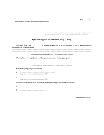 ...................................................................................... .............................., dnia ............. r. (imię i nazwisko oraz adres zamieszkania poszkodowanego) ......................................................................................................... ......................................................................................................... ......................................................................................................... (oznaczenie pracodawcy lub innej osoby działającej w imieniu pracodawcy) Zgłoszenie wypadku w drodze do pracy (z pracy) Informuję, że w dniu ....................... r. uległem wypadkowi w drodze do pracy (z pracy), który nastąpił w następujących okolicznościach: ..................................................................................................................................................................................... ..................................................................................................................................................................................... ..................................................................................................................................................................................... (opisać szczegółowo przebieg zdarzenia z jego umiejscowieniem i czasem) W związku z w/w wypadkiem zostałem poszkodowany w następujący sposób: ..................................................................................................................................................................................... ..................................................................................................................................................................................... ..................................................................................................................................................................................... (scharakteryzować następstwa wypadku - rodzaj uszkodzeń organizmu) Świadkami powyższego wypadku są: 1. ................................................................................. (imię i nazwisko, adres zamieszkania, stanowisko) 2. ................................................................................ (imię i nazwisko, adres zamieszkania, stanowisko) Potwierdzeniem zaistniałych uszkodzeń ciała są następujące dokumenty medyczne: 1. ............................................................. 2. ............................................................. ............................................ (podpis poszkodowanego)