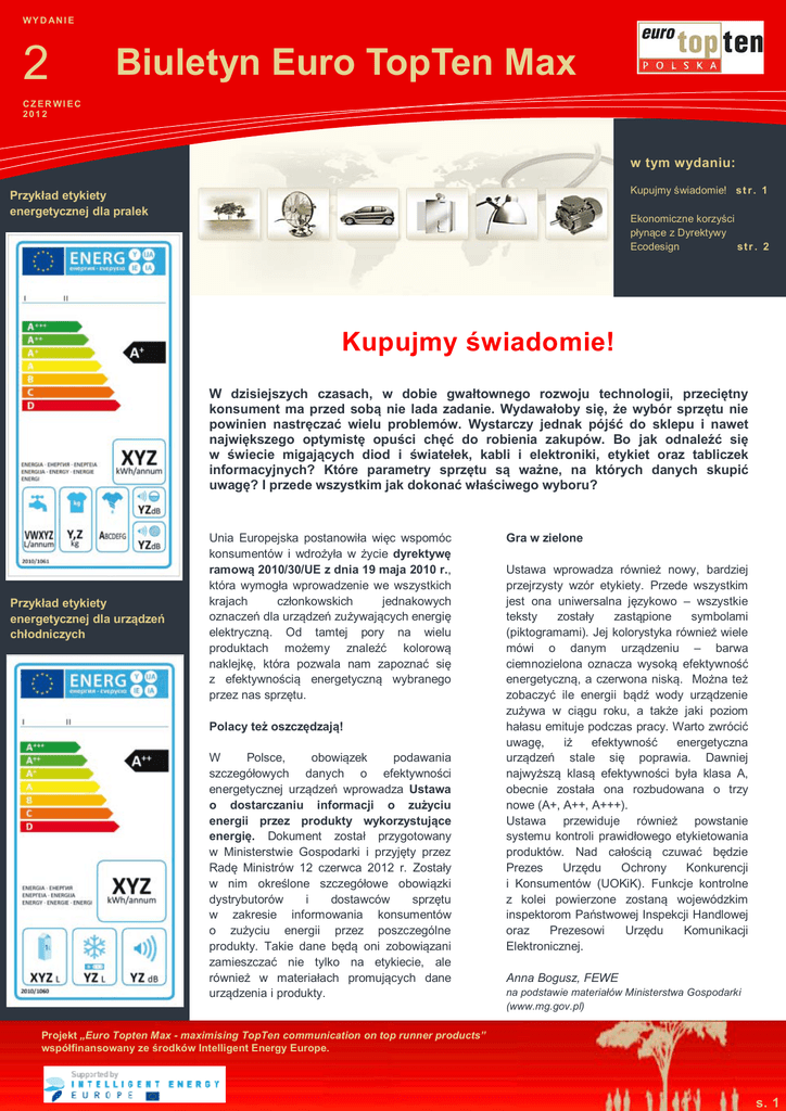 WY D AN I E 2 Biuletyn Euro TopTen Max CZER WI EC 2012 w tym wydaniu: Kupujmy świadomie! s t r . 1 Przykład etykiety energetycznej dla pralek Ekonomiczne korzyści płynące z Dyrektywy Ecodesign str . 2 Kupujmy świadomie! W dzisiejszych czasach, w dobie gwałtownego rozwoju technologii, przeciętny konsument ma przed sobą nie lada zadanie. Wydawałoby się, że wybór sprzętu nie powinien nastręczać wielu problemów. Wystarczy jednak pójść do sklepu i nawet największego optymistę opuści chęć do robienia zakupów. Bo jak odnaleźć się w świecie migających diod i światełek, kabli i elektroniki, etykiet oraz tabliczek informacyjnych? Które parametry sprzętu są ważne, na których danych skupić uwagę? I przede wszystkim jak dokonać właściwego wyboru? Przykład etykiety energetycznej dla urządzeń chłodniczych Unia Europejska postanowiła więc wspomóc konsumentów i wdrożyła w życie dyrektywę ramową 2010/30/UE z dnia 19 maja 2010 r., która wymogła wprowadzenie we wszystkich krajach członkowskich jednakowych oznaczeń dla urządzeń zużywających energię elektryczną. Od tamtej pory na wielu produktach możemy znaleźć kolorową naklejkę, która pozwala nam zapoznać się z efektywnością energetyczną wybranego przez nas sprzętu. Polacy też oszczędzają! W Polsce, obowiązek podawania szczegółowych danych o efektywności energetycznej urządzeń wprowadza Ustawa o dostarczaniu informacji o zużyciu energii przez produkty wykorzystujące energię. Dokument został przygotowany w Ministerstwie Gospodarki i przyjęty przez Radę Ministrów 12 czerwca 2012 r. Zostały w nim określone szczegółowe obowiązki dystrybutorów i dostawców sprzętu w zakresie informowania konsumentów o zużyciu energii przez poszczególne produkty. Takie dane będą oni zobowiązani zamieszczać nie tylko na etykiecie, ale również w materiałach promujących dane urządzenia i produkty. Gra w zielone Ustawa wprowadza również nowy, bardziej przejrzysty wzór etykiety. Przede wszystkim jest ona uniwersalna językowo – wszystkie teksty zostały zastąpione symbolami (piktogramami). Jej kolorystyka również wiele mówi o danym urządzeniu – barwa ciemnozielona oznacza wysoką efektywność energetyczną, a czerwona niską. Można też zobaczyć ile energii bądź wody urządzenie zużywa w ciągu roku, a także jaki poziom hałasu emituje podczas pracy. Warto zwrócić uwagę, iż efektywność energetyczna urządzeń stale się poprawia. Dawniej najwyższą klasą efektywności była klasa A, obecnie została ona rozbudowana o trzy nowe (A+, A++, A+++). Ustawa przewiduje również powstanie systemu kontroli prawidłowego etykietowania produktów. Nad całością czuwać będzie Prezes Urzędu Ochrony Konkurencji i Konsumentów (UOKiK). Funkcje kontrolne z kolei powierzone zostaną wojewódzkim inspektorom Państwowej Inspekcji Handlowej oraz Prezesowi Urzędu Komunikacji Elektronicznej. Anna Bogusz, FEWE na podstawie materiałów Ministerstwa Gospodarki (www.mg.gov.pl) Projekt „Euro Topten Max - maximising TopTen communication on top runner products” współfinansowany ze środków Intelligent Energy Europe. s. 1 TELEWIZORY Z KLASĄ Wszystkie nowe telewizory wprowadzone na rynek po 30 listopada 2011 r. muszą mieć etykietę energetyczną. Taki wymóg wprowadziło unijne Rozporządzenie 1062/2010 uzupełniające Dyrektywę ramową 2010/30/UE. Etykieta obowiązuje dopiero 6 miesięcy, a jej wpływ na transformacje rynku telewizorów jest ogromny i był obserwowany już przed obowiązkiem jej stosowania. Już 2 lata temu, na rynku zaczęły pojawiać się bowiem telewizory z klasy energetycznej A, obecnie dostępne są już pierwsze odbiorniki w klasie A++! Oznacza to, iż zużycie energii w tej kategorii produktów, zostało zmniejszone prawie dwukrotnie w ciągu zaledwie 2 lat (ze współczynnika efektywności energetycznej EEI wynoszącego 0,3 do EEI równego 0,16). Przykład ten pokazuje, że wprowadzona przez UE etykieta energetyczna jest bardzo skutecznym narzędziem przyspieszającym transformację rynku w kierunku bardziej efektywnych energetycznie produktów. Więcej informacji: www.topten.eu; www.topten.info.pl WYDAWCA: Fundacja na rzecz Efektywnego Wykorzystania Energii ul. Rymera 3/4; 40-048 Katowice tel./fax.+48 32 203 51 14 e-mail: [email protected] Kierownik projektu: Anna Bogusz e-mail: [email protected] www.topten.info.pl Ekonomiczne korzyści płynące z Dyrektywy Ecodesign Dyrektywa Ecodesign jest jednym z najskuteczniejszych narzędzi Unii Europejskiej, mających tak duży wpływ na oszczędności zarówno kosztów, jak i energii. Dzięki temu zwiększa się bezpieczeństwo dostaw energii, tworzone są nowe miejsca pracy, a także wspomagane jest osiągnięcie średnio-i długoterminowych celów realizacji pakietu energetyczno-klimatycznego. W raporcie ECOFYS „Ekonomiczne korzyści wdrażania Dyrektywy Ecodesign” czytamy, iż prawidłowe stosowanie dyrektywy przyniesie do 2020 r. roczne oszczędności energii na poziomie 600 TWh energii elektrycznej oraz 600 TWh ciepła, co przekłada się odpowiednio na 17% zużycia energii elektrycznej i 10% zużycia energii cieplnej ogółem w UE. To z kolei równa się mniejszej emisji CO2 o 400 Mton rocznie do 2020 r. Czym jest Dyrektywa Ecodesign? Dyrektywa 2009/125/WE z dnia 21 października 2009 r. ustanawiającą ogólne zasady ustalania wymogów dotyczących ekoprojektu dla produktów związanych z energią (tzw. Dyrektywa Ecodesign) ma na celu zmniejszenie wpływu różnych produktów na środowisko, z naciskiem na ich zużycie energii. Zrównoważony rozwój wymaga bowiem należytego uwzględnienia wpływu zdrowotnego, społecznego i ekonomicznego. Poprawa efektywności energetycznej produktów i efektywności wykorzystania zasobów przyczynia się także do bezpieczeństwa dostaw energii i zmniejszenia zapotrzebowania na zasoby naturalne, co stanowi warunki konieczne zdrowej gospodarki,