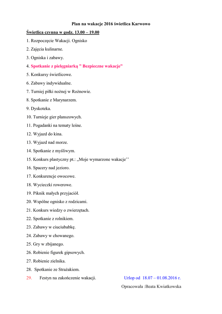 Plan na wakacje 2016 świetlica Karwowo Świetlica czynna w godz. 13.00 – 19.00 1. Rozpoczęcie Wakacji. Ognisko 2. Zajęcia kulinarne. 3. Ogniska i zabawy. 4. Spotkanie z pielęgniarką ” Bezpieczne wakacje” 5. Konkursy świetlicowe. 6. Zabawy indywidualne. 7. Turniej piłki nożnej w Rożnowie. 8. Spotkanie z Marynarzem. 9. Dyskoteka. 10. Turnieje gier planszowych. 11. Pogadanki na tematy leśne. 12. Wyjazd do kina. 13. Wyjazd nad morze. 14. Spotkanie z myśliwym. 15. Konkurs plastyczny pt.: „Moje wymarzone wakacje’’ 16. Spacery nad jezioro. 17. Konkurencje owocowe. 18. Wycieczki rowerowe. 19. Piknik małych przyjaciół. 20. Wspólne ognisko z rodzicami. 21. Konkurs wiedzy o zwierzętach. 22. Spotkanie z rolnikiem. 23. Zabawy w ciuciubabkę. 24. Zabawy w chowanego. 25. Gry w zbijanego. 26. Robienie figurek gipsowych. 27. Robienie zielnika. 28. Spotkanie ze Strażakiem. 29. Festyn na zakończenie wakacji. Urlop od 18.07 – 01.08.2016 r. Opracowała :Beata Kwiatkowska