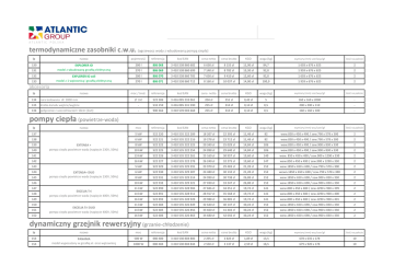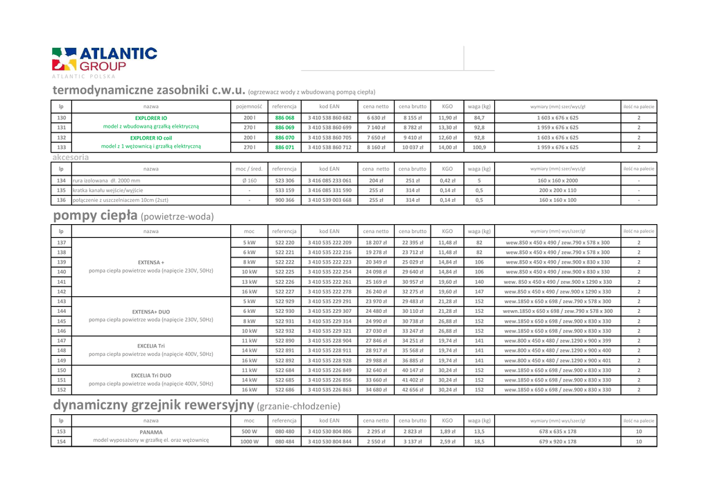1,23 ATLANTIC POLSKA termodynamiczne zasobniki c.w.u. (ogrzewacz wody z wbudowaną pompą ciepła) lp nazwa pojemność referencja kod EAN cena netto cena brutto KGO waga (kg) wymiary (mm) szer/wys/gł ilość na palecie 130 EXPLORER IO model z wbudowaną grzałką elektryczną 200 l 886 068 3 410 538 860 682 6 630 zł 8 155 zł 11,90 zł 84,7 1 603 x 676 x 625 2 270 l 886 069 3 410 538 860 699 7 140 zł 8 782 zł 13,30 zł 92,8 1 959 x 676 x 625 2 EXPLORER IO coil model z 1 wężownicą i grzałką elektryczną 200 l 886 070 3 410 538 860 705 7 650 zł 9 410 zł 12,60 zł 92,8 1 603 x 676 x 625 2 270 l 886 071 3 410 538 860 712 8 160 zł 10 037 zł 14,00 zł 100,9 1 959 x 676 x 625 2 nazwa moc / śred. referencja kod EAN cena netto cena brutto KGO waga (kg) wymiary (mm) szer/wys/gł ilość na palecie 131 132 133 akcesoria lp 134 rura izolowana dł. 2000 mm Ø 160 523 306 3 416 085 233 061 204 zł 251 zł 0,42 zł 5 160 x 160 x 2000 - 135 kratka kanału wejście/wyjście - 533 159 3 416 085 331 590 255 zł 314 zł 0,14 zł 0,5 200 x 200 x 110 - 136 połączenie z uszczelniaczem 10cm (2szt) - 900 366 3 410 539 003 668 255 zł 314 zł 0,14 zł 0,5 160 x 160 x 100 - moc referencja kod EAN cena netto cena brutto KGO waga (kg) wymiary (mm) wys/szer/gł ilość na palecie 137 5 kW 522 220 3 410 535 222 209 18 207 zł 22 395 zł 11,48 zł 82 wew.850 x 450 x 490 / zew.790 x 578 x 300 2 138 6 kW 522 221 3 410 535 222 216 19 278 zł 23 712 zł 11,48 zł 82 wew.850 x 450 x 490 / zew.790 x 578 x 300 2 8 kW 522 222 3 410 535 222 223 20 349 zł 25 029 zł 14,84 zł 106 wew.850 x 450 x 490 / zew.900 x 830 x 330 2 10 kW 522 225 3 410 535 222 254 24 098 zł 29 640 zł 14,84 zł 106 wew.850 x 450 x 490 / zew.900 x 830 x 330 2 141 13 kW 522 226 3 410 535 222 261 25 169 zł 30 957 zł 19,60 zł 140 wew. 850 x 450 x 490 / zew.900 x 1290 x 330 2 142 16 kW 522 227 3 410 535 222 278 26 240 zł 32 275 zł 19,60 zł 147 wew.850 x 450 x 490 / zew.900 x 1290 x 330 2 143 5 kW 522 929 3 410 535 229 291 23 970 zł 29 483 zł 21,28 zł 152 wew.1850 x 650 x 698 / zew.790 x 578 x 300 2 6 kW 522 930 3 410 535 229 307 24 480 zł 30 110 zł 21,28 zł 152 wewn.1850 x 650 x 698 / zew.790 x 578 x 300 2 8 kW 522 931 3 410 535 229 314 24 990 zł 30 738 zł 26,88 zł 152 wew.1850 x 650 x 698 / zew.900 x 830 x 330 2 146 10 kW 522 932 3 410 535 229 321 27 030 zł 33 247 zł 26,88 zł 152 wew.1850 x 650 x 698 / zew.900 x 830 x 330 2 147 11 kW 522 890 3 410 535 228 904 27 846 zł 34 251 zł 19,74 zł 141 wew.800 x 450 x 480 / zew.1290 x 900 x 399 2 14 kW 522 891 3 410 535 228 911 28 917 zł 35 568 zł 19,74 zł 141 wew.800 x 450 x 480 / zew.1290 x 900 x 400 2 149 16 kW 522 892 3 410 535 228 928 29 988 zł 36 885 zł 19,74 zł 141 wew.800 x 450 x 480 / zew.1290 x 900 x 401 2 150 11 kW 522 684 3 410 535 226 849 32 640 zł 40 147 zł 30,24 zł 152 wew.1850 x 650 x 698 / zew.900 x 830 x 330 2 14 kW 522 685 3 410 535 226 856 33 660 zł 41 402 zł 30,24 zł 152 wew.1850 x 650 x 698 / zew.900 x 830 x 330 2 16 kW 522 686 3 410 535 226 863 34 680 zł 42 656 zł 30,24 zł 152 wew.1850 x 650 x 698 / zew.900 x 830 x 330 2 pompy ciepła (powietrze-woda) lp 139 140 144 145 148 151 nazwa EXTENSA + pompa ciepła powietrze woda (napięcie 230V, 50Hz) EXTENSA+ DUO pompa ciepła powietrze woda (napięcie 230V, 50Hz) EXCELIA Tri pompa ciepła powietrze woda (napięcie 400V, 50Hz) EXCELIA Tri DUO pompa ciepła powietrze woda (napięcie 400V, 50Hz) 152 dynamiczny grzejnik rewersyjny (grzanie-chłodzenie) lp nazwa moc referencja kod EAN cena netto cena brutto KGO waga (kg) wymiary (mm) wys/szer/gł ilość na palecie 153 PANAMA model wyposażony w grzałkę el. oraz wężownicę 500 W 080 480 3 410 530 804 806 2 295 zł 2 823 zł 1,89 zł 13,5 678 x 635 x 178 10 1000 W 080 484 3 410 530 804 844 2 550 zł 3 137 zł 2,59 zł 18,5 679 x 920 x 178 10 154 akcesoria lp nazwa moc / poj. referencja kod EAN cena netto cena brutto KGO waga (kg) wymiary (mm) wys/szer/gł ilość na palecie 163 programator T55 - 073 951 3 410 530 739 511 408 zł 502 zł 0,14 zł 0,5 - - 164 programator T75 - 073 954 3 410 530 739 542 714 zł 878 zł 0,14 zł 0,5 - - 165 programator T78 (radio) - 074 061 3 410 530 740 616 1 020 zł 1 255 zł 0,14 zł 0,5 - - 166 zasobnik c.w.u. PECS PAC 300 L z 1 wężownicą 3,4 m2 300 l 027 992 3 410 530 279 925 5 610 zł 6 900 zł 23,52 zł 68 1627 x 550 x 650 1 167 zestaw do podł. zasobnika c.w.u. - 073 991 3 116 370 739 505 612 zł 753 zł 0,14 zł 4 - - 168 zestaw do podł. 2 obiegów grzewczych c.o. - 570 630 3 410 535 706 303 3 825 zł 4 705 zł 0,70 zł 20 - - 169 zestaw do podł. 2 obiegów grzewczych c.o. (DUO) - 570 629 3 410 535 706 297 2 550 zł 3 137 zł 0,70 zł 20 - - 170 zestaw sterowania 2 obiegiem grzewczym (elektr.**) - 075 311 3 410 530 753 111 408 zł 502 zł 0,14 zł 0,5 - - 171 pompa obiegowa dużej wydajności - 074 067 3 410 530 740 678 2 550 zł 3 137 zł 0,70 zł 4 - - 172 zestaw do podłączenia kotła - 073 989 3 410 530 739 894 714 zł 878 zł 0,14 zł 3 - - 173 zestaw do podłączenia kotła (DUO) - 073 990 3 410 530 740 111 867 zł 1 066 zł 0,70 zł 10 - - 174 sprzęgło hydrauliczne - 073 957 3 116 370 739 574 1 785 zł 2 196 zł 0,70 zł 10 - - 175 zestaw do podłączenia opcji chłodzenia - 075 312 3 410 530 753 128 306 zł 376 zł 0,14 zł 0,5 - - 176 zestaw do podłączenia basenu - 570 631 3 410 535 706 310 765 zł 941 zł 0,28 zł 0,5 - - 177 wymiennika basenowy SP PAC - 570615 3 410 535 706 150 13 770 zł 16 937 zł 1,40 zł 20 - - 178 zestaw grzałek elektr. 2x3000W/230V (Extensa) - 073 985 3 410 535 739 856 918 zł 1 129 zł 0,42 zł 4 - - 179 zestaw grzałek elektr. 3x3000W/4000V (Excelia) - 073 987 3 410 530 739 870 1 122 zł 1 380 zł 0,42 zł 4 - - 180 zestaw podkładek antywibracyjnych - 523 574 3 416 085 235 744 204 zł 251 zł 0,14 zł 0,5 - - 181 stelaż montażowy podłogowy - 809 532 3 416 088 095 321 179 zł 220 zł 0,42 zł 1 - - 182 stelaż montażowy naścienny - 809 550 3 416 088 095 505 255