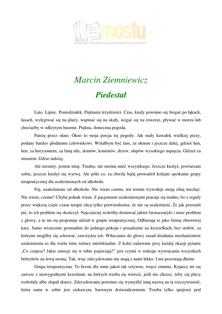Marcin Ziemniewicz Piedestał Lato. Lipiec. Poniedziałek. Piętnasta trzydzieści. Czas, kiedy powinno się biegać po łąkach, lasach, wylegiwać się na plaży, wspinać się na skały, ścigać się na rowerze, pływać w morzu lub chociażby w odkrytym basenie. Piękna, słoneczna pogoda. Patrzę przez okno. Okno to moja porcja tej pogody. Jak mały kawałek wielkiej pizzy, podany bardzo głodnemu człowiekowi. Wolałbym być tam, za oknem i jeszcze dalej, gdzieś hen, hen, za horyzontem, za linią ulic, domów, kominów, drzew, słupów wysokiego napięcia. Gdzieś za miastem. Gdzie indziej. Ale niestety, jestem tutaj. Trudno, nie można mieć wszystkiego. Jeszcze kiedyś, powtarzam sobie, jeszcze kiedyś się wyrwę. Ale póki co, za chwilę będę prowadził kolejne spotkanie grupy terapeutycznej dla uzależnionych od alkoholu. Fuj, uzależnienie od alkoholu. Nie wiem czemu, ten termin wywołuje moją silną niechęć. Nie wiem, czemu? Chyba jednak wiem. Z pacjentami uzależnionymi pracuje się trudno, bo z reguły przez większą część czasu terapii chcą tylko potwierdzenia, że nie są uzależnieni. Że jak przestali pić, to ich problem się skończył. Najczęściej woleliby dostawać jakieś farmaceutyki i mieć problem z głowy, a tu im się proponuje udział w grupie terapeutycznej. Odbierają to jako formę zbiorowej kary. Samo wrzucenie gromadnie do jednego pokoju i posadzenie na krzesełkach, bez stołów, za którymi mogliby się schować, zawstydza ich. Wtłaczanie do głowy zasad działania mechanizmów uzależnienia to dla wielu istne tortury intelektualne. Z kolei zadawane przy każdej okazji pytanie „Co czujesz? Jakie emocje się w tobie pojawiają?” jest czymś w rodzaju wywracania wszystkich bebechów na lewą stronę. Tak, więc zdecydowanie nie mają z nami lekko. I nie pozostają dłużni. Grupa terapeutyczna. To brzmi dla mnie jakoś tak sztywno, wręcz smutno. Kojarzy mi się zawsze z niewygodnymi krzesłami, na których trzeba się wiercić, jeśli nie chcesz, żeby cię plecy rozbolały albo złapał skurcz. Zdecydowanie powinno się wymyślić inną nazwę na tę rzeczywistość, która sama w sobie jest ciekawym, barwnym doświadczeniem. Trzeba tylko spojrzeć pod odpowiednim kątem. Mówiąc patetycznie, trzeba wznieść się ponad poziom niewygodnych krzesełek, różowych ścian i paskudnych plansz edukacyjnych. Za chwilę zacznę. Grupa już czeka na korytarzu, pędząc swoje „drugie życie”, czyli radośnie wymieniając się informacjami, uwagami i spostrzeżeniami, którymi nigdy nie podzielą się na „oficjalnym” spotkaniu. Grupa terapeutyczna jest pewną odmianą teatru, myślę. Uczestnicy grają swoje role tym lepiej, im bardziej terapeuta sprawdza się w roli reżysera. Gorzej, jeżeli jest raczej suflerem. Najgorzej, jeżeli uparcie pełni rolę widza, samotnie i w dodatku przymusowo posadzonego na widowni. Takie sytuacje zdarzają się na szczęście rzadko, ale jednak mają miejsce. Na przykład wtedy, gdy terapeuta prowadzący zachorował albo pojechał na urlop i zapomniał o grupie. Wtedy spotkanie przeprowadza stażystka albo koleżanka, która zbyt dosłownie realizuje slogan o „podążaniu za klientem”. Albo po prostu przeprowadza coś w rodzaju „pogadanki o”. Jakiś czas trzeba potem doprowadzać sytuację do porządku i przywracać uczestnikom świadomość ich roli w tym spektaklu. Odbudowywać ich poczucie bezpieczeństwa. Bo że je stracili, to pewne: z euforią opowiadają, że było super, bo można było swobodnie podyskutować. Tak w ogóle, o życiu. A pan lub pani „stała prowadząca” na to nie pozwala, no i czemu? Z reguły poczucie bezpieczeństwa i świadomość roli zostaje przywrócona przez cierpliwe, metodyczne dopytywanie się, jakie konkretnie korzyści uczestnicy grupy uzyskali z tej swobodnej dyskusji lub co konkretnie zapamiętali z „pogadanki”. Najczęściej wtedy euforia przechodzi, wraca zdrowa, twórcza frustracja i można dalej pracować. Moja grupa miała ostatnio zastępstwo, ale przeprowadzone przez osobę kompetentną (może dlatego, że zupełnie z zewnątrz), co mogłem poznać po wciąż tym samym wyrazie twarzy moich kochanych grupowiczów, obrazującym swoistą mieszankę znudzenia, bólu głowy (to przeze mnie) i pleców (od krzesełek) oraz po braku jakichkolwiek oznak buntu. Zatem mogę spokojnie dalej przerabiać program – myślę. Moja grupa jest grupą „terapeutyczną” o tyle, o ile stanowi integralną część programu terapii uzależnienia, według którego pracujemy. Natomiast pod względem formy, jest raczej grupą edukacyjną – moim zadaniem jest przybliżyć kochanym grupowiczom zawiłą problematykę destrukcji związanej z uzależnieniem alkoholowym, kawałek po kawałku. A także umożliwić im odnalezienie przejawów tej destrukcji u siebie. Ciężka orka. Jeżeli alkoholik po kilku miesiącach abstynencji czegoś chce, to na pewno nie szukania dowodów na to, że jest po prostu osobą chorą. Wręcz przeciwnie, chce uchodzić za osobę wyleczoną. Osobę, której problem się skończył. To normalna, ludzka tendencja do poprzestawania na dążeniu do tego, żeby raczej nie bolało i dobrze wyglądało, niż naprawdę wyzdrowiało. Zresztą, chyba nas, terapeutów dotyczy to w 2 jeszcze większym stopniu. Przecież musimy wyglądać na zdrowych i szczęśliwych, a czasami jesteśmy na tyle chorzy, że powinniśmy się po prostu leczyć, bo powierzenie nam jakiegokolwiek innego zajęcia i tak byłoby niebezpieczne dla otoczenia. Pytanie tylko, jaki rodzaj leczenia byłby skuteczny dla terapeuty, który chce wyglądać na zdrowego? Zresztą, nieważne. Przede mną spotkanie grupy. Prolog spektaklu – tak zwana Rundka Wstępna. Obrzęd uświęcony wieloletnim odprawianiem na tysiącach spotkań tysięcy grup w tym kraju. Rundka Wstępna polega na podawaniu kolejno przez członków grupy informacji o emocjach, z jakimi przychodzą na spotkanie 