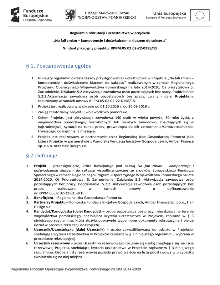 Regulamin rekrutacji i uczestnictwa w projekcie „Na fali zmian – kompetencje i doświadczenie kluczem do sukcesu” Nr identyfikacyjny projektu: RPPM.05.02.02-22-0158/15 § 1. Postanowienia ogólne 1. Niniejszy regulamin określa zasady przystępowania i uczestnictwa w Projekcie „Na fali zmian – kompetencje i doświadczenie kluczem do sukcesu” realizowanym w ramach Regionalnego Programu Operacyjnego Województwa Pomorskiego na lata 2014-2020, Oś priorytetowa 5. Zatrudnienie, Działanie 5.2 Aktywizacja zawodowa osób pozostających bez pracy, Poddziałanie 5.2.2.Aktywizacja zawodowa osób pozostających bez pracy, zwanym dalej Projektem, realizowany w ramach umowy RPPM.05.02.02-22-0158/15. 2. Projekt jest realizowany w okresie od 01.10.2016 r. do 30.09.2018 r. 3. Zasięg terytorialny projektu: województwo pomorskie. 4. Celem Projektu jest aktywizacja zawodowa 140 osób w wieku powyżej 30 roku życia, z województwa pomorskiego, bezrobotnych lub biernych zawodowo, znajdujących się w najtrudniejszej sytuacji na runku pracy, prowadząca do ich zatrudnienia/samozatrudnienia, trwającego co najmniej 3 miesiące. 5. Projekt jest realizowany w partnerstwie przez Regionalną Izbę Gospodarczą Pomorza jako Lidera Projektu w partnerstwie z Pomorską Fundacją Inicjatyw Gospodarczych, Amber Finance Sp. z o.o. oraz Hair Design s.c. § 2 Definicje 1. 2. 3. 4. 5. 6. Projekt – przedsięwzięcie, które funkcjonuje pod nazwą Na fali zmian – kompetencje i doświadczenie kluczem do sukcesu współfinansowane ze środków Europejskiego Funduszu Społecznego w ramach Regionalnego Programu Operacyjnego Województwa Pomorskiego na lata 2014-2020, Oś Priorytetowa: 5. Zatrudnienie, Działanie: 5.2. Aktywizacja zawodowa osób pozostających bez pracy, Poddziałanie: 5.2.2. Aktywizacja zawodowa osób pozostających bez pracy, realizowane w ramach umowy o dofinansowanie nr RPPM.05.02.02-22-0158/15. Beneficjent - Regionalna Izba Gospodarcza Pomorza. Partnerzy Projektu – Pomorska Fundacja Inicjatyw Gospodarczych, Amber Finance Sp. z o.o., Hair Design s.c Kandydat/Kandydatka (dalej Kandydat) – osoba pozostająca bez pracy, mieszkająca na terenie województwa pomorskiego, spełniająca kryteria uczestnictwa w Projekcie, zapisane w § 3 niniejszego regulaminu, która złożyła poprawnie wypełnione dokumenty rekrutacyjne i bierze udział w procesie rekrutacji do Projektu. Uczestnik/Uczestniczka (dalej Uczestnik) – osoba zakwalifikowana do udziału w Projekcie, spełniająca kryteria Uczestnictwa w Projekcie zapisane w § 3 niniejszego regulaminu, wybrana w procedurze rekrutacyjnej. Uczestnik rezerwowy – przez Uczestnika rezerwowego rozumie się osobę znajdującą się na liście rezerwowej Projektu, spełniającą kryteria uczestnictwa w Projekcie zapisane w § 3 niniejszego regulaminu. Osoba z listy rezerwowej posiada prawo wejścia na listę podstawową w przypadku zwolnienia się na niej miejsca. 7. 8. Instytucja Zarządzająca – Województwo Pomorskie. Biuro Projektu - miejsce, w którym można składać dokumenty rekrutacyjne, przechowywana jest dokumentacja Projektu oraz umożliwiony jest kontakt Uczestników z personelem Projektu. Adres Biura Projektu: Regionalna Izba Gospodarcza Pomorza Olivia Business Centre, budynek Olivia Six, piętro 13, lokal nr 2 al. Grunwaldzka 472D, 80-309 Gdańsk 9. Biuro rekrutacji - miejsce, w którym można składać dokumenty rekrutacyjne, przechowywana jest dokumentacja rekrutacyjna Projektu oraz umożliwiony jest kontakt Uczestników z personelem Projektu. Adres Biura rekrutacji: Amber Finance Sp. z o.o. ul. 3 Maja 67/69, piętro I, lokal nr 2 81-850 Sopot 10. Dokumenty rekrutacyjne - formularz zgłoszeniowy wraz z oświadczeniami 11. Formularz zgłoszeniowy – dokument, w oparciu o który prowadzony jest proces rekrutacji Uczestników do Projektu. 12. Osoba bezrobotna – osoba pozostająca bez pracy, gotowa do podjęcia pracy i aktywnie poszukująca zatrudnienia. Definicja uwzględnia osoby zarejestrowane jako bezrobotne zgodnie z krajowymi definicjami, nawet jeżeli nie spełniają one wszystkich trzech kryteriów. Definicja uwzględnia zarówno osoby bezrobotne w rozumieniu badania aktywności ekonomicznej ludności (BAEL) jak i osoby zarejestrowane jako bezrobotne. Definicja nie uwzględnia studentów studiów stacjonarnych, nawet jeśli spełniają powyższe kryteria. Status na rynku pracy określany jest w dniu rozpoczęcia uczestnictwa w Projekcie. 13. Osoba długotrwale bezrobotna - osoba bezrobotna definiowana jak wyżej. Dorośli (30 lat lub więcej) – osoby bezrobotne nieprzerwanie przez okres ponad 12 miesięcy (> 12 miesięcy). 14. Osoba bierna zawodowo - to osoba, która w danej chwili nie tworzy zasobów siły roboczej (tzn. nie pracuje i nie jest bezrobotna). Status na rynku pracy określany jest w dniu rozpoczęcia uczestnictwa w Projekcie. 15. Osoba pozostająca bez pracy – obejmuje kategorię osób bezrobotnych zarejestrowanych (w tym długotrwale bezrobotnych) lub niezarejestrowanych w urzędach pracy oraz osób biernych zawodowo (w tym uczących się). 16. Osoba o niskich kwalifikacjach - osoba posiadająca wykształcenie do poziomu ISCED 3 włącznie, zgodnie z Międzynarodową Standardową Klasyfikacją Kształcenia (ISCED 2011) zaaprobowaną przez Konferencję Ogólną UNESCO (wykształcenie maksymalnie ponadgimnazjalne). Osoba przystępująca do Projektu wykazuje najwyższy ukończony poziom ISCED. 17. Oświadczenie o statusie na rynku pracy – dokumenty/oświadczenia potwierdzające posiadanie statusu osoby bezrobotnej lub nieaktywnej zawodowo. 18. Lista podstawowa – lista osób zakwalifikowanych do udziału w Projekcie. 19. Lista rezerwowa – lista osób, spełniających kryteria uczestnictwa w Projekcie, które nie zostały zakwalifikowane na listę podstawową z powodu braku miejsc. 20. Deklaracja Uczestnika Projektu – dokument podpisywany przez Uczestnika z chwilą przystąpienia do Projektu. 21. Formy ws