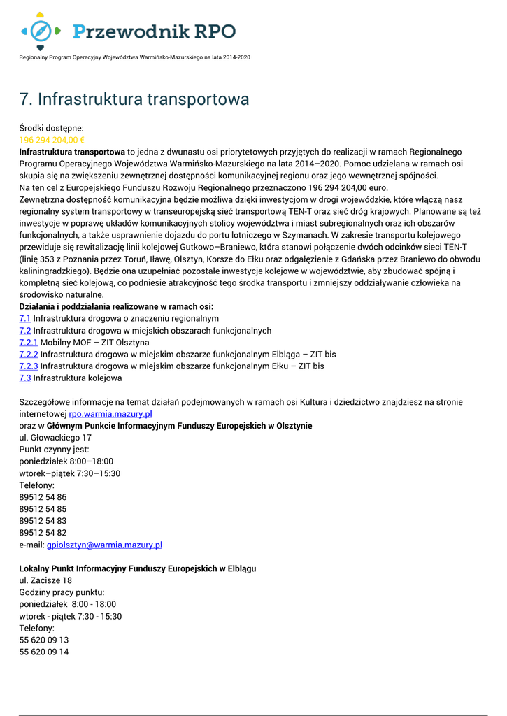 Regionalny Program Operacyjny Województwa Warmińsko-Mazurskiego na lata 2014-2020 7. Infrastruktura transportowa Środki dostępne: 196 294 204,00 € Infrastruktura transportowa to jedna z dwunastu osi priorytetowych przyjętych do realizacji w ramach Regionalnego Programu Operacyjnego Województwa Warmińsko-Mazurskiego na lata 2014–2020. Pomoc udzielana w ramach osi skupia się na zwiększeniu zewnętrznej dostępności komunikacyjnej regionu oraz jego wewnętrznej spójności. Na ten cel z Europejskiego Funduszu Rozwoju Regionalnego przeznaczono 196 294 204,00 euro. Zewnętrzna dostępność komunikacyjna będzie możliwa dzięki inwestycjom w drogi wojewódzkie, które włączą nasz regionalny system transportowy w transeuropejską sieć transportową TEN-T oraz sieć dróg krajowych. Planowane są też inwestycje w poprawę układów komunikacyjnych stolicy województwa i miast subregionalnych oraz ich obszarów funkcjonalnych, a także usprawnienie dojazdu do portu lotniczego w Szymanach. W zakresie transportu kolejowego przewiduje się rewitalizację linii kolejowej Gutkowo–Braniewo, która stanowi połączenie dwóch odcinków sieci TEN-T (linię 353 z Poznania przez Toruń, Iławę, Olsztyn, Korsze do Ełku oraz odgałęzienie z Gdańska przez Braniewo do obwodu kaliningradzkiego). Będzie ona uzupełniać pozostałe inwestycje kolejowe w województwie, aby zbudować spójną i kompletną sieć kolejową, co podniesie atrakcyjność tego środka transportu i zmniejszy oddziaływanie człowieka na środowisko naturalne. Działania i poddziałania realizowane w ramach osi: 7.1 Infrastruktura drogowa o znaczeniu regionalnym 7.2 Infrastruktura drogowa w miejskich obszarach funkcjonalnych 7.2.1 Mobilny MOF – ZIT Olsztyna 7.2.2 Infrastruktura drogowa w miejskim obszarze funkcjonalnym Elbląga – ZIT bis 7.2.3 Infrastruktura drogowa w miejskim obszarze funkcjonalnym Ełku – ZIT bis 7.3 Infrastruktura kolejowa Szczegółowe informacje na temat działań podejmowanych w ramach osi Kultura i dziedzictwo znajdziesz na stronie internetowej rpo.warmia.mazury.pl oraz w Głównym Punkcie Informacyjnym Funduszy Europejskich w Olsztynie ul. Głowackiego 17 Punkt czynny jest: poniedziałek 8:00–18:00 wtorek–piątek 7:30–15:30 Telefony: 89512 54 86 89512 54 85 89512 54 83 89512 54 82 e-mail: [email protected] Lokalny Punkt Informacyjny Funduszy Europejskich w Elblągu ul. Zacisze 18 Godziny pracy punktu: poniedziałek 8:00 - 18:00 wtorek - piątek 7:30 - 15:30 Telefony: 55 620 09 13 55 620 09 14 55 620 09 16 e-mail: [email protected] Lokalny Punkt Informacyjny Funduszy Europejskich w Ełku ul. Kajki 10 Godziny pracy punktu: poniedziałek 8:00 - 18:00 wtorek - piątek 7:30 - 15:30 Telefony: 87 734 11 09 87 734 11 10 87 610 07 77 e-mail: [email protected] Przewodnik RPO jest współfinansowany ze środków Europejskiego Funduszu Społecznego © Copyright by 2016 Warmia i Mazury | All rights Reserved