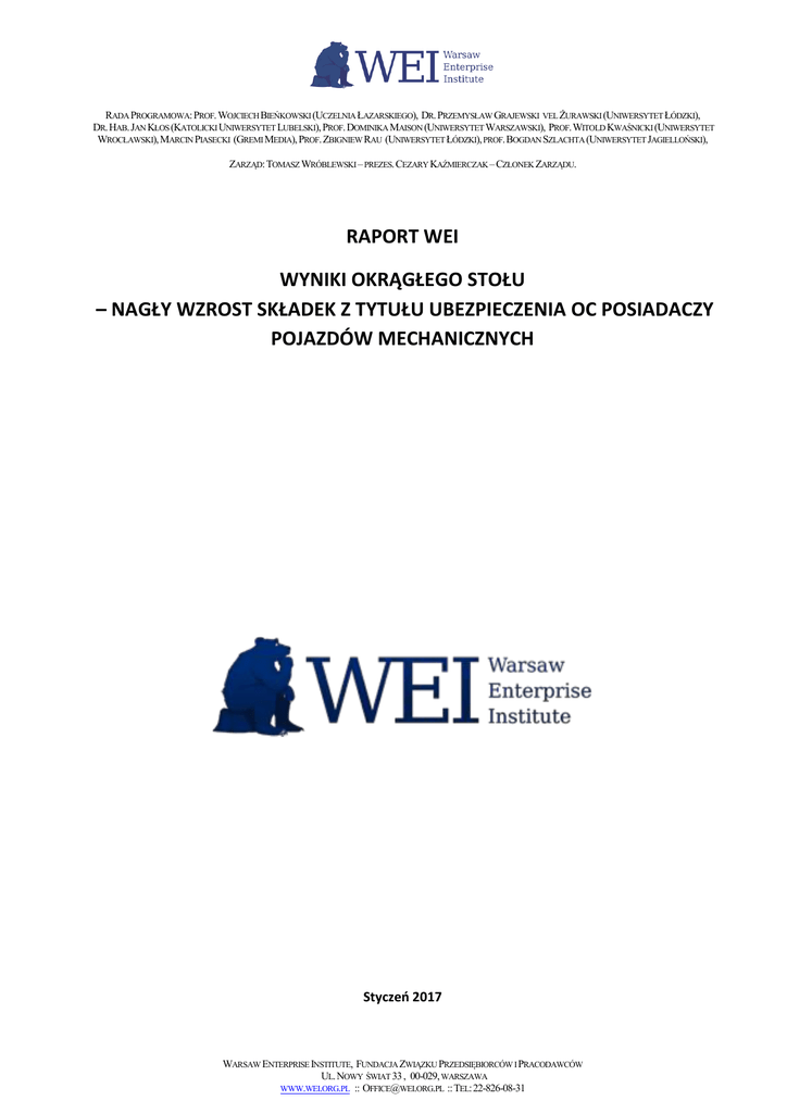 RADA PROGRAMOWA: PROF. WOJCIECH BIEŃKOWSKI (UCZELNIA ŁAZARSKIEGO), DR. PRZEMYSŁAW GRAJEWSKI VEL ŻURAWSKI (UNIWERSYTET ŁÓDZKI), DR. HAB. JAN KŁOS (KATOLICKI UNIWERSYTET LUBELSKI), PROF. DOMINIKA MAISON (UNIWERSYTET WARSZAWSKI), PROF. WITOLD KWAŚNICKI (UNIWERSYTET WROCŁAWSKI), MARCIN PIASECKI (GREMI MEDIA), PROF. ZBIGNIEW RAU (UNIWERSYTET ŁÓDZKI), PROF. BOGDAN SZLACHTA (UNIWERSYTET JAGIELLOŃSKI), ZARZĄD: TOMASZ WRÓBLEWSKI – PREZES. CEZARY KAŹMIERCZAK – CZŁONEK ZARZĄDU. RAPORT WEI WYNIKI OKRĄGŁEGO STOŁU – NAGŁY WZROST SKŁADEK Z TYTUŁU UBEZPIECZENIA OC POSIADACZY POJAZDÓW MECHANICZNYCH Styczeń 2017 WARSAW ENTERPRISE INSTITUTE, FUNDACJA ZWIĄZKU PRZEDSIĘBIORCÓW I PRACODAWCÓW UL. NOWY ŚWIAT 33 , 00-029, WARSZAWA WWW.WEI.ORG.PL :: [email protected] :: TEL: 22-826-08-31 RADA PROGRAMOWA: PROF. WOJCIECH BIEŃKOWSKI (UCZELNIA ŁAZARSKIEGO), DR. PRZEMYSŁAW GRAJEWSKI VEL ŻURAWSKI (UNIWERSYTET ŁÓDZKI), DR. HAB. JAN KŁOS (KATOLICKI UNIWERSYTET LUBELSKI), PROF. DOMINIKA MAISON (UNIWERSYTET WARSZAWSKI), PROF. WITOLD KWAŚNICKI (UNIWERSYTET WROCŁAWSKI), MARCIN PIASECKI (GREMI MEDIA), PROF. ZBIGNIEW RAU (UNIWERSYTET ŁÓDZKI), PROF. BOGDAN SZLACHTA (UNIWERSYTET JAGIELLOŃSKI), ZARZĄD: TOMASZ WRÓBLEWSKI – PREZES. CEZARY KAŹMIERCZAK – CZŁONEK ZARZĄDU. W dniu 4 stycznia 2017 roku, w siedzibie WEI w Warszawie, odbyło się spotkanie w ramach Okrągłego Stołu zorganizowanego z inicjatywy Posła Adama Abramowicza, Przewodniczącego Zespołu na rzecz Wspierania Przedsiębiorczości i Patriotyzmu Ekonomicznego, przez Warsaw Enterprise Institute. Spotkanie było kontynuacją debaty sejmowej w ramach Zespołu, która miała miejsce w dniu 14 grudnia 2016 roku. Spotkaniu przewodniczył Poseł Adam Abramowicz a wzięli w nim udział przedstawiciele Komisji Nadzoru Finansowego, Rzecznika Finansowego, Polskiej Izby Ubezpieczeń, Ubezpieczeniowego Funduszu Gwarancyjnego, Polskiego Biura Ubezpieczycieli Komunikacyjnych, Polskiej Izby Doradców i Pośredników Odszkodowawczych, eksperci WEI i przedstawiciele rynku ubezpieczeń. Celem Okrągłego Stołu było zebranie propozycji rozwiązania problemu związanego z nagłym wzrostem składek z tytułu obowiązkowego OC posiadaczy pojazdów mechanicznych od przedstawicieli przedsiębiorców, organizacji i podmiotów funkcjonujących na polskim rynku ubezpieczeniowym, w celu ich późniejszej analizy w ramach Zespołu na rzecz Wspierania Przedsiębiorczości i Patriotyzmu Ekonomicznego. Po zakończeniu obrad Okrągłego Stołu projekt Raportu został rozesłany do jego uczestników. Większość uczestników Okrągłego Stołu nie zgłosiła uwag do treści projektu Raportu, natomiast trzy podmioty wystosowały dodatkowe wystąpienia, w których wskazały, z jakimi zaproponowanymi rozwiązaniami się zgadzają a wobec których wyrażają stanowisko przeciwne.1 Z uwagi na wskazany wyżej cel Raportu, do Raportu nie wprowadzono bezpośrednich stanowisk interesariuszy przekazanych po zamknięciu Okrągłego Stołu. Raport zawiera jedynie propozycje rozwiązań jakie zostały zaprezentowane przez uczestników Okrągłego Stołu, których bezpośrednim lub pośrednim celem jest ograniczenie nagłego wzrostu składek z tytułu obowiązkowego ubezpieczenia OC posiadaczy pojazdów mechanicznych. Niezależnie, stanowiska i dodatkowe wystąpienia przekazane WEI po zakończeniu obrad Okrągłego Stołu zostaną przedstawione Zespołowi na rzecz Wspierania Przedsiębiorczości i Patriotyzmu Ekonomicznego. 1 Stanowisko z dnia 20 stycznia 2016 r. Polskiej Izby Doradców i Pośredników Odszkodowawczych w przedmiocie propozycji przedstawionych w Raporcie WEI, Pismo z dnia 23 stycznia 2017 r. Polskiej Izby Ubezpieczeń (PIU 81/2017), Opinia Rzecznika Finansowego do propozycji przedstawionych w Raporcie WEI. WARSAW ENTERPRISE INSTITUTE, FUNDACJA ZWIĄZKU PRZEDSIĘBIORCÓW I PRACODAWCÓW UL. NOWY ŚWIAT 33 , 00-029, WARSZAWA WWW.WEI.ORG.PL :: [email protected] :: TEL: 22-826-08-31 RADA PROGRAMOWA: PROF. WOJCIECH BIEŃKOWSKI (UCZELNIA ŁAZARSKIEGO), DR. PRZEMYSŁAW GRAJEWSKI VEL ŻURAWSKI (UNIWERSYTET ŁÓDZKI), DR. HAB. JAN KŁOS (KATOLICKI UNIWERSYTET LUBELSKI), PROF. DOMINIKA MAISON (UNIWERSYTET WARSZAWSKI), PROF. WITOLD KWAŚNICKI (UNIWERSYTET WROCŁAWSKI), MARCIN PIASECKI (GREMI MEDIA), PROF. ZBIGNIEW RAU (UNIWERSYTET ŁÓDZKI), PROF. BOGDAN SZLACHTA (UNIWERSYTET JAGIELLOŃSKI), ZARZĄD: TOMASZ WRÓBLEWSKI – PREZES. CEZARY KAŹMIERCZAK – CZŁONEK ZARZĄDU. I. Otoczenie rynkowe. Z perspektywy przedsiębiorców, wzrost cen składek za OC posiadaczy pojazdów mechanicznych jest niezrozumiały i nie koresponduje z sytuacją rynkową i brakiem inflacji. W szczególności niezrozumiałe są nagłe i skokowe podwyżki składek oraz zapowiadane utrzymanie tego trendu w kolejnych latach. Jak podaje serwis bankier.pl: „Według danych rankomat.pl: w czerwcu tego roku średnia najniższa cena OC była o 46,04% wyższa w stosunku do średniej najniższej ceny OC z czerwca ubiegłego roku. W kwietniu 2015 wprowadzono wytyczne Komisji Nadzoru Finansowego (KNF), które miały podnieść jakość likwidacji szkód. Ubezpieczyciele zastosowali się do wskazówek KNF, ale nie zareagowali od razu podwyżką składki za obowiązkową polisę (w ciągu 6 miesięcy średnie ceny OC wzrosły zaledwie o ok. 2,5%); Składki poszły w górę dopiero po wrześniowym apelu KNF o naliczanie cen adekwatnie do wysokości odszkodowań (w październiku średnia składka OC była wyższa o ponad 10% w stosunku do września); 2015 rok przyniósł największą stratę na rynku OC w historii. Według raportu Polskiej Izby Ubezpieczeń (Wyniki rynku ubezpieczeń po IV kw. 2015 r.) strata techniczna wyniosła ponad mld złotych. Przyczyniły się do niej wytyczne KNF i duży wzrost wypłat ze szkód osobowych; Wprowadzenie podatku bankowego (luty 2016) również wpłynęło na podwyżkę cen OC; Z początkiem 2016 roku ceny wzrosły o ponad 20% w stosunku do stycznia 2015 r