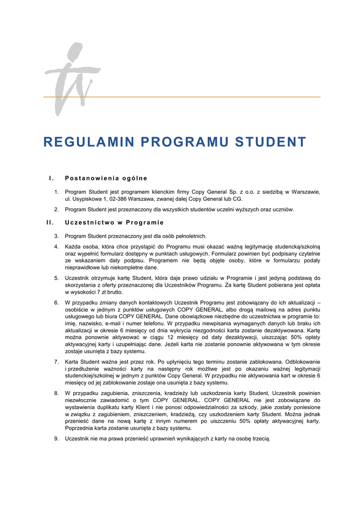 REGULAMIN PROGRAMU S TUDENT Postanowienia ogólne I. 1. Program Student jest programem klienckim firmy Copy General Sp. z o.o. z siedzibą w Warszawie, ul. Usypiskowa 1, 02-386 Warszawa, zwanej dalej Copy General lub CG. 2. Program Student jest przeznaczony dla wszystkich studentów uczelni wyższych oraz uczniów. II. Uczestnictwo w Programie 3. Program Student przeznaczony jest dla osób pełnoletnich. 4. Każda osoba, która chce przystąpić do Programu musi okazać ważną legitymację studencką/szkolną oraz wypełnić formularz dostępny w punktach usługowych. Formularz powinien być podpisany czytelnie ze wskazaniem daty podpisu. Programem nie będą objęte osoby, które w formularzu podały nieprawidłowe lub niekompletne dane. 5. Uczestnik otrzymuje kartę Student, która daje prawo udziału w Programie i jest jedyną podstawą do skorzystania z oferty przeznaczonej dla Uczestników Programu. Za kartę Student pobierana jest opłata w wysokości 7 zł brutto. 6. W przypadku zmiany danych kontaktowych Uczestnik Programu jest zobowiązany do ich aktualizacji – osobiście w jednym z punktów usługowych COPY GENERAL, albo drogą mailową na adres punktu usługowego lub biura COPY GENERAL. Dane obowiązkowe niezbędne do uczestnictwa w programie to: imię, nazwisko, e-mail i numer telefonu. W przypadku niewpisania wymaganych danych lub braku ich aktualizacji w okresie 6 miesięcy od dnia wykrycia niezgodności karta zostanie dezaktywowana. Kartę można ponownie aktywować w ciągu 12 miesięcy od daty dezaktywacji, uiszczając 50% opłaty aktywacyjnej karty i uzupełniając dane. Jeżeli karta nie zostanie ponownie aktywowana w tym okresie zostaje usunięta z bazy systemu. 7. Karta Student ważna jest przez rok. Po upłynięciu tego terminu zostanie zablokowana. Odblokowanie i przedłużenie ważności karty na następny rok możliwe jest po okazaniu ważnej legitymacji studenckiej/szkolnej w jednym z punktów Copy General. W przypadku nie aktywowania kart w okresie 6 miesięcy od jej zablokowanie zostaje ona usunięta z bazy systemu. 8. W przypadku zagubienia, zniszczenia, kradzieży lub uszkodzenia karty Student, Uczestnik powinien niezwłocznie zawiadomić o tym COPY GENERAL. COPY GENERAL nie jest zobowiązane do wystawienia duplikatu karty Klient i nie ponosi odpowiedzialności za szkody, jakie zostały poniesione w związku z zagubieniem, zniszczeniem, kradzieżą, czy uszkodzeniem karty Student. Można jednak przenieść dane na nową kartę z innym numerem po uiszczeniu 50% opłaty aktywacyjnej karty. Poprzednia karta zostanie usunięta z bazy systemu. 9. Uczestnik nie ma prawa przenieść uprawnień wynikających z karty na osobę trzecią. 10. Karta Student jest własnością COPY GENERAL. III. Czas obowiązywania Programu 11. Program może być zawieszony albo zakończony przez COPY GENERAL bez podania przyczyn. COPY GENERAL poinformuje o zakończeniu lub zawieszeniu Programu w materiałach reklamowych, w oddziałach lub na stronie Internetowej COPY GENERAL, a także w drodze listów e-mail nie później niż 30 dni przed datą zakończenia lub zawieszenia Programu. IV. Korzyści wynikające z udziału w Programie 12. Uczestnik Programu Student: a) Otrzymuje prawo do zniżek i cen specjalnych o których mowa w załączniku nr 1, z tym, że a. w przypadku rejestracji do Programu w punkcie usługowym zniżki i ceny specjalne przysługują od następnego dnia po dokonaniu rejestracji b. w przypadku rejestracji online już w ramach pierwszej transakcji wykonywanej podczas odbioru karty, b) Uzyskuje możliwość korzystania z czasowych ofert promocyjnych przewidzianych dla Programu Student, c) W przypadku gdy karta Klienta jest również kartą Pre-paid zniżka na przedpłacenie karty wynosi 12% d) Będzie otrzymywał drogą elektroniczną informacje o nowościach i aktualnych promocjach. 13. W przypadku użycia karty Student bez korzystania z przedpłaty na karcie, zniżki liczone są od cen podstawowych obowiązujących w punktach usługowych COPY GENERAL w dniu wykonywania usług. Zniżka w takim przypadku jest przyznawana każdorazowo przy zakupie usług COPY GENERAL. Warunkiem uzyskania w/w zniżki jest przekazanie pracownikowi COPY GENERAL karty Student najpóźniej w chwili przed rozpoczęciem rozliczania usługi. 14. W przypadku korzystania przez Uczestnika z karty Student przedpłaconej, ze środków na tej karcie, zniżka jest przyznawana wyłącznie przy przedpłacaniu karty. 15. Zniżka, o której mowa w punkcie 12 nie łączy się z innymi promocjami, chyba że w regulaminach innych promocji zostanie zastrzeżone co innego. V. Przedpłacona (Pre-paid) Karta Student 16. Uczestnik może przedpłacić środki finansowe na karcie Student (pre-paid). Środki te można wykorzystać wyłącznie w punktach COPY GENERAL w Polsce. 17. Uczestnik może w każdej chwili uzyskać informację o stanie rozliczeń w ramach karty przedpłaconej. Warunkiem otrzymania informacji jest przedstawienie karty. 18. Przedpłacone środki finansowe należy wykorzystać w czasie obowiązywania Programu Student. 19. Minimalna kwota przedpłaty wynosi 5 zł brutto. Możliwe jest przedpłacenie karty Student wyłącznie wielokrotnością kwoty minimalnej. 20. Środki z karty Student można przenieść na inną kartę wydaną przez COPY GENERAL na zasadach niniejszego regulaminu. 21. W przypadku korzystania z karty pre-paid w strefie samoobsługowej należy zastosować się do instrukcji wydanych przez pracownika COPY GENERAL. 22. Aby móc wykonać usługę na maszynie samoobsługowej minimalna kwota na karcie musi być większa od ceny 1 dwustronnej kopii lub wydruku na tej maszynie. W przypadku zlecenia wykonania usług o wartości większej, niż wartość środków na karcie Student, karta zablokuje wykonanie usługi w chwili wyczerpania środków na karcie. VI. Postanowienia końcowe 23. COPY GENERAL zobowiązuje się rozpatrzyć reklamacje Uczestników, co do przebiegu Programu, zło