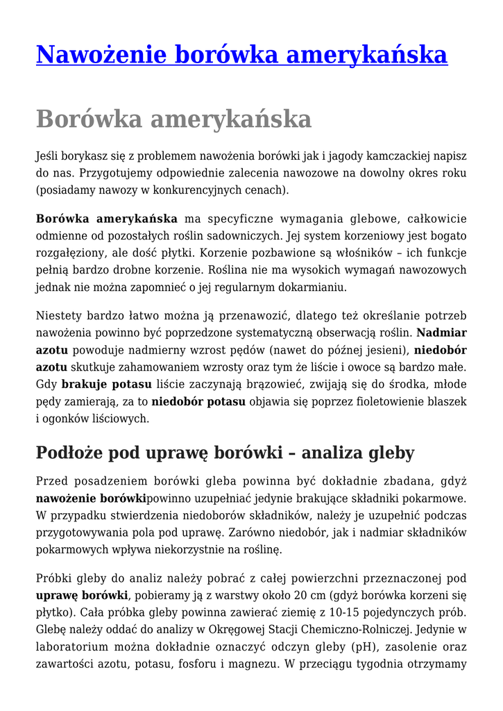 Nawożenie borówka amerykańska Borówka amerykańska Jeśli borykasz się z problemem nawożenia borówki jak i jagody kamczackiej napisz do nas. Przygotujemy odpowiednie zalecenia nawozowe na dowolny okres roku (posiadamy nawozy w konkurencyjnych cenach). Borówka amerykańska ma specyficzne wymagania glebowe, całkowicie odmienne od pozostałych roślin sadowniczych. Jej system korzeniowy jest bogato rozgałęziony, ale dość płytki. Korzenie pozbawione są włośników – ich funkcje pełnią bardzo drobne korzenie. Roślina nie ma wysokich wymagań nawozowych jednak nie można zapomnieć o jej regularnym dokarmianiu. Niestety bardzo łatwo można ją przenawozić, dlatego też określanie potrzeb nawożenia powinno być poprzedzone systematyczną obserwacją roślin. Nadmiar azotu powoduje nadmierny wzrost pędów (nawet do późnej jesieni), niedobór azotu skutkuje zahamowaniem wzrosty oraz tym że liście i owoce są bardzo małe. Gdy brakuje potasu liście zaczynają brązowieć, zwijają się do środka, młode pędy zamierają, za to niedobór potasu objawia się poprzez fioletowienie blaszek i ogonków liściowych. Podłoże pod uprawę borówki – analiza gleby Przed posadzeniem borówki gleba powinna być dokładnie zbadana, gdyż nawożenie borówkipowinno uzupełniać jedynie brakujące składniki pokarmowe. W przypadku stwierdzenia niedoborów składników, należy je uzupełnić podczas przygotowywania pola pod uprawę. Zarówno niedobór, jak i nadmiar składników pokarmowych wpływa niekorzystnie na roślinę. Próbki gleby do analiz należy pobrać z całej powierzchni przeznaczonej pod uprawę borówki, pobieramy ją z warstwy około 20 cm (gdyż borówka korzeni się płytko). Cała próbka gleby powinna zawierać ziemię z 10-15 pojedynczych prób. Glebę należy oddać do analizy w Okręgowej Stacji Chemiczno-Rolniczej. Jedynie w laboratorium można dokładnie oznaczyć odczyn gleby (pH), zasolenie oraz zawartości azotu, potasu, fosforu i magnezu. W przeciągu tygodnia otrzymamy szczegółową analizę gleby oraz zalecenia nawozowe. Przygotowanie gleby – nawożenie przed posadzeniem Już w trakcie sadzenie krzewów borówki musimy zadbać także o prawidłowe właściwości fizyczne gleby. Borówka najlepiej rośnie na glebie kwaśnej (pH 3,8-4,8) o wysokiej zawartości próchnicy, przepuszczalnej i wilgotnej. Rośliny uprawiane w podłożu o zbyt wysokim odczynie pH charakteryzują się małymi przyrostami oraz przedwczesnym żółknięciem i opadaniem liści. Zwykle nie mamy w ogrodzie idealnej gleby dla borówki, dlatego musimy ją wymienić. W tym celu musimy wykopać dół głębokości 40 cm i szerokości 60-80 cm i wypełnić go mieszanką kwaśnego torfu, kory drzew iglastych (najlepiej sosnową) oraz gruboziarnistego piasku (w proporcji 1:1:1). Jeżeli gleba w ogrodzie jest przepuszczalna, wystarczy ją wymieszać z torfem (1:1). Niewłaściwy odczyn pH możemy podwyższyć wapnując lub obniżyć siarkując glebę (zabieg siarkowania należy wykonać co najmniej rok przed sadzeniem roślin). Gleba wzbogacona substancją organiczną pozwala roślinom dobrze rosnąć nawet przy podwyższonym pH gleby. Często zastosowanie kwaśnego torfu skutecznie obniża pH gleby do właściwego poziomu. Nawożenie borówki po posadzeniu Borówka amerykańska (wbrew pozorom) ma niewielkie potrzeby pokarmowe. Nie znaczy to jednak, że jej nawożenia można zaniechać. Roślina ma specyficzne wymagania co do gleby i jeśli chcemy aby prawidłowo rosła i owocowała musimy jej je zapewnić. Nawozy azotowe należy stosować w trzech dawkach od początku maja do połowy czerwca. Pierwszą dawkę należy zastosować bezpośrednio po kwitnieniu krzewów (zwykle w drugiej połowie maja), a ostatnią, gdy kończy się pierwszy etap silnego wzrostu owoców – zwykle w drugiej połowie czerwca. Nawozy potasowe, fosforowe i magnezowe powinny byś wysiewane jesienią. Orientacyjne dawki nawożenia borówki wysokiej Składnik nawozowy Dawka w kg/h * Forma nawozu Azot N 30-50 siarczan amonu, saletra amonowa, mocznik Potas K2O 50-75 siarczan potasu, sól potasowa Fosfor P2O5 30-60 superfosfat, fosforan amonu Magnez MgO 20-80 siarczan magnezu (Opracowano na podstawie zaleceń MODR Małopolskiego Ośrodka Doradztwa Rolniczego) * Zalecenia nawozowe podane są w kg na hektar, aby łatwo przeliczyć na potrzeby przydomowych ogrodów podajemy przykład: 100 kg/ha to 10 g/mkw. Zapraszamy do zapoznania się z programem nawożenia borówki amerykańskiej Pobierz program nawożenia borówki: Przeczytaj: zalecenia_mivena Zapraszamy do zakupu nawozów do borówki amerykańskiej i nie tylko Paweł Wawryszczuk +48 695 195 816 lub zamów wypełniając formularz: Imię i Nazwisko (wymagane) Email (wymagane) Temat Informacja Wyślij Borówka amerykańska