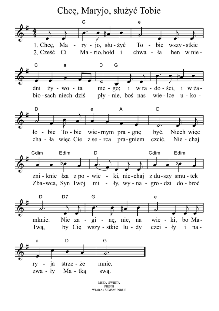 Chcę, Maryjo, służyć Tobie # & 44 j œ G œ. œ #œ J j œ œ 1. Chcę, Ma - ry - jo, słu - żyć Ma - rio, hołd i 2. Cześć Ci & # C œ œ a D G œ œ œ ˙ œ & D ˙ œ œ J ˙ j e œ œ j œ j œ To - bie wszy - stkie chwa - ła hen w nie - j j œ œ A œ. œ #œ œ J œ œ D œ ło - bie To - bie wie - rnym pra - gnę cha - ła więc Cie z se - rca pra- gniem Edim # Cdim & œ œ bœ œ œ me - go; i w ra - do - ści, i w ża pły - nie, boś nas wie - lce u - ko - dni ży - wo - ta bio - sach niech dziś # e œ . œj œ œj œj D ˙. j œ j œ być. Niech więc czcić. Nie - chaj Cdim œ Edim œ bœ œ zni - knie łza z po - wie - ki, nie- chaj z du - szy smu - tek Zba - wca, Syn Twój mi - ły, wy - na - gro - dzi do - broć & # D D7 j j œ œ ˙. mknie. Twą, & # a œ G œ. œ #œ J œ Nie za - gi - nę, nie, na by Cię wszy - stkie lu - dy œ ry - ja zwa - ły D œ œ strze - że Ma - tką G ˙. mnie. swą. MSZA ŚWIĘTA PIEŚNI WIARA / SIGISMUNDUS e ˙ j j œ œ œ wie - ki, bo Ma czci - ły i na -