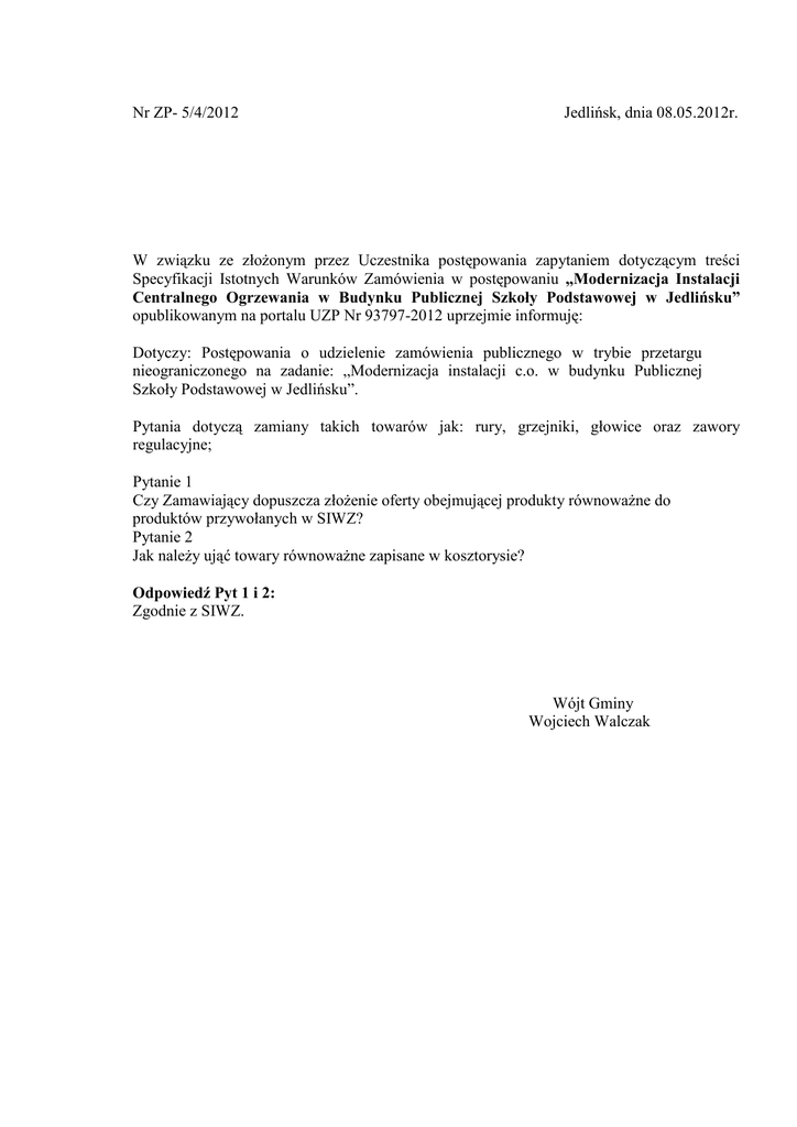 Nr ZP- 5/4/2012 Jedlińsk, dnia 08.05.2012r. W związku ze złożonym przez Uczestnika postępowania zapytaniem dotyczącym treści Specyfikacji Istotnych Warunków Zamówienia w postępowaniu „Modernizacja Instalacji Centralnego Ogrzewania w Budynku Publicznej Szkoły Podstawowej w Jedlińsku” opublikowanym na portalu UZP Nr 93797-2012 uprzejmie informuję: Dotyczy: Postępowania o udzielenie zamówienia publicznego w trybie przetargu nieograniczonego na zadanie: „Modernizacja instalacji c.o. w budynku Publicznej Szkoły Podstawowej w Jedlińsku”. Pytania dotyczą zamiany takich towarów jak: rury, grzejniki, głowice oraz zawory regulacyjne; Pytanie 1 Czy Zamawiający dopuszcza złożenie oferty obejmującej produkty równoważne do produktów przywołanych w SIWZ? Pytanie 2 Jak należy ująć towary równoważne zapisane w kosztorysie? Odpowiedź Pyt 1 i 2: Zgodnie z SIWZ. Wójt Gminy Wojciech Walczak