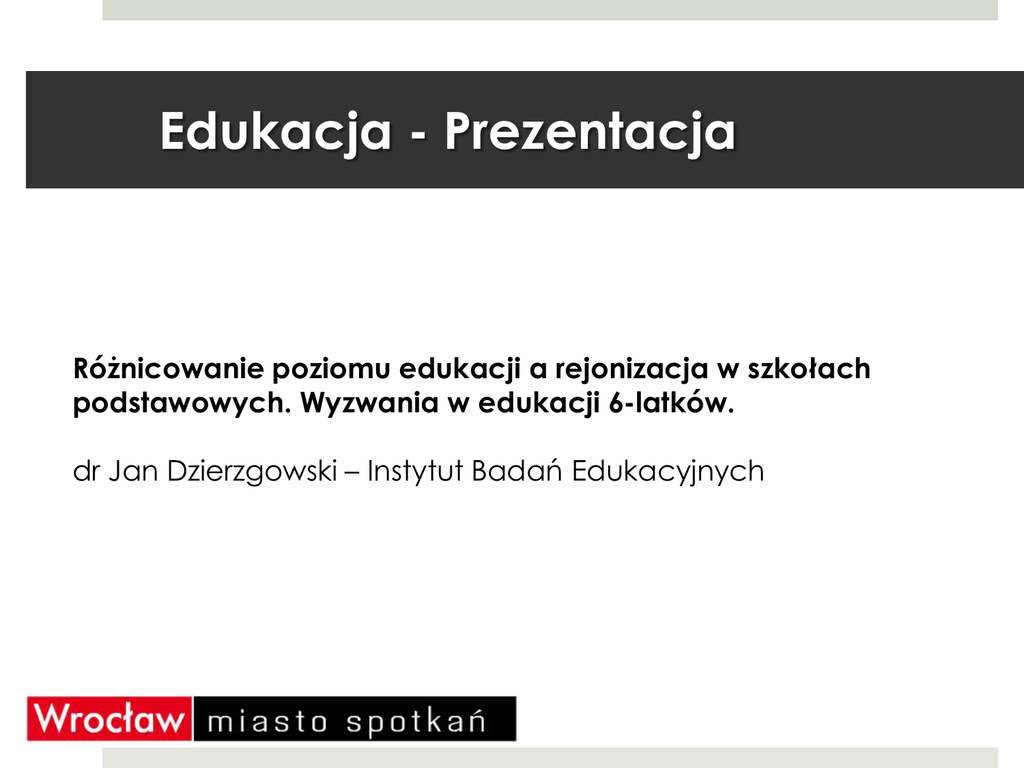 Edukacja - Prezentacja Różnicowanie poziomu edukacji a rejonizacja w szkołach podstawowych. Wyzwania w edukacji 6-latków. dr Jan Dzierzgowski – Instytut Badań Edukacyjnych Różnicowanie poziomu edukacji i wyzwania związane z edukacją sześciolatków Obie te kwestie łączy problem wyborów, dokonywanych przez rodziców. Z jednej strony w dzisiejszym społeczeństwie mamy do czynienia z bardzo silnym pozytywnym wartościowaniem możliwości wyboru. Z drugiej strony, wybór zagrażać może spójności polityki edukacyjnej Wybór i związane z nim problemy Nie wszyscy rodzice są w równym stopniu zainteresowani dokonywaniem wyborów Nie wszyscy rodzice mają takie same możliwości dokonywania wyborów Wybór prowadzić może do nadmiernego różnicowania się warunków i wyników kształcenia dziecka Wybór szkoły i zasada rejonizacji Zgodnie z ustawą o systemie oświaty, w przypadku szkół podstawowych i gimnazjalnych dziecko powinno uczęszczać do placówki właściwej dla miejsca zamieszkania. Jak jednak pokazują dane, zasada rejonizacji często jest luźno traktowana przez samorządy, zwłaszcza w wypadku szkół gimnazjalnych w największych miastach. Wybór szkoły i zasada rejonizacji Dla rodziców wybór szkoły gimnazjalnej dla dziecka jest rzeczą w miarę oczywistą. W roku 2015 wybór gimnazjum rozważało 64,6% rodziców; w miastach powyżej 100 tysięcy mieszkańców odsetek ten rósł do 85%. Częściej też wybór rozważano, jeśli ojciec dziecka miał wyższe wykształcenie (76,9%) Wybór szkoły i zasada rejonizacji Ludzie mają prawo wyboru lepszej szkoły dla dziecka. W warunkach [naszego miasta] skutecznym przeciwstawieniem się procesowi tworzenia się gett dając szkołom możliwość różnicowania się i wsparcie szkół by najlepiej zajmowały się dziećmi, które do nich realnie trafiają. Realistycznie trzeba dopuścić różnicowanie i wspierać szkoły słabsze Procesy wyboru nie przebiegają jednakowo W rezultacie jednak rodzice o wyższym kapitale kulturowym i ekonomicznym mają lepsze możliwości wyboru dobrej szkoły dla swoich dzieci. Podejmując decyzje o wyborze szkoły, stosują bardziej rozbudowane strategie, biorą pod uwagę więcej kryteriów, zasięgają więcej informacji. W ten sposób „lepsze” dzieci trafiają do „lepszych” szkół, co jeszcze bardziej zwiększa ich szanse życiowe. Autoselekcja negatywna Pewna grupa rodziców dokonuje autoselekcji negatywnej. Rodzice ci wyrażają nadzieję, że wybrana przez nich placówka – obwodowa, pozaobwodowa lub niepubliczna – nie będzie stawiała ich dziecku zbyt wyśrubowanych wymagań. Autoselekcja negatywna [Wybrałam tę szkołę] dlatego, że to był rejon, że to było blisko domu, żeby nie tracić na jakieś dojazdy. Poza tym on był trochę kiepskim uczniem, ja tu nie ukrywam. W związku z tym, on nie miałby żadnych szans na jakimś innym gimnazjum. […] No jednak, bo ten wyścig, w tej podstawówce te rankingi i te rankingi, to jest po prostu zabójstwo dla mnie. Bo to jest coś, co stygmatyzuje i powoduje coś, że szkoła np. nie chce słabszych uczniów, bo to obniża im poziom. Zróżnicowanie W rezultacie tych procesów od ponad dekady zwiększa się zróżnicowanie międzyszkolne gimnazjów publicznych w miastach powyżej 100 tysięcy mieszkańców (w roku 2015 zróżnicowanie międzyszkolne odpowiadało za około 40% wariancji całkowitej zróżnicowania wyników egzaminu gimnazjalnego w części humanistycznej) Zróżnicowanie Zdarza się ponadto, że gimnazja publiczne, osiągające wysokie wyniki, zniechęcają uczniów z obwodu, mogących wyniki te zaniżyć. Ponadto samorządy chronią niekiedy elitarne gimnazja, wyznaczając im bardzo niewielkie obwody, dzięki czemu szkoły same mogą określać korzystne zasady rekrutacji uczniów. Kształcenie sześciolatków Badania prowadzone przed cofnięciem obowiązku szkolnego sześciolatków wskazywały, że dzieci sześcio- i siedmioletnie posyłane do szkół w warunkach wolnego wyboru nie różniły się pod względem wykształcenia i zamożności rodziców Kształcenie sześciolatków Częściej jednak były to dzieci, których gotowość szkolna została wyżej oceniona przez rodziców (dzieci urodzone w pierwszych miesiącach roku, dzieci o wyższym IQ, lepiej rozwinięte fizycznie od przeciętnego rówieśnika) Kształcenie sześciolatków Po cofnięciu reformy sześciolatków część samorządów zdecydowała się na prowadzenie zerówek w szkołach, a nie w przedszkolach, co spotkało się ze stanowczą krytyką MEN. Zarazem jednak cofnięcie sześciolatków do przedszkoli mogło utrudnić dostępność miejsc przedszkolnych dla innych dzieci Kształcenie sześciolatków Po cofnięciu reformy sześciolatków część samorządów zdecydowała się na prowadzenie zerówek w szkołach, a nie w przedszkolach, co spotkało się ze stanowczą krytyką MEN. Zarazem jednak cofnięcie sześciolatków do przedszkoli mogło utrudnić dostępność miejsc przedszkolnych dla innych dzieci Kształcenie sześciolatków Dostępność miejsc przedszkolnych jest ponadto koniecznym kontekstem, jeśli chce się analizować kwestię kształcenia sześciolatków. Różnice poziomu dzieci na starcie edukacji szkolnej zależą bowiem w niemałym stopniu od tego, czy dziecko uczęszczało wcześniej do przedszkola. Tymczasem w Polsce dostępność przedszkoli wciąż utrzymuje się na względnie niskim poziomie (zwłaszcza na wsi). Kształcenie sześciolatków Można zatem powiedzieć, że w wypadku kształcenia sześciolatków, państwo dwukrotnie zdało się na wybór rodziców: wprowadzając reformę stopniowo i umożliwiając wybór szkoły lub edukacji w zerówce w przedszkolu, następnie zaś idąc za głosem środowisk rodzicielskich przeciwnych obowiązkowi szkolnemu dla sześciolatków. W obu jednak przypadkach dochodziło do różnicujących konsekwencji, przede wszystkim za sprawą dostępności miejsc w