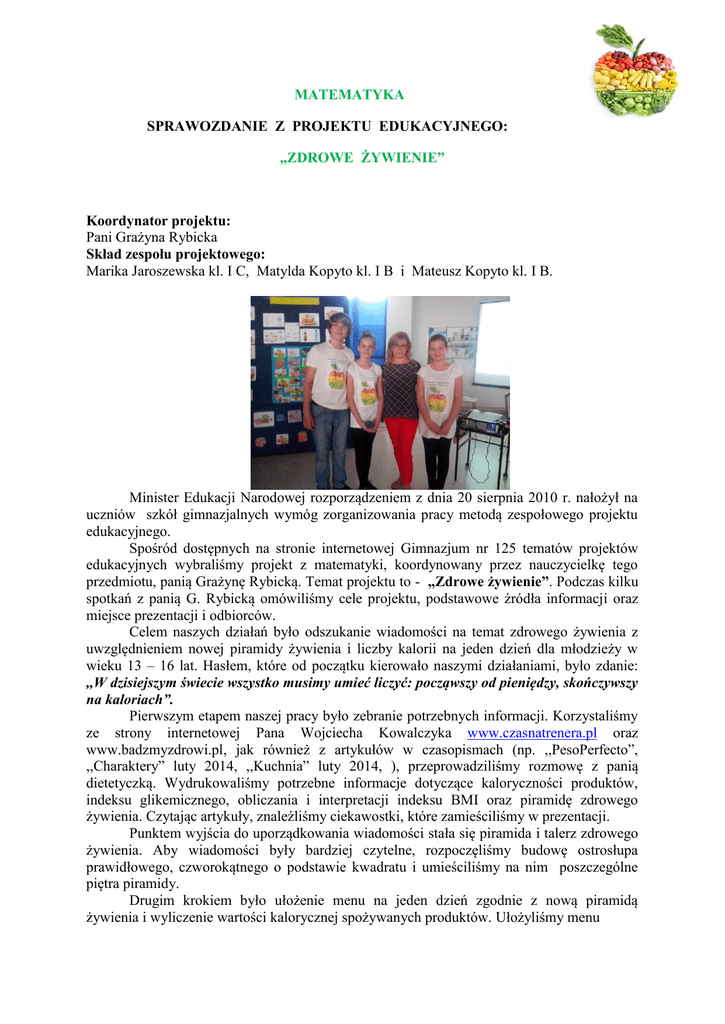 MATEMATYKA SPRAWOZDANIE Z PROJEKTU EDUKACYJNEGO: „ZDROWE ŻYWIENIE” Koordynator projektu: Pani Grażyna Rybicka Skład zespołu projektowego: Marika Jaroszewska kl. I C, Matylda Kopyto kl. I B i Mateusz Kopyto kl. I B. Minister Edukacji Narodowej rozporządzeniem z dnia 20 sierpnia 2010 r. nałożył na uczniów szkół gimnazjalnych wymóg zorganizowania pracy metodą zespołowego projektu edukacyjnego. Spośród dostępnych na stronie internetowej Gimnazjum nr 125 tematów projektów edukacyjnych wybraliśmy projekt z matematyki, koordynowany przez nauczycielkę tego przedmiotu, panią Grażynę Rybicką. Temat projektu to - „Zdrowe żywienie”. Podczas kilku spotkań z panią G. Rybicką omówiliśmy cele projektu, podstawowe źródła informacji oraz miejsce prezentacji i odbiorców. Celem naszych działań było odszukanie wiadomości na temat zdrowego żywienia z uwzględnieniem nowej piramidy żywienia i liczby kalorii na jeden dzień dla młodzieży w wieku 13 – 16 lat. Hasłem, które od początku kierowało naszymi działaniami, było zdanie: ,,W dzisiejszym świecie wszystko musimy umieć liczyć: począwszy od pieniędzy, skończywszy na kaloriach”. Pierwszym etapem naszej pracy było zebranie potrzebnych informacji. Korzystaliśmy ze strony internetowej Pana Wojciecha Kowalczyka www.czasnatrenera.pl oraz www.badzmyzdrowi.pl, jak również z artykułów w czasopismach (np. ,,PesoPerfecto”, ,,Charaktery” luty 2014, ,,Kuchnia” luty 2014, ), przeprowadziliśmy rozmowę z panią dietetyczką. Wydrukowaliśmy potrzebne informacje dotyczące kaloryczności produktów, indeksu glikemicznego, obliczania i interpretacji indeksu BMI oraz piramidę zdrowego żywienia. Czytając artykuły, znaleźliśmy ciekawostki, które zamieściliśmy w prezentacji. Punktem wyjścia do uporządkowania wiadomości stała się piramida i talerz zdrowego żywienia. Aby wiadomości były bardziej czytelne, rozpoczęliśmy budowę ostrosłupa prawidłowego, czworokątnego o podstawie kwadratu i umieściliśmy na nim poszczególne piętra piramidy. Drugim krokiem było ułożenie menu na jeden dzień zgodnie z nową piramidą żywienia i wyliczenie wartości kalorycznej spożywanych produktów. Ułożyliśmy menu dla młodzieży aktywnej fizycznie, nie uprawiającej sportu i ze skłonnościami do tycia. Sporządziliśmy listę zakupów i porównaliśmy ceny produktów, które należy kupić. Ceny spisaliśmy w sklepie ,,Tesco” i ,,Piotr i Paweł”. Wybraliśmy te sklepy, ponieważ znajdują się tam półki ze zdrową żywnością, a produkty są tej samej lub porównywalnej jakości. ,,Piotr Paweł” próbuje się wyróżnić, rozszerzając ofertę i mimo porównywalnej jakości z ,,Tesco” ma wyższe ceny. Ceny zaokrągliliśmy. Trzeci krok projektu to krzyżówki i zadania dla młodzieży. W czasie konkursu wiedzy o zdrowym odżywianiu, rywalizowali ze sobą przedstawiciele czterech klas gimnazjalnych. Zwyciężyła klasa ID. Wszyscy rywalizujący otrzymali za swoją pracę nagrody w postaci owoców. Żeby zachęcić młodzież do udziału w prezentacji, zaprosiliśmy kilka osób (zainteresowanie pomiarem było bardzo duże) do obliczenia współczynnika BMI. Wykorzystaliśmy wzór matematyczny, przeliczyliśmy wzrost podany w centymetrach na metry i po otrzymaniu wyniku zinterpretowaliśmy go. W tym czasie pozostałym osobom rozdaliśmy broszurki dotyczące zdrowego odżywiania się. Zaprosiliśmy kolegów na degustację potraw, które sami przyrządziliśmy. W czasie poczęstunku młodzież przekazywała nam swoje spostrzeżenia dotyczące smaku, wyglądu potraw oraz wyliczonej kaloryczności. Prezentacja projektu była ostatnim etapem jego realizacji. Podczas Dnia Otwartego w Gimnazjum nr 125 przekazaliśmy informacje dotyczące zdrowego żywienia szóstoklasistom i ich rodzicom, nauczycielom oraz uczniom naszej szkoły. Wykorzystane informacje dotyczyły przede wszystkim młodzieży w wieku 13 – 16 lat. Dnia 30 kwietnia 2014 roku zaprezentowaliśmy projekt uczniom Gimnazjum nr 125. Cel prezentacji został osiągnięty, a dzięki wykorzystanym pomocom, informacje dotyczące zdrowego żywienia na długo zapadną w naszej pamięci. Pokaz zakończył się degustacją potraw oraz wręczeniem nagród uczestnikom konkursu. Chociaż przy wyborze tematu trudno nam było uwierzyć, że ,,Zdrowe żywienie” jest projektem matematycznym, to w trakcie jego realizacji udowodniliśmy, że nie ma zdrowego odżywiania bez matematyki. Wiadomości, które od lat zdobywamy na lekcji, będziemy umieli wykorzystać w życiu codziennym. Efekt naszej ciężkiej pracy 17 maja mogli oglądać nauczyciele, dyrekcja, wszyscy uczniowie i ich rodzice oraz goście zaproszeni na Piknik Majowy. Jak się okazało, wyniki obliczeń BMI były bardzo różne: od niedowagi u dzieci do otyłości u dorosłych. Dla uczestników konkursów przygotowaliśmy atrakcyjne nagrody. Pluszowe owoce i warzywa oraz kolorowe piłeczki zachęcały do odwiedzenia naszego stoiska. Uczniowie, rodzice i nauczyciele rozwiązywali krzyżówki i rebusy. W odgadnięciu haseł pomogła im przygotowana przez nas Piramida Zdrowego Żywienia i Talerz Zdrowia. Jesteśmy pewni, że w zrobionej przez nas ulotce, każdy znajdzie wskazówki jak zmienić złe nawyki żywieniowe. Dziękujemy pani Grażynie Rybickiej za cenne wskazówki, pomoc w realizacji i przeprowadzeniu prezentacji. Zespół projektowy: Marika Jaroszewska IC Matylda Kopyto IB Mateusz Kopyto