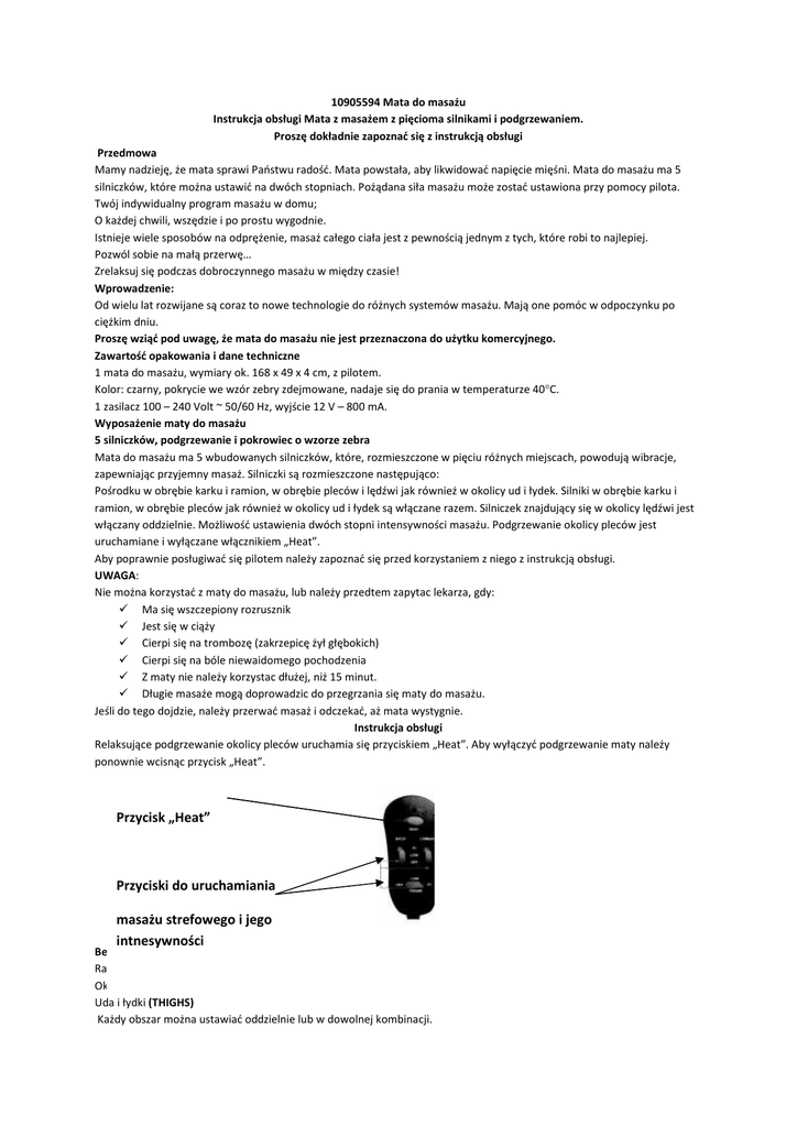10905594 Mata do masażu Instrukcja obsługi Mata z masażem z pięcioma silnikami i podgrzewaniem. Proszę dokładnie zapoznać się z instrukcją obsługi Przedmowa Mamy nadzieję, że mata sprawi Państwu radość. Mata powstała, aby likwidować napięcie mięśni. Mata do masażu ma 5 silniczków, które można ustawić na dwóch stopniach. Pożądana siła masażu może zostać ustawiona przy pomocy pilota. Twój indywidualny program masażu w domu; O każdej chwili, wszędzie i po prostu wygodnie. Istnieje wiele sposobów na odprężenie, masaż całego ciała jest z pewnością jednym z tych, które robi to najlepiej. Pozwól sobie na małą przerwę… Zrelaksuj się podczas dobroczynnego masażu w między czasie! Wprowadzenie: Od wielu lat rozwijane są coraz to nowe technologie do różnych systemów masażu. Mają one pomóc w odpoczynku po ciężkim dniu. Proszę wziąć pod uwagę, że mata do masażu nie jest przeznaczona do użytku komercyjnego. Zawartość opakowania i dane techniczne 1 mata do masażu, wymiary ok. 168 x 49 x 4 cm, z pilotem. Kolor: czarny, pokrycie we wzór zebry zdejmowane, nadaje się do prania w temperaturze 40°C. 1 zasilacz 100 – 240 Volt ~ 50/60 Hz, wyjście 12 V – 800 mA. Wyposażenie maty do masażu 5 silniczków, podgrzewanie i pokrowiec o wzorze zebra Mata do masażu ma 5 wbudowanych silniczków, które, rozmieszczone w pięciu różnych miejscach, powodują wibracje, zapewniając przyjemny masaż. Silniczki są rozmieszczone następująco: Pośrodku w obrębie karku i ramion, w obrębie pleców i lędźwi jak również w okolicy ud i łydek. Silniki w obrębie karku i ramion, w obrębie pleców jak również w okolicy ud i łydek są włączane razem. Silniczek znajdujący się w okolicy lędźwi jest włączany oddzielnie. Możliwość ustawienia dwóch stopni intensywności masażu. Podgrzewanie okolicy pleców jest uruchamiane i wyłączane włącznikiem „Heat”. Aby poprawnie posługiwać się pilotem należy zapoznać się przed korzystaniem z niego z instrukcją obsługi. UWAGA: Nie można korzystać z maty do masażu, lub należy przedtem zapytac lekarza, gdy: Ma się wszczepiony rozrusznik Jest się w ciąży Cierpi się na trombozę (zakrzepicę żył głębokich) Cierpi się na bóle niewaidomego pochodzenia Z maty nie należy korzystac dłużej, niż 15 minut. Długie masaże mogą doprowadzic do przegrzania się maty do masażu. Jeśli do tego dojdzie, należy przerwać masaż i odczekać, aż mata wystygnie. Instrukcja obsługi Relaksujące podgrzewanie okolicy pleców uruchamia się przyciskiem „Heat”. Aby wyłączyć podgrzewanie maty należy ponownie wcisnąc przycisk „Heat”. Przycisk „Heat” Przyciski do uruchamiania masażu strefowego i jego intnesywności Bezpośredni masaż specjalnych stref: Ramiona, kark i rejon pleców (BACK) Okolice lędźwi (LUMBAR) Uda i łydki (THIGHS) Każdy obszar można ustawiać oddzielnie lub w dowolnej kombinacji. Aby wybrać miejsce masażu, przesuń odpowiedni przełącznik z pozycji „OFF” do pozycji LOW/HI. Natężenie masażu (LOW/HI) Masaż wybranej okolicy ciała może się odbywać w dwóch natężeniach: LOW= słaby masaż HI = silny masaż Aby ustawić pożądaną intensywnośc masażu przesuń odpowiedni przełącznik do pozycji LOW lub HI. UWAGA! Jeśli ustawiony zostanie jednocześnie masaż i podgrzewanie, intensywność masażu znacznie spada. Jest to normalne i nie świadczy o uszkodzeniu urządzenia. Przed uruchomieniem: Połóż matę do masażu na bezpiecznym podłożu (łóżko, podłoga, tapczan, leżak, fotel itp.). Działanie masażu jest w pozycji leżącej nabardziej efektywne, ponieważ masaż jest silniejszy, szczególnie na łydkach. Połącz wtyczkę zasilacza z wtyczką maty do masażu. Podłącz wtyczkę zasilacza do sieci. Ważna wskazówka” Przed włożeniem wtyczki do sieci zwróć uwagę na to, aby trzy przełączniki były ustawione w pozycji „OFF”. Po skorzystaniu z maty odłącz ją od prądu! Wskazówki bezpieczeństwa: Nie zanurzaj urządzenia w wodzie ani w innych cieczach. Nie korzystaj z maty podczas snu. Osoby, które wymagają opieki oraz osoby niepełnosprawne, podczas korzystania z maty powinny się znajdować pod opieką. Trzymaj matę z dala od dzieci. Nie dotykaj maty, jeśli wpadła do wody lub do innej cieczy. W takim wypadku natychmiast wyciągnij wtyczkę z gniazdka. Gdy mata nie jest używana, należy odłączyć ją od prądu. Nie korzystaj z maty jeśli jej praca nie jest prawidłowa. Jeśli taki fakt nastąpi, skontaktuj się z naszym serwisem. Nigdy nie używaj maty leżąc pod kołdrą. Może to doprowadzić do przegrzania się maty. Matę i kabel zasilający należy trzymać z dala od gorących przedmiotów. Czyszczenie: Po wyłączeniu maty wyciągnij wtyczkę z gniazdka i odczekaj aż mata wystygnie. Przetrzyj matę wilgotną ściereczką lub gąbką. Nie używaj szczoteczki. Korzystaj wyłącznie z łagodnych środków myjących. Nie używaj benzyny, środków do mycia okien, szkła, politury meblowej, rozpuszczalników. Suchą ściereczką wytrzyj matę do sucha. Przechowywanie: Złóż matę składając górny i dolny koniec maty do środka, w kierunku środka maty, a następnie składając ją jeszcze raz przez środek. Włóż matę do pudełka, lub odłóż ją w suche, zimne miejsce. Uważaj na to, aby powierzchnia maty nie została uszkodzona przez ostre przedmioty. Nie wieszaj maty na kablu ani na pilocie. W trosce o środowisko naturalne prosimy o zwrot opakowania do odpowiedniego miejsca zbiórki surowców. Utylizacja zużytych urządzeń Urządzenia elektryczne i elektroniczne nie mogą być wyrzucane wraz z odpadami domowymi. Użytkownik jest ustawowo zobowiązany do oddania zużytych urządzeń elektrycznych i elektronicznych do przeznaczonych do tego celu punktów zbiórki lub do miejsca zakupu. Szczegóły są zawarte w prawie krajowym. Informuje o tym symbol, umieszczony na produkcie, na 