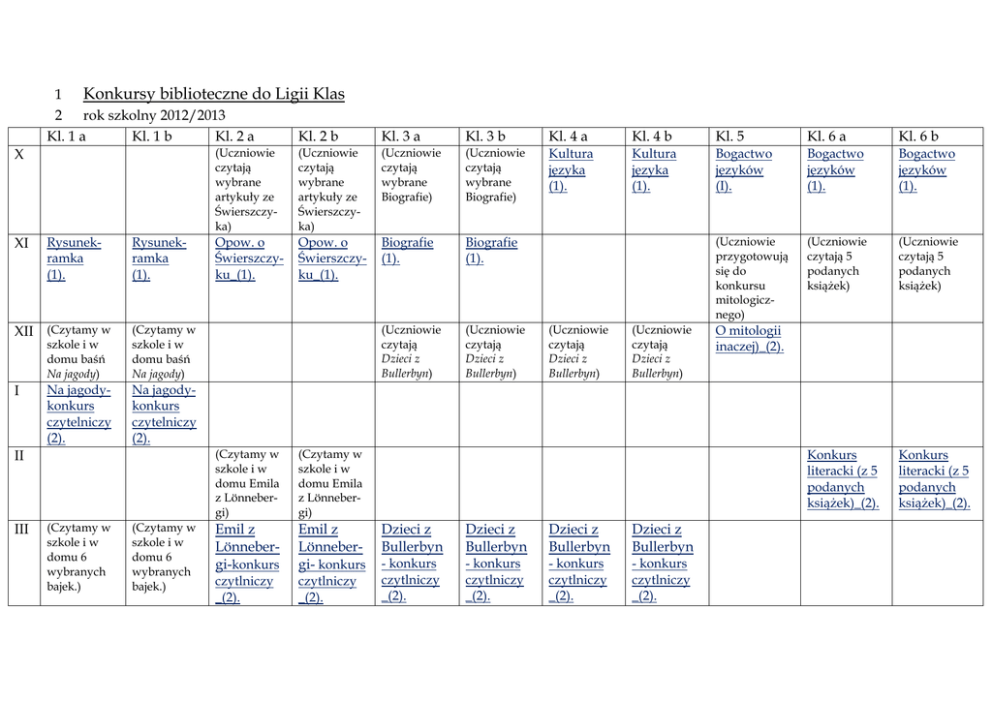 1 Konkursy biblioteczne do Ligii Klas 2 rok szkolny 2012/2013 Kl. 1 a Kl. 1 b Kl. 2 a Kl. 2 b X XI Rysunekramka (1). Rysunekramka (1). XII (Czytamy w szkole i w domu baśń Na jagody) (Czytamy w szkole i w domu baśń Na jagody) Na jagodykonkurs czytelniczy (2). Na jagodykonkurs czytelniczy (2). I II III (Czytamy w szkole i w domu 6 wybranych bajek.) (Czytamy w szkole i w domu 6 wybranych bajek.) Kl. 3 a Kl. 3 b Kl. 4 a Kl. 4 b Kl. 5 Kl. 6 a Kl. 6 b Kultura języka (1). Kultura języka (1). Bogactwo języków (I). Bogactwo języków (1). Bogactwo języków (1). (Uczniowie przygotowują się do konkursu mitologicznego) (Uczniowie czytają 5 podanych książek) (Uczniowie czytają 5 podanych książek) Konkurs literacki (z 5 podanych książek)_(2). Konkurs literacki (z 5 podanych książek)_(2). (Uczniowie czytają wybrane artykuły ze Świerszczyka) (Uczniowie czytają wybrane artykuły ze Świerszczyka) (Uczniowie czytają wybrane Biografie) (Uczniowie czytają wybrane Biografie) Opow. o Świerszczyku_(1). Opow. o Świerszczyku_(1). Biografie (1). Biografie (1). (Uczniowie czytają Dzieci z Bullerbyn) (Uczniowie czytają Dzieci z Bullerbyn) (Czytamy w szkole i w domu Emila z Lönnebergi) (Czytamy w szkole i w domu Emila z Lönnebergi) Emil z Lönnebergi-konkurs Emil z Lönnebergi- konkurs czytlniczy _(2). czytlniczy _(2). (Uczniowie czytają Dzieci z Bullerbyn) (Uczniowie czytają Dzieci z Bullerbyn) Dzieci z Bullerbyn Dzieci z Bullerbyn Dzieci z Bullerbyn Dzieci z Bullerbyn - konkurs czytlniczy _(2). - konkurs czytlniczy _(2). - konkurs czytlniczy _(2). - konkurs czytlniczy _(2). O mitologii inaczej)_(2). IV V Konkurs czytelniczy (3). Konkurs czytelniczy (3). „By się czytać chciało zakładkę zrób wspaniałą” _(3) (Uczniowie czytają wybrane wiersze Brzechwy (Uczniowie czytają wybrane wiersze Brzechwy (Uczniowie czytają wybrane wiersze Brzechwy (Uczniowie czytają wybrane wiersze Brzechwy Konkurs czytelniczyBrzechwa dzieciom (3). Konkurs czytelniczyBrzechwa dzieciom (3). Konkurs czytelniczyBrzechwa dzieciom* (3). Konkurs czytelniczyBrzechwa dzieciom* (3). „By się czytać chciało zakładkę zrób wspaniałą_” (3) *Ewent. „Dokończ opowiadanie” (Przygotowanie wiersza do konkursu) (Przygotowanie wiersza do konkursu) (Przygotowanie wiersza do konkursu) Konkurs poezji „O lecie”_(3)* Konkurs poezji „O lecie”_(3)* Konkurs poezji „O lecie”_(3)* *lub: „Metafory literackie” VI Terminy konkursów mogą być w miarę potrzeby przesunięte 3 Szczegółowe informacje o konkursach będą podawane w klasach.