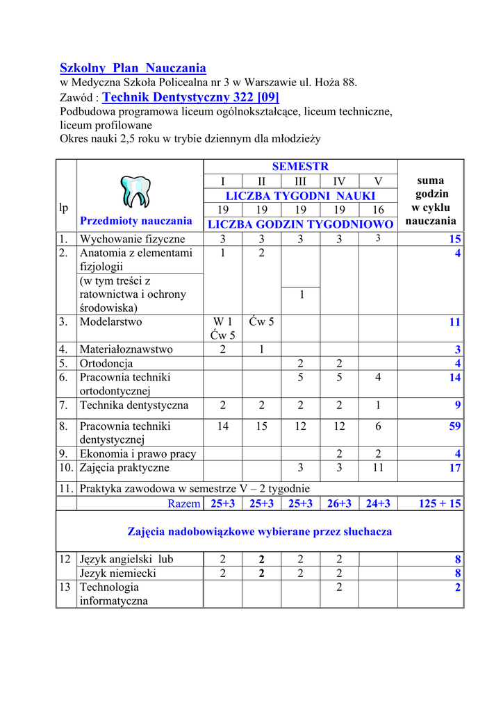 Szkolny Plan Nauczania Zawód : Technik Dentystyczny 322 [09]