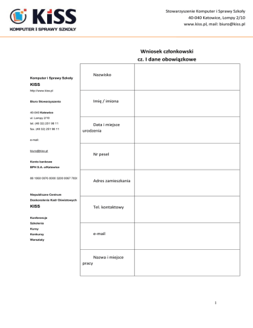 Stowarzyszenie Komputer i Sprawy Szkoły 40-040 Katowice, Lompy 2/10 www.kiss.pl, mail: [email protected] Wniosek członkowski cz. I dane obowiązkowe Nazwisko Komputer i Sprawy Szkoły KISS http://www.kiss.pl Imię / imiona Biuro Stowarzyszenia 40-040 Katowice ul. Lompy 2/10 tel. (48 32) 251 98 11 fax. (48 32) 251 98 11 Data i miejsce urodzenia e-mail: [email protected] Nr pesel Konto bankowe BPH S.A. o/Katowice 88 1060 0076 0000 3200 0067 7830 Adres zamieszkania Niepubliczne Centrum Doskonalenia Kadr Oświatowych KISS Tel. kontaktowy Konferencje Szkolenia Kursy e-mail Konkursy Warsztaty Nazwa i miejsce pracy 1 Wniosek członkowski część II dane nieobowiązkowe, lecz przydatne, bowiem mogą być zawsze początkiem bardzo fajnej znajomości Komputer i Sprawy Szkoły KISS http://www.kiss.pl Biuro Stowarzyszenia 40-040 Katowice ul. Lompy 2/10 tel. (48 32) 251 98 11 Zainteresowania/hobby Marka ulubionego piwa ewentualnie innego napoju (może być bezalkoholowego) Czym chcesz się pochwalić fax. (48 32) 251 98 11 Ulubione zwierzę e-mail: [email protected] Kogo lub co zabrałbyś (zabrałabyś) na bezludną wyspę Konto bankowe Czy łapiesz się za guzik gdy widzisz kominiarza? BPH S.A. o/Katowice 88 1060 0076 0000 3200 0067 7830 Niepubliczne Centrum Doskonalenia Kadr Oświatowych Ulubiona gra Twój typ charakteru (niepotrzebne skreślić) Melancholik choleryk sangwinik flegmatyk KISS Konferencje Szkolenia Kursy Konkursy Twoja fotografia Warsztaty Wyrażam zgodę na przechowywanie i przetwarzanie moich danych przez Stowarzyszenie KISS w celach związanych z działalnością statutową. Data i podpis_______________________________________ 2