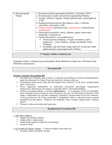 4. Rzeczpospolita Polska 1. Konstytucja Rzeczypospolitej Polskiej z 2 kwietnia 1997 r. 2. Konstytucyjne zasady ustroju Rzeczypospolitej Polskiej 3. Zasady wyborów organów władzy państwowej i samorządowej w RP 4. Katalog konstytucyjnych obowiązków, praw i wolności człowieka i obywatela w RP 5. Organy władzy ustawodawczej, wykonawczej i sadowniczej; kompetencje 6. Samorząd terytorialny; ustrój, zadania, organy stanowiąco – kontrolne i wykonawcze 7. Udział obywateli w Ŝyciu publicznym stowarzyszenia, fundacje, związki zawodowe, partie polityczne – cechy, funkcje, rodzaje, przykłady, formy działania przykłady, jak obywatele mogą wpływać na decyzje władz państwowych i samorządowych w Polsce 5. Organy władzy wykonawczej Organami władzy wykonawczej są Prezydent, Rada Ministrów (rząd) wraz z Prezesem rady Ministrów (premierem). Prezydent RP Zasady wyborów Prezydenta RP Prezydent jest wybierany przez Naród w wyborach powszechnych, równych, bezpośrednich i tajnych na kadencję 5-o letnią. Ponownie moŜe być wybrany tylko raz. Prezydentem moŜe zostać kaŜdy obywatel polski, który ukończył 35 rok Ŝycia i posiada pełnię praw wyborczych. Prawo zgłaszania kandydatów na stanowisko prezydenta przysługuje organizacjom politycznym, społecznym oraz grupie co najmniej 100 tys. obywateli (podpisy). Wybory są przeprowadzane w sposób większościowy – za wybranego uwaŜa się kandydata, który otrzymał więcej niŜ połowę waŜnych głosów (nie liczy się frekwencja wyborcza). JeŜeli Ŝaden z kandydatów nie uzyskał wymaganej większości, przeprowadza się II turę wyborów, 14 dni po pierwszej. Do II tury przechodzi 2 kandydatów, którzy w pierwszej turze uzyskali największą liczbę głosów. Wygrywa ten kandydat, który uzyskał większą ilość waŜnych głosów . WaŜność wyboru stwierdza Sąd NajwyŜszy Kompetencje Prezydenta RP 1. Jako głowy państwa nadaje obywatelstwo polskie nadaje ordery i odznaczenia nadaje tytuły naukowe profesora zwyczajnego ma prawo łaski 2. W stosunku do Sejmu i Senatu – w zakresie władzy ustawodawczej zarządza wybory do Sejmu i Senatu zwołuje pierwsze posiedzenie Sejmu i Senatu posiada inicjatywę ustawodawczą – ma prawo zgłoszenia projektu ustawy wyznacza marszałków seniorów podpisuje ustawy i zarządza ich ogłoszenie w Dzienniku Ustaw posiada prawo weta zawieszającego – moŜe sprzeciwić się podpisaniu ustawy. Wówczas ustawa wraca do Sejmu. Sejm moŜe odrzucić weto Prezydenta większością kwalifikowaną 3/5 głosów ma prawo wystąpić do Trybunału Konstytucyjnego w sprawie zgodności ustawy z Konstytucją ma prawo rozwiązać parlament w przypadkach: (1) jeŜeli w ciągu 4 miesięcy od dnia złoŜenia Sejmowi projektu ustawy budŜetowej nie zostanie ona uchwalona przez Sejm (2) w razie nie powołania rządu po trzech nieudanych próbach wydaje rozporządzenia i zarządzenia w celu wykonania ustaw 3. Wobec Rady Ministrów – w zakresie władzy wykonawczej desygnuje premiera a na jego wniosek ministrów, na wniosek premiera dokonuje zmian w składzie rządu (tzw. rekonstrukcja rządu) – powołuje rząd i dokonuje w nim zmian na wniosek premiera. występuje z wnioskiem do Sejmu o pociągniecie członka rządu do odpowiedzialności przed Trybunałem Stanu w określonych przypadkach zwołuje nadzwyczajne posiedzenie rządu, któremu przewodniczy (Jest to Rada Gabinetowa – nie przysługują jej kompetencje Rady Ministrów) 4. Wobec władzy sądowniczej powołuje sędziów na wniosek Krajowej Rady Sądownictwa powołuje: o Pierwszego Prezesa Sądu NajwyŜszego o Prezesa i Wiceprezesa Trybunału Konstytucyjnego o Prezesa Naczelnego Sądu Administracyjnego o 1 członka Krajowej Rady Sądownictwa 5. W zakresie zwierzchnictwa Sił Zbrojnych, obronności i bezpieczeństwa państwa jest zwierzchnikiem sił zbrojnych nadaje stopnie wojskowe na wniosek Ministra Obrony Narodowej w razie niebezpieczeństwa zewnętrznego podejmuje decyzję o wprowadzeniu na części lub na całości terytorium państwa stanu wojennego w przypadku bezpośredniego, zewnętrznego zagroŜenia kraju, na wniosek premiera moŜe ogłosić częściową lub powszechną mobilizację i wydaje decyzję o uŜyciu sił zbrojnych do obrony kraju obsadza najwyŜsze stanowiska w siłach zbrojnych – w porozumieniu lub na wniosek Ministra Obrony Narodowej w razie wewnętrznego zagroŜenia państwa lub klęski Ŝywiołowej moŜe wprowadzić na czas określony (3 miesiące) stan wyjątkowy. mianuje Naczelnego Wodza na czas wojny organem doradczym Prezydenta w zakresie wewnętrznego i zewnętrznego bezpieczeństwa jest Rada Bezpieczeństwa Narodowego 6. W zakresie spraw zagranicznych jest najwyŜszym reprezentantem państwa w stosunkach zagranicznych ratyfikuje i wypowiada traktaty i umowy międzynarodowe mianuje i odwołuje przedstawicieli RP (ambasadorów) przyjmuje i odwołuje akredytowanych przy nim przedstawicieli dyplomatycznych innych państw i organizacji międzynarodowych podczas przerwy w obradach Sejmu moŜe podjąć decyzję o stanie wojny Rada Ministrów i prezes Rady Ministrów Skład Rady Ministrów W skład Rady Ministrów wchodzą Prezes Rady Ministrów (premier), wiceprezesi Rady Ministrów, ministrowie oraz przewodniczący określonych w ustawie komitetów. Rada Ministrów działa kolegialnie (jest wieloosobowa). Rząd tworzy partia, która wygrała wybory parlamentarne. JeŜeli partia ta nie uzyska 231 mandatów wówczas tworzona jest koalicja rządowa złoŜona z kilku partii, które łącznie muszą posiadać 231 mandatów (bezwzględna liczba głosów w Sejmie). Po wyborach 2007 roku na premiera został desygnowany Donald Tusk z PO (Platforma Obywatelska). PO wraz z PSL (Polskie Stronnictwo Ludowe) utworzyło koalicję rządową. Lider PSL Waldemar Pawlak został wicepremierem Premier: kieruje pracami rządu, koordynuje i kontroluje prace poszczególnych ministrów, sprawuje nadzór nad samorządem terytorialny