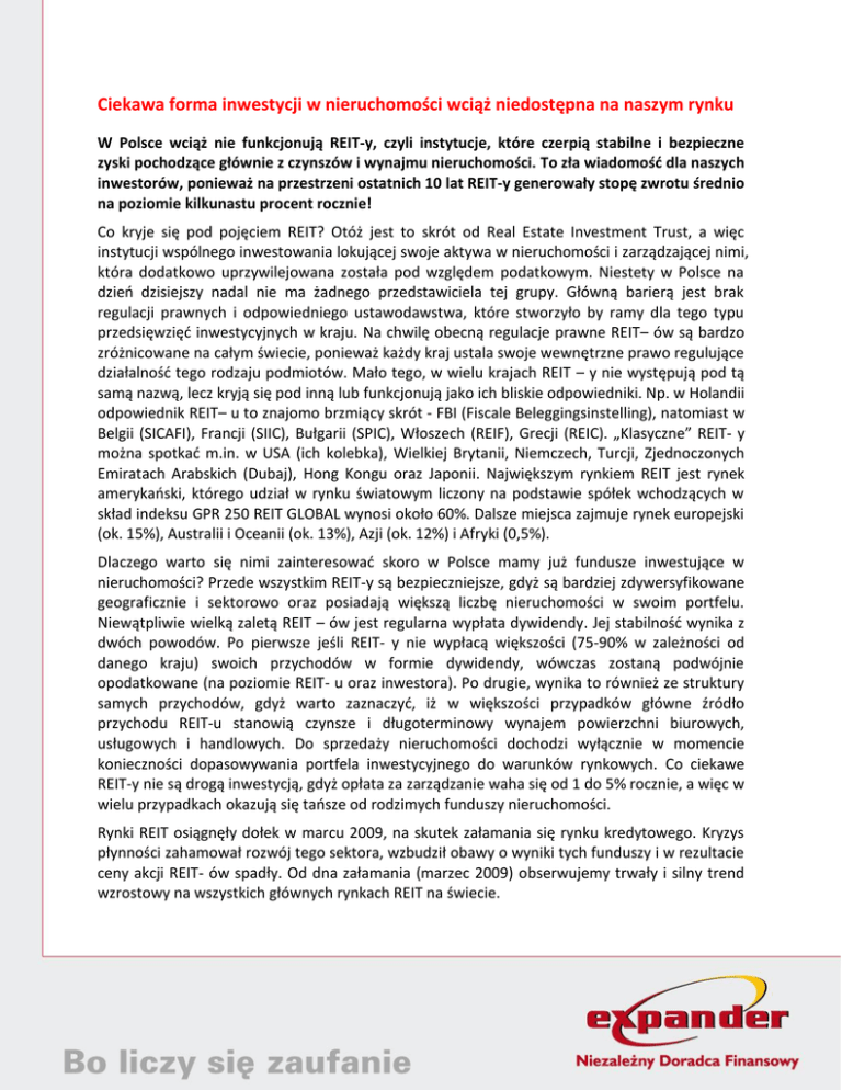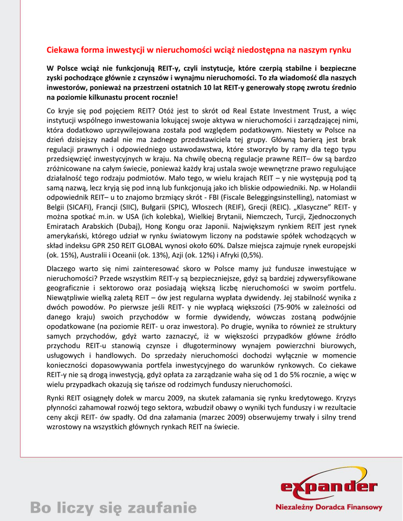 Ciekawa forma inwestycji w nieruchomości wciąż niedostępna na naszym rynku W Polsce wciąż nie funkcjonują REIT-y, czyli instytucje, które czerpią stabilne i bezpieczne zyski pochodzące głównie z czynszów i wynajmu nieruchomości. To zła wiadomośd dla naszych inwestorów, ponieważ na przestrzeni ostatnich 10 lat REIT-y generowały stopę zwrotu średnio na poziomie kilkunastu procent rocznie! Co kryje się pod pojęciem REIT? Otóż jest to skrót od Real Estate Investment Trust, a więc instytucji wspólnego inwestowania lokującej swoje aktywa w nieruchomości i zarządzającej nimi, która dodatkowo uprzywilejowana została pod względem podatkowym. Niestety w Polsce na dzieo dzisiejszy nadal nie ma żadnego przedstawiciela tej grupy. Główną barierą jest brak regulacji prawnych i odpowiedniego ustawodawstwa, które stworzyło by ramy dla tego typu przedsięwzięd inwestycyjnych w kraju. Na chwilę obecną regulacje prawne REIT– ów są bardzo zróżnicowane na całym świecie, ponieważ każdy kraj ustala swoje wewnętrzne prawo regulujące działalnośd tego rodzaju podmiotów. Mało tego, w wielu krajach REIT – y nie występują pod tą samą nazwą, lecz kryją się pod inną lub funkcjonują jako ich bliskie odpowiedniki. Np. w Holandii odpowiednik REIT– u to znajomo brzmiący skrót - FBI (Fiscale Beleggingsinstelling), natomiast w Belgii (SICAFI), Francji (SIIC), Bułgarii (SPIC), Włoszech (REIF), Grecji (REIC). „Klasyczne” REIT- y można spotkad m.in. w USA (ich kolebka), Wielkiej Brytanii, Niemczech, Turcji, Zjednoczonych Emiratach Arabskich (Dubaj), Hong Kongu oraz Japonii. Największym rynkiem REIT jest rynek amerykaoski, którego udział w rynku światowym liczony na podstawie spółek wchodzących w skład indeksu GPR 250 REIT GLOBAL wynosi około 60%. Dalsze miejsca zajmuje rynek europejski (ok. 15%), Australii i Oceanii (ok. 13%), Azji (ok. 12%) i Afryki (0,5%). Dlaczego warto się nimi zainteresowad skoro w Polsce mamy już fundusze inwestujące w nieruchomości? Przede wszystkim REIT-y są bezpieczniejsze, gdyż są bardziej zdywersyfikowane geograficznie i sektorowo oraz posiadają większą liczbę nieruchomości w swoim portfelu. Niewątpliwie wielką zaletą REIT – ów jest regularna wypłata dywidendy. Jej stabilnośd wynika z dwóch powodów. Po pierwsze jeśli REIT- y nie wypłacą większości (75-90% w zależności od danego kraju) swoich przychodów w formie dywidendy, wówczas zostaną podwójnie opodatkowane (na poziomie REIT- u oraz inwestora). Po drugie, wynika to również ze struktury samych przychodów, gdyż warto zaznaczyd, iż w większości przypadków główne źródło przychodu REIT-u stanowią czynsze i długoterminowy wynajem powierzchni biurowych, usługowych i handlowych. Do sprzedaży nieruchomości dochodzi wyłącznie w momencie konieczności dopasowywania portfela inwestycyjnego do warunków rynkowych. Co ciekawe REIT-y nie są drogą inwestycją, gdyż opłata za zarządzanie waha się od 1 do 5% rocznie, a więc w wielu przypadkach okazują się taosze od rodzimych funduszy nieruchomości. Rynki REIT osiągnęły dołek w marcu 2009, na skutek załamania się rynku kredytowego. Kryzys płynności zahamował rozwój tego sektora, wzbudził obawy o wyniki tych funduszy i w rezultacie ceny akcji REIT- ów spadły. Od dna załamania (marzec 2009) obserwujemy trwały i silny trend wzrostowy na wszystkich głównych rynkach REIT na świecie. Zachowanie się głównych rynków REIT na przestrzeni ostatnich 9 lat można prześledzid na bazie indeksu GPR 250 REIT WORLD INDEX, który składa się z 250 największych i najbardziej płynnych REIT-ów na świecie. Okres ten wyraźnie dzieli się na dwa etapy: przed i po kryzysie. Od kooca 2001 roku do pierwszej połowy 2007 indeksy dynamicznie rosły. Średnia stopa zwrotu w tym przedziale czasowym wyniosła ponad 320%, a więc inwestycja w REIT umożliwiła ponad 4 – krotny wzrost zainwestowanego w nie kapitału. Najlepszy wynik w tym czasie zanotował indeks europejskich REIT- ów, który wzrósł ponad 5 - krotnie! Tuż za nim uplasował się rynek Australijski (ponad 4,5krotny wzrost). Najsłabiej wypadł rynek amerykaoski ze „skromnym” 3 - krotnym wzrostem. Źródło: Opracowanie własne na podstawie danych Bloomberg. Przyjrzyjmy się teraz wynikom rynku REIT w krótszym horyzoncie czasowym, na przestrzeni ostatniego roku. Okazuje się, że globalny rynek REIT rozwijał się znacznie szybciej od rynków akcji i obligacji. W tym okresie światowy indeks REIT – ów (GPR 250 REIT Global) zanotował blisko 1,8 – krotnie wyższą stopę zwrotu w porównaniu do globalnego rynku akcji. Okazuje się również, iż inwestycja w większośd głównych rynków REIT okazała się lepsza od inwestycji w akcje. Wyłamał się tylko rynek REIT Oceanii, który jako jedyny w tej grupie zanotował stratę w okresie ostatnich 12 miesięcy i okazał się słabszy od globalnych akcji. Całkowita stopa zwrotu z akcji REIT vs. globalne akcje i obligacje Benchmark: GPR 250 Ameryki GPR 250 Azja GPR 250 Globalny GPR 250 Afryka Globalne akcje (MSCI) Roczna stopa zwrotu 28,0% 16,9% 18,9% 28,3% 10,6% GPR 250 Europa Globalne obligacje (JP Morgan) GPR 250 Oceania 13,3% 4,2% -0,8% Źródło: Opracowanie własne na podstawie danych Global Property Research. Stopy zwrotu wyliczone zostały na podstawie walut lokalnych. Analizując wyniki spółek wchodzących w skład indeksu GPR 250 World na poziomie poszczególnych krajów wynika, iż najwyższą stopę zwrotu można było osiągnąd w Szwecji (46,7%), a najniższą w Grecji (-63,6%)! Poniżej przedstawiamy wyniki dla pozostałych krajów. Kraj: Roczna stopa zwrotu w 2010: Szwecja 46,7% Brazylia 41,2% Finlandia 33,7% Niemcy 31,6% Szwajcaria 29,5% USA 28,2% Hong Kong 27,9% RPA 26,7% Kanada 24,5% Austria 23,3% Filipiny 21,5% Holandia 14,7% Japonia 14,7% Francja 13,9% Chiny 10,6% Turcja 10,0% Belgia 5,5% Wielka Brytania 5,0% Singapur 2,