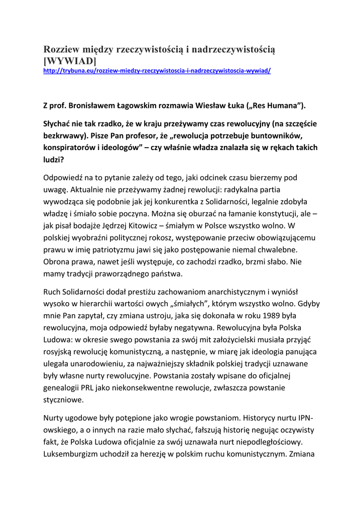 Rozziew między rzeczywistością i nadrzeczywistością [WYWIAD] http://trybuna.eu/rozziew-miedzy-rzeczywistoscia-i-nadrzeczywistoscia-wywiad/ Z prof. Bronisławem Łagowskim rozmawia Wiesław Łuka („Res Humana”). Słychać nie tak rzadko, że w kraju przeżywamy czas rewolucyjny (na szczęście bezkrwawy). Pisze Pan profesor, że „rewolucja potrzebuje buntowników, konspiratorów i ideologów” – czy właśnie władza znalazła się w rękach takich ludzi? Odpowiedź na to pytanie zależy od tego, jaki odcinek czasu bierzemy pod uwagę. Aktualnie nie przeżywamy żadnej rewolucji: radykalna partia wywodząca się podobnie jak jej konkurentka z Solidarności, legalnie zdobyła władzę i śmiało sobie poczyna. Można się oburzać na łamanie konstytucji, ale – jak pisał bodajże Jędrzej Kitowicz – śmiałym w Polsce wszystko wolno. W polskiej wyobraźni politycznej rokosz, występowanie przeciw obowiązującemu prawu w imię patriotyzmu jawi się jako postępowanie niemal chwalebne. Obrona prawa, nawet jeśli występuje, co zachodzi rzadko, brzmi słabo. Nie mamy tradycji praworządnego państwa. Ruch Solidarności dodał prestiżu zachowaniom anarchistycznym i wyniósł wysoko w hierarchii wartości owych „śmiałych”, którym wszystko wolno. Gdyby mnie Pan zapytał, czy zmiana ustroju, jaka się dokonała w roku 1989 była rewolucyjna, moja odpowiedź byłaby negatywna. Rewolucyjna była Polska Ludowa: w okresie swego powstania za swój mit założycielski musiała przyjąć rosyjską rewolucję komunistyczną, a następnie, w miarę jak ideologia panująca ulegała unarodowieniu, za najważniejszy składnik polskiej tradycji uznawane były własne nurty rewolucyjne. Powstania zostały wpisane do oficjalnej genealogii PRL jako niekonsekwentne rewolucje, zwłaszcza powstanie styczniowe. Nurty ugodowe były potępione jako wrogie powstaniom. Historycy nurtu IPNowskiego, a o innych na razie mało słychać, fałszują historię negując oczywisty fakt, że Polska Ludowa oficjalnie za swój uznawała nurt niepodległościowy. Luksemburgizm uchodził za herezję w polskim ruchu komunistycznym. Zmiana ustroju w 1989 roku była więc kontrrewolucją zarówno w sensie ideologicznym jak w realnej polityce społecznej. Reprywatyzacja, której skala i znaczenie są zatajane przed społeczeństwem trwa i rozciąga się na coraz szersze dziedziny. Kontrrewolucja ma swoją logikę, taką samą w Polsce jak – żeby dać przykład najlepiej opisany – we Francji po okresie rewolucyjnym i napoleońskim. Obok zmian własnościowych, przywraca przedrewolucyjny system wartości, na czym najwięcej korzysta religia i Kościół hierarchiczny. To maniakalne cofanie się do przeszłości, jakie uprawia partia aktualnie rządząca, to sztuczne ożywianie dawnych zdarzeń niemających dziś żadnego realnego znaczenia, te lustracje i ekshumacje, są typowe dla kontrrewolucji i restauracji. Znaczącą rolę w kontrrewolucji odgrywa też część warstwy plebejskiej motywowana religijnie, we Francji zwana szuanerią. W Polsce jej wyrazicielem jest głównie radio Maryja, ale nie tylko ono. Jakie błędy w rządzeniu spowodowały, że po ćwierćwieczu liberalnodemokratycznej modernizacji powracamy na polski, odwieczny grunt „szlacheckiego anarchizmu i rozbiorowej traumy”? Tego nie można rozpatrywać w kategorii błędu. Wiele czynników złożyło się na taki a nie inny stosunek sił. Skoro obalenie poprzedniego ustroju, tak zwanej komuny, uznano niemal powszechnie za wydarzenie pobłogosławione przez niebiosa, to partia, która walkę z komuną chce toczyć cały czas i nadać jej najskrajniejszą formę, ma z natury rzeczy najwięcej szans na przejęcie władzy. Partia PiS narzucała obozowi solidarnościowemu swoje poglądy zanim wygrała wybory. Lewica została wyeliminowana nie tylko z Sejmu, ale również z debaty publicznej. Czy dlatego, że popełniła jakieś błędy? Nie. SLD została pozbawiona podmiotowości. Jej przywódcy szczebla krajowego i „baronowie” utracili zdolność samodzielnego myślenia, zakładając, że tę zdolność kiedykolwiek mieli. Rozumne przekonania, spójność poglądów, wierność czterdziestoletniej historii państwa polskiego widziałem u wyborców SLD ale nie u liderów, myślących przeważnie o tym, jak się przystosować do obozu zwycięskiego. Zostać umysłowo zniewolonym to nie jest błąd, to nieszczęście. Czy tak, jak – szukam analogii – społeczeństwom arabskich krajów Bliskiego Wschodu i północnej Afryki trudno zaszczepić ideały demokracji zachodniej, tak nam trudno przezwyciężyć „mitologię i mistyfikację postromantyczną”, które „na margines zepchnęły idee oświeceniowe”? Można by tę analogię rozwijać, ale raczej dla efektu retorycznego. Poznawczo nic ona nie da. Gdy pisze Pan Profesor o aktualnym „rozziewie między rodzimą rzeczywistością i nadrzeczywistością” – to co należy do jednej sfery, a co do drugiej? Definiowanie, czym jest rzeczywistość – może nie jest nam potrzebne, ale pojęcie nadrzeczywistości trzeba objaśnić. Jest to intencjonalnie wykreowana wizja podana masom do wierzenia, poparta zastraszaniem i przekupstwem tak, by ludzie myśleli lub udawali, że myślą, że jeśli nawet nie jest prawdziwa, to jest ważniejsza niż fakty. Znamy zjawisko nadrzeczywistości, „komunizm” czy „socjalizm” to była nadrzeczywistość. Obecnie do nadrzeczywistości należy przekonanie, że „żołnierze wyklęci” stanowią centralne wydarzenie w powojennej historii narodu polskiego; dzięki żołnierzom wyklętym Solidarność obaliła system komunistyczny; powstanie warszawskie, które według „zdrajców” było bezprzykładną katastrofą, w istocie było wzorem patriotyzmu i też się przyczyniło do niepodległości Polski pół wieku później. Ta niepodległość nie dała spodziewanych owoców, ponieważ wskutek Okrągłego Stołu „komuniści razem ze z
