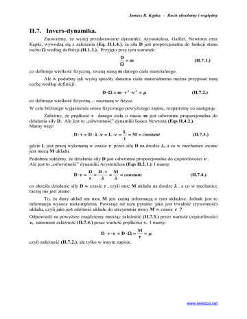 Janusz B. Kępka – Ruch absolutny i względny II.7. Invers-dynamika. Zauważmy, że wyżej przedstawione dynamiki: Arystotelesa, Galilei, Newtona oraz Kępki, wywodzą się z założenia (Eq. II.1.4.), że siła D jest proporcjonalna do funkcji stanu ruchu W według definicji (II.1.3.). Przyjęto przy tym warunek: D =m W (II.7.1.) co definiuje wielkość fizyczną, zwaną masą m danego ciała materialnego. Ale w podobny jak wyżej sposób, danemu ciału materialnemu można przypisać inną cechę według definicji: D × W = m × v 2 ×n 2 = m (II.7.2.) co definiuje wielkość fizyczną… nieznaną w fizyce. W celu bliższego wyjaśnienia sensu fizycznego powyższego zapisu, rozpatrzmy co następuje. Załóżmy, że prędkość v danego ciała o masie m jest odwrotnie proporcjonalna do działania siły D. Ale jest to „odwrotność” dynamiki Isaaca Newtona (Eqs II.4.2.). Mamy więc: L D × v = D × l ×n = L ×n = = M = constant (II.7.3.) t gdzie L jest pracą wykonaną w czasie t przez siłę D na drodze l, a co w mechanice zwane jest mocą M układu. Podobnie załóżmy, że działanie siły D jest odwrotnie proporcjonalne do częstotliwości n . Ale jest to „odwrotność” dynamiki Arystotelesa (Eqs II.2.1.). I mamy: D ×n = D D× v M = = = constant t l l (II.7.4.) co określa działanie siły D w czasie t , czyli moc M układu na drodze l , a co w mechanice raczej nie jest znane. To, że dany układ ma moc M jest cenną informacją o tym układzie. Jednak jest to informacja wysoce niekompletna. Powstaje od razu pytanie: jaka jest trwałość (żywotność) układu, czyli jaka jest zdolność układu do utrzymania mocy M w czasie t ? Odpowiedź na powyższe znajdziemy mnożąc zależność (II.7.3.) przez wartość częstotliwości n, natomiast zależność (II.7.4.) przez wartość prędkości v. I mamy: D × v ×n = D × W = M =m t czyli zależność (II.7.2.), ale tylko w innym zapisie. www.iwiedza.net