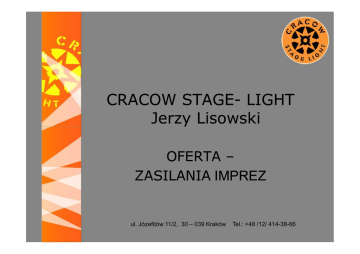 CRACOW STAGESTAGE- LIGHT Jerzy Lisowski OFERTA – ZASILANIA IMPREZ ul. Józefitów 11/2, 30 – 039 Kraków Tel.: +48 /12/ 414-38-66 ZASILANIA IMPREZ PLENEROWYCH: . Jeśli nie wiesz jak doprowadzić energię elektryczną do miejsca koncertu, imprezy, festynu czy pikniku zadzwoń lub napisz do nas: (012) 414414-38 38--66 lub biuro@cs [email protected] light.pl.. Dysponujemy: Dysponujemy • infrastrukturą energetyczną (kable energetyczne do zasilań wysokiej mocy ) • skrzyniami energetyczne tzw. skrzynie RB 400A, 300A, oraz 200A z przekładnikami i licznikami • najazdami kablowymi • dodatkowym osprzętem, rozdzielniami gumowymi, przejściówkami itp. Na Ŝądanie klienta moŜemy podstawić • agregat prądotwórczy kaŜdej mocy Naszym klientom zapewniamy równieŜ • kompleksową obsługę uzgodnień z Zakładem Energetycznym od momentu ustalenia warunków technicznych po podpisanie umowy na dostawę energii ZABEZPIECZALIŚMY INFRASTRUKTURĘ ENERGETYCZNĄ NA IMPREZACH: Na potrzeby tych imprez zabezpieczaliśmy okablowanie, rozdzielnie energetyczne, pomiary, uziemienia. Zapotrzebowanie tych imprez na energię eklektyczną wahało się w poszczególnych latach od 300kW do nawet 1,5 MW ● Sylwester 2006-2008 2006-2008, Kraków - Rynek Główny ● Święto Miasta 2006- 2008 - Rynek Główny, Mały Rynek W tym Koncerty związane z obchodami 750-lecia lokacji Miasta Krakowa – Rynek Główny, Plac Szczepański, Błonia Krakowskie ● ,,Wianki 2007” oraz „Wianki 2008 r.” - imprezę plenerową, Kraków Bulwary Wiślane ● Super widowisko Opery Wrocławskiej - „Napój miłosny” Gaetano Donizetti, Wrocław ● 2005-2008 Wielka Parada Smoków, Kraków GALERIA - SPRZĘT GALERIA REALIZACJA PRZYŁĄCZY I ZASILAŃ ENERGETYCZNYCH Sylwester 2008/2009 – Rynek Główny, Kraków „ Wianki” 2008 - Kraków Obchody Święta Miasta Krakowa VIII Wielka Kosmiczna Parada Smoków KONTAKT Jerzy Lisowski, Lisowski Właściciel Tel. kom. 502 127 247; e-mail: [email protected] Kamila Maciąg, Maciąg Project Manager Tel. kom. 501 157 723; e-mail: [email protected] Biuro: iuro: ul. Józefitów 11/2, 30-039 Kraków e-mail: [email protected] Tel.: +48 /12/ 4143866 Siedziba: Os. Wojskowe 12/11 32- 086 Węgrzce ZAPRASZAMY www.cs--light.pl www.cs