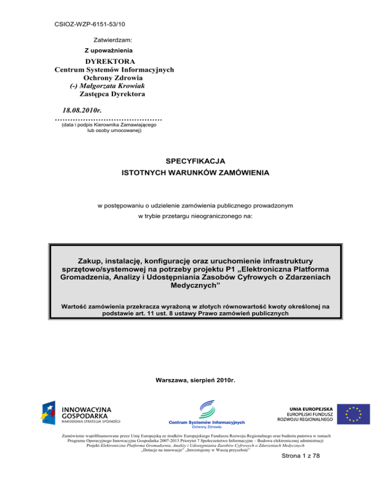 CSIOZ-WZP-6151-53/10 Zatwierdzam: Z upoważnienia DYREKTORA Centrum Systemów Informacyjnych Ochrony Zdrowia (-) Małgorzata Krowiak Zastępca Dyrektora 18.08.2010r. …………………………………… (data i podpis Kierownika Zamawiającego lub osoby umocowanej) SPECYFIKACJA ISTOTNYCH WARUNKÓW ZAMÓWIENIA w postępowaniu o udzielenie zamówienia publicznego prowadzonym w trybie przetargu nieograniczonego na: Zakup, instalację, konfigurację oraz uruchomienie infrastruktury sprzętowo/systemowej na potrzeby projektu P1 „Elektroniczna Platforma Gromadzenia, Analizy i Udostępniania Zasobów Cyfrowych o Zdarzeniach Medycznych” Wartość zamówienia przekracza wyrażoną w złotych równowartość kwoty określonej na podstawie art. 11 ust. 8 ustawy Prawo zamówień publicznych Warszawa, sierpień 2010r. Zamówienie współfinansowane przez Unię Europejską ze środków Europejskiego Funduszu Rozwoju Regionalnego oraz budżet państwa w ramach Projektu Elektroniczna Platforma Gromadzenia, Analizy i Udostępniania Zasobów Cyfrowych o Zdarzeniach Medycznych 7 osi priorytetowej „Społeczeństwo informacyjne – budowa elektronicznej administracji” Programu Operacyjnego Innowacyjna Gospodarka 2007-2013 „Dotacje na innowacje” „Inwestujemy w Waszą przyszłość” Zamówienie współfinansowane przez Unię Europejską ze środków Europejskiego Funduszu Rozwoju Regionalnego oraz budżetu państwa w ramach Programu Operacyjnego Innowacyjna Gospodarka 2007-2013 Priorytet 7 Społeczeństwo Informacyjne – Budowa elektronicznej administracji Projekt Elektroniczna Platforma Gromadzenia, Analizy i Udostępniania Zasobów Cyfrowych o Zdarzeniach Medycznych „Dotacje na innowacje” „Inwestujemy w Waszą przyszłość” Strona 1 z 78 CSIOZ-WZP-6151-53/10 Rozdział I INFORMACJE OGÓLNE I. INFORMACJA O ZAMAWIAJĄCYM Zamawiającym jest Centrum Systemów Informacyjnych Ochrony Zdrowia z siedzibą w Warszawie (kod pocztowy 00-184), ul. St. Dubois 5A. Tel.: (022) 597 09 69 Fax: (022) 597 09 37 II. TRYB UDZIELENIA ZAMÓWIENIA Postępowanie o udzielenie zamówienia publicznego prowadzone jest w trybie przetargu nieograniczonego, na podstawie przepisów Ustawy.) III. OFERTY CZĘŚCIOWE, WARIANTOWE 1. Każdy Wykonawca ma prawo złożyć tylko jedną ofertę. 2. Zamawiający nie dopuszcza możliwości składania ofert częściowych. . 3. Zamawiający nie dopuszcza możliwości składania ofert wariantowych. 4. Zamawiający nie przewiduje zawarcia umowy ramowej. IV. FORMA PRZEKAZYWANIA INFORMACJI, OŚWIADCZEŃ I DOKUMENTÓW W POSTĘPOWANIU 1. Oświadczenia, wnioski, zawiadomienia oraz informacje Zamawiający i Wykonawcy przekazują faksem, lub pisemnie z uwzględnieniem postanowień określonych w pkt. 2 i 3 Wykonawcy są zobowiązani do przekazywania oświadczeń, wniosków, zawiadomień oraz informacji faksem pod nr (022) 597 09 37 w godzinach 8.30-15.30 lub w formie pisemnej na następujący adres Zamawiającego: Centrum Systemów Informacyjnych Ochrony Zdrowia ul. St. Dubois 5A 00-184 Warszawa, Korespondencja dotycząca postępowania postępowania, tj. CSIOZ-WZP-6151-53/10. powinna być oznaczona numerem 2. Forma pisemna zastrzeżona jest dla złożenia oferty wraz z załącznikami, w tym oświadczeń i dokumentów potwierdzających spełnianie warunków udziału w postępowaniu oraz oświadczeń i dokumentów potwierdzających spełnianie przez oferowany przedmiot zamówienia wymagań określonych przez Zamawiającego, a także zmiany lub wycofania oferty. 3. Wykonawca każdorazowo bez wezwania Zamawiającego potwierdza niezwłocznie fakt otrzymania oświadczenia, wniosku, zawiadomienia lub informacji poprzez podpisanie pierwszej strony dokumentu otrzymanego za pośrednictwem faksu i jego odesłania na faks Zamawiającego z jednoczesnym zamieszczeniem na dokumencie daty otrzymania dokumentu. W sytuacji, gdy Wykonawca nie dokona przedmiotowego potwierdzenia Zamawiający domniema, iż określony dokument, wysłany pod numer faksu wskazany Zamówienie współfinansowane przez Unię Europejską ze środków Europejskiego Funduszu Rozwoju Regionalnego oraz budżet państwa w ramach Projektu Elektroniczna Platforma Gromadzenia, Analizy i Udostępniania Zasobów Cyfrowych o Zdarzeniach Medycznych 7 osi priorytetowej „Społeczeństwo informacyjne – budowa elektronicznej administracji” Programu Operacyjnego Innowacyjna Gospodarka 2007-2013 „Dotacje na innowacje” „Inwestujemy w Waszą przyszłość” Zamówienie współfinansowane przez Unię Europejską ze środków Europejskiego Funduszu Rozwoju Regionalnego oraz budżetu państwa w ramach Programu Operacyjnego Innowacyjna Gospodarka 2007-2013 Priorytet 7 Społeczeństwo Informacyjne – Budowa elektronicznej administracji Projekt Elektroniczna Platforma Gromadzenia, Analizy i Udostępniania Zasobów Cyfrowych o Zdarzeniach Medycznych „Dotacje na innowacje” „Inwestujemy w Waszą przyszłość” Strona 2 z 78 CSIOZ-WZP-6151-53/10 przez Wykonawcę, został mu doręczony w sposób umożliwiający Wykonawcy zapoznanie się z treścią dokumentu. 4. Zamawiający na wniosek Wykonawcy potwierdzi niezwłocznie fakt otrzymania oświadczenia, wniosku, zawiadomienia lub informacji poprzez podpisanie pierwszej strony dokumentu otrzymanego za pośrednictwem faksu i jej odesłanie na faks Wykonawcy z jednoczesnym zamieszczeniem na dokumencie daty otrzymania określonego pisma. 5. Jeżeli Wykonawca przekaże oświadczenia, wnioski, zawiadomienia oraz inne informacje faksem i pisemnie, za datę ich złożenia przyjmuje się datę wpływu faksu/oryginału dokumentu do Zamawiającego, w zależności, który z nich wpłynie wcześniej. Dokument uważa się za złożony w terminie, jeżeli jego treść dotarła do adresata przed upływem wyznaczonego terminu. Niniejszy zapis dotyczy również Zamawiającego. 6. Zamawiający będzie udzielał odpowiedzi na pytania Wykonawców dotyczących treści SIWZ złożone za pomocą faksu, lub w for