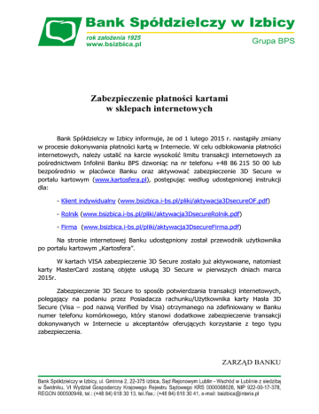 Zabezpieczenie płatności kartami w sklepach internetowych Bank Spółdzielczy w Izbicy informuje, że od 1 lutego 2015 r. nastąpiły zmiany w procesie dokonywania płatności kartą w Internecie. W celu odblokowania płatności internetowych, należy ustalić na karcie wysokość limitu transakcji internetowych za pośrednictwem Infolinii Banku BPS dzwoniąc na nr telefonu +48 86 215 50 00 lub bezpośrednio w placówce Banku oraz aktywować zabezpieczenie 3D Secure w portalu kartowym (www.kartosfera.pl), postępując według udostępnionej instrukcji dla: - Klient indywidualny (www.bsizbica.i-bs.pl/pliki/aktywacja3DsecureOF.pdf) - Rolnik (www.bsizbica.i-bs.pl/pliki/aktywacja3DsecureRolnik.pdf) - Firma (www.bsizbica.i-bs.pl/pliki/aktywacja3DsecureFirma.pdf) Na stronie internetowej Banku udostępniony został przewodnik użytkownika po portalu kartowym „Kartosfera”. W kartach VISA zabezpieczenie 3D Secure zostało już aktywowane, natomiast karty MasterCard zostaną objęte usługą 3D Secure w pierwszych dniach marca 2015r. Zabezpieczenie 3D Secure to sposób potwierdzania transakcji internetowych, polegający na podaniu przez Posiadacza rachunku/Użytkownika karty Hasła 3D Secure (Visa – pod nazwą Verified by Visa) otrzymanego na zdefiniowany w Banku numer telefonu komórkowego, który stanowi dodatkowe zabezpieczenie transakcji dokonywanych w Internecie u akceptantów oferujących korzystanie z tego typu zabezpieczenia. ZARZĄD BANKU