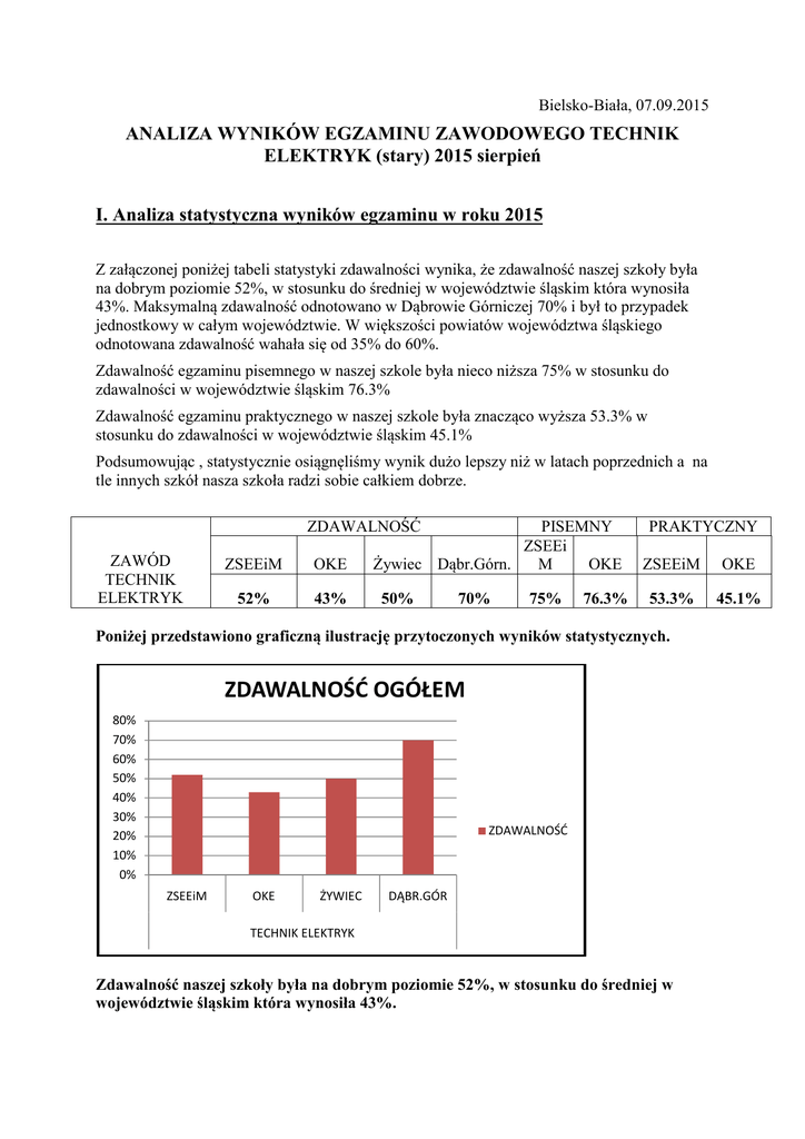 Bielsko-Biała, 07.09.2015 ANALIZA WYNIKÓW EGZAMINU ZAWODOWEGO TECHNIK ELEKTRYK (stary) 2015 sierpień I. Analiza statystyczna wyników egzaminu w roku 2015 Z załączonej poniżej tabeli statystyki zdawalności wynika, że zdawalność naszej szkoły była na dobrym poziomie 52%, w stosunku do średniej w województwie śląskim która wynosiła 43%. Maksymalną zdawalność odnotowano w Dąbrowie Górniczej 70% i był to przypadek jednostkowy w całym województwie. W większości powiatów województwa śląskiego odnotowana zdawalność wahała się od 35% do 60%. Zdawalność egzaminu pisemnego w naszej szkole była nieco niższa 75% w stosunku do zdawalności w województwie śląskim 76.3% Zdawalność egzaminu praktycznego w naszej szkole była znacząco wyższa 53.3% w stosunku do zdawalności w województwie śląskim 45.1% Podsumowując , statystycznie osiągnęliśmy wynik dużo lepszy niż w latach poprzednich a na tle innych szkół nasza szkoła radzi sobie całkiem dobrze. ZDAWALNOŚĆ ZAWÓD TECHNIK ELEKTRYK ZSEEiM OKE 52% 43% PISEMNY ZSEEi Żywiec Dąbr.Górn. M OKE 50% 70% 75% 76.3% PRAKTYCZNY ZSEEiM OKE 53.3% 45.1% Poniżej przedstawiono graficzną ilustrację przytoczonych wyników statystycznych. ZDAWALNOŚĆ OGÓŁEM 80% 70% 60% 50% 40% 30% 20% 10% 0% ZDAWALNOŚĆ ZSEEiM OKE ŻYWIEC DĄBR.GÓR TECHNIK ELEKTRYK Zdawalność naszej szkoły była na dobrym poziomie 52%, w stosunku do średniej w województwie śląskim która wynosiła 43%. ZDAWALNOŚĆ ETAP PISEMNY 100% 90% 80% 70% 60% 50% 40% 30% 20% 10% 0% 76,30% 75% ZDAWALNOŚĆ ETAP PISEMNY ZSEEiM OKE TECHNIK ELEKTRYK Analizując zdawalność części pisemnej w naszej szkole i OKE Jaworzno, należy stwierdzić, że w ZSEEiM była ona o 1.3% niższa od zdawalności w OKE Jaworzno i wynosiła 75% (OKE 76.3%) ZDAWALNOŚĆ ETAP PRAKTYCZNY 100% 90% 80% 70% 60% 50% 40% 30% 20% 10% 0% 53,30% 45,10% ZDAWALNOŚĆ ETAP PRAKTYCZNY ZSEEiM OKE TECHNIK ELEKTRYK Analizując część praktyczną egzaminu w ZSEEiM i OKE Jaworzno, należy zauważyć, że zdawalność w naszej szkole wynosiła 53.3% i była wyższa o 8.2 % w stosunku do OKE Jaworzno (45.1%) II. Słabe strony przygotowania uczniów do egzaminu zawodowego. Część pisemna. Część pisemną zdało 21 uczniów, co w stosunku do 31 uprawnionych do egzaminu stanowi 67,7 %, a w stosunku do 28 przystępujących do egzaminu – 75 % Aby zdać egzamin pisemny wystarczyło odpowiedzieć na 50 % wszystkich pytań czyli na 25 pytań z 50-ciu. Przeanalizowano treśći pytań, na które nie odpowiedziało pozytywnie więcej niż 50 proc. egzaminowanych. Pytania te stanowiły 40 proc. (20 )wszystkich pytań egzaminu pisemnego. Stwierdza się, że egzaminowani uczniowie mieli problemy z następującymi zagadnieniami: - Mało ugruntowana i utrwalona wiedza z przedmiotów zawodowych, matematyki i fizyki. - Generalnie uczniowie mają problemy z dokonywaniem podstawowych obliczeń wielkości elektrycznych w obwodach elektrycznych. - Nie znają niektórych symboli elementów obwodów elektrycznych. - Nie rozpoznają z wyglądu podstawowych elementów i aparatów elektrycznych . - Nie znają podstawowych charakterystyk mechanicznych silników elektrycznych oraz charakterystyk aparatów elektrycznych. -W zakresie ochrony przeciwporażeniowej mają problemy z określeniem przeznaczenia niektórych ochronników napięcia. - Mają trudności z określeniem obciążalności prądowej przewodów elektrycznych. Część praktyczna W części praktycznej uprawnionych do egzaminu było 31 uczniów, przy czym do egzaminu przystąpiło 30 uczniów. Egzamin zdało 16 uczniów co stanowi 51,6 % uprawnionych do egzaminu i 53,3 % przystępujących do egzaminu. Aby zdać egzamin praktyczny należało uzyskać 75 proc. punktów przewidzianych za wykonanie zadania. Zadanie dotyczyło opracowania projektu realizacji prac prowadzących do lokalizacji i usunięcia uszkodzenia powodującego zadziałanie wyłącznika różnicowoprądowego podczas załączania silnika głównego pralki. Ocena elementów egzaminu: I – tytuł pracy egzaminu. – 99 proc. otrzymało maksymalną ilość punktów /3 pkt./ II – założenia do projektu, - 7 osób uzyskało maksymalną ilość punktów /12 pkt./ III – wykaz prawdopodobnych uszkodzeń /max. 19 pkt./ - 5 osób uzyskało maksymalną ilość punktów. IV – opis działań prowadzących do określenia rodzaju i miejsca uszkodzenia /max. 21 pkt./ - 3 osoby uzyskały maksymalną ilość punktów. V – ocena wyników pomiarów /6 pkt./ - 1 osoba uzyskała maksymalną ilość punktów. VI – wnioski dotyczące rodzaju i miejsca uszkodzenia / 16 pkt./ - 17 osób uzyskało maksymalną ilość punktów. VII – zaznaczyć miejsce uszkodzenia /20 pkt./ - 8 osób uzyskało maksimum. VIII – opis sposobu usunięcia uszkodzenia /3 pkt./ - 12 osób uzyskało maksimum. Stwierdza się, że egzaminowani uczniowie mieli problemy z następującymi zagadnieniami: - Mało ugruntowana i utrwalona wiedza z przedmiotów zawodowych, matematyki i fizyki. - Brak umiejętności rozumienia treści zadań praktycznych do realizacji w formie wymaganej na egzaminie praktycznym lub brak odpowiedniej wiedzy. - Brak umiejętności uporządkowanego opisu działań zmierzających do osiągnięcia celu zadaniowego. Do przyczyn tego stanu należałoby zaliczyć: - zbyt mała liczba godzin dydaktycznych przeznaczona na takie przedmioty jak: matematyka, fizyka, przedmioty zawodowe, zajęcia i ćwiczenia praktyczne, praktyki zawodowe zwłaszcza przy niskim merytorycznym przygotowaniu uczniów przychodzących do szkoły - mała ilość godzin dydaktycznych skutkuje rzadkim werbalnym odpytywaniem uczniów, małą liczbą rozwiązywanych zadań tekstowych co jest przyczyną braku umiejętności rozumienia treści zadań i sposobów podejścia do rozwiązywania problemów teoretycznych i praktycznych, - brak motywacji a często i możliwości intelektualnych uczniów do osiągania wyników nauczania pon