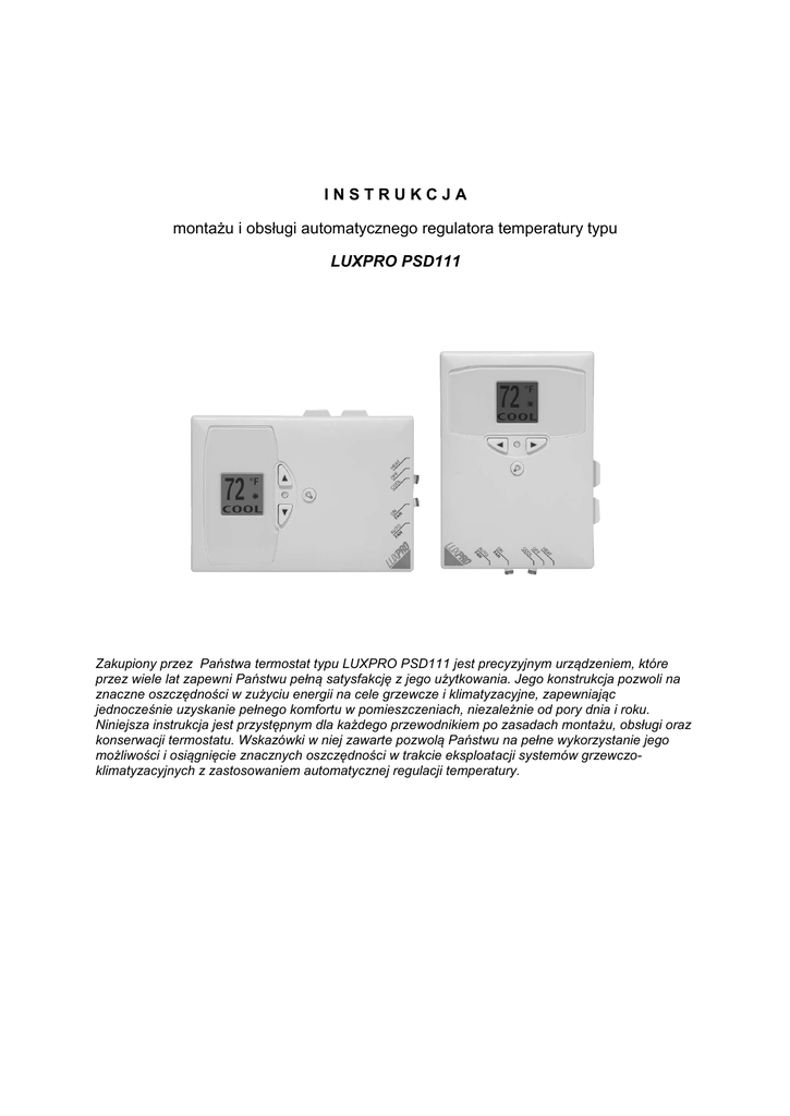 INSTRUKCJA montażu i obsługi automatycznego regulatora temperatury typu LUXPRO PSD111 Zakupiony przez Państwa termostat typu LUXPRO PSD111 jest precyzyjnym urządzeniem, które przez wiele lat zapewni Państwu pełną satysfakcję z jego użytkowania. Jego konstrukcja pozwoli na znaczne oszczędności w zużyciu energii na cele grzewcze i klimatyzacyjne, zapewniając jednocześnie uzyskanie pełnego komfortu w pomieszczeniach, niezależnie od pory dnia i roku. Niniejsza instrukcja jest przystępnym dla każdego przewodnikiem po zasadach montażu, obsługi oraz konserwacji termostatu. Wskazówki w niej zawarte pozwolą Państwu na pełne wykorzystanie jego możliwości i osiągnięcie znacznych oszczędności w trakcie eksploatacji systemów grzewczoklimatyzacyjnych z zastosowaniem automatycznej regulacji temperatury. I. WŁASNOŚCI TERMOSTATU 1. OPIS WŁASNOŚCI Termostat może być wykorzystywany w układach 24-ro woltowego sterowania temperaturą w systemach grzewczo-klimatyzacyjnych z wykorzystaniem elektrycznych, gazowych lub olejowych nagrzewnic powietrza oraz jednostopniowych pomp ciepła. Termostat nie jest przystosowany do stosowania w układach z sieciowym napięciem sterującym oraz w układach wielostopniowych pomp ciepła. Łatwa instalacja Wybór grzanie lub chłodzenie Ustawienie temperatury Panel sterowania termostatem jest bardzo przejrzysty i łatwy w obsłudze. Duży i przejrzysty wyświetlacz ciekłokrystaliczny pokazuje użytkownikowi rzeczywistą i zadaną temperaturę pomieszczenia. Możliwość montażu w układzie pionowym lub poziomym Możliwość zadania określonej czułości termostatu (określenia bezwładności temperaturowej) pozwala na osiągnięcie maksimum komfortu i oszczędności. Zastosowanie opóźniacza (timera) czasowego dla cyklu chłodzenia zabezpiecza przed krótkocykliczną pracą systemu klimatyzacji, co wydatnie wpływa na oszczędność energii i zabezpiecza podzespoły przed nadmiernym zużyciem. 2 Zasilanie termostatu (wyświetlacz oraz sygnał sterujący) realizowane jest z dwóch baterii alkalicznych „AA”. UWAGA! INSTRUKCJĘ NALEŻY DOKŁADNIE PRZECZYTAĆ PRZED ROZPOCZĘCIEM INSTALOWANIA I OBSŁUGI TERMOSTATU. NIE NISZCZYĆ! PAMIĘTAJ!! NINIEJSZA INSRUKCJA ZAWIERA INFORMACJE, KTÓRE MOGĄ WYKRACZAĆ POZA AKTUALNE MOŻLIWOŚCI TWOJEGO SYTEMU. JEDNAK W PRZYSZŁOŚCI MOŻE ZOSTAĆ ROZBUDOWANY I WÓWCZAS POJAWI SIĘ KONIECZNOŚĆ PONOWNEGO SKORZYSTANIA Z INSTRUKCJI. OSTRZEŻENIE ! Termostat jest precyzyjnym i delikatnym urządzeniem, z którym należy obchodzić się delikatnie. Przed montażem lub serwisem termostatu należy odłączyć zasilanie od wszystkich elementów systemu. Włączenie zasilania może nastąpić dopiero po zakończeniu prac. Nie należy spinać na krótko układu sterowania w celu sprawdzenia działania systemu grzewczego lub klimatyzacyjnego. Może to spowodować uszkodzenie termostatu i utratę gwarancji. Termostat jest przeznaczony do pracy z 24-ro voltowym napięciem sterującym. Maksymalna, dopuszczalna wartość natężenia prądu wynosi 1,5 [A]. Wyższy amperaż może spowodować uszkodzenie termostatu. 3 II. MONTAŻ TERMOSTATU UWAGA! Dla zapobieżenia możliwości wystąpienia porażenia prądem elektrycznym oraz zabezpieczenia modułów systemu grzewczo-klimatyzacyjnego (m.in. nagrzewnicy i klimatyzatora) przed przypadkowym uszkodzeniem należy odłączyć napięcie zasilające przed przystąpieniem do montażu. Odcięcia zasilania można dokonać wyłącznikiem (jeśli istnieje) lub poprzez wykręcenie bezpiecznika. Przed przystąpieniem do montażu przeczytaj dokładnie instrukcję 1. POPRAWNE USYTUOWANIE TERMOSTATU NA ŚCIANIE Przy wyborze miejsca montażu termostatu kieruj się następującymi wskazówkami: Umieść termostat najlepiej na ścianie wewnętrznej, na wysokości około 1,5 metra od poziomu podłogi w pomieszczeniu, które jest najczęściej użytkowane lub pomieszczeniu o reprezentatywnej dla systemu temperaturze (np. hall) Nie instaluj termostatu w pobliżu źródeł ciepła (nasłonecznione ściana, w pobliżu lamp, telewizora, grzejnika, lodówki, przewodów wodnych c.w.u., kratek nawiewnych itp.) Nie instaluj termostatu na ścianie sąsiadującej z nieogrzewanym pomieszczeniem oraz w pobliżu okna i drzwi zewnętrznych. Nie instaluj termostatu w pomieszczeniu, gdzie panuje wysoka wilgotność powietrza. Spowoduje to przyspieszone zużycie elementów programatora. Nie instaluj termostatu w miejscach o osłabionej cyrkulacji powietrza (narożniki pomieszczeń, za otwartymi drzwiami). Spowoduje to przekłamania w odczycie rzeczywistej temperatury pomieszczenia. Nie instaluj termostatu do momentu, aż wszystkie prace wykończeniowe (tynkowanie, malowanie ścian) nie będą zakończone Termostat ten nie wymaga poziomowania podczas montażu. 2. MONTAŻ TERMOSTATU NA ŚCIANIE Zdejmij koszulkę izolacyjną z końcówek przewodów sterujących na długości około 10 mm Przy użyciu dowolnego materiału (np. gips) wykończ otwór powstały w ścianie na przewody sterujące. Oddziel korpus termostatu od podstawy bazowej po naciśnięciu przycisków na obudowie termostatu. UWAGA! Bądź ostrożny podczas tej czynności. Uważaj, żeby nie uszkodzić układów elektronicznych. Nie zostawiaj rozdzielonego termostatu, jeśli nie jest to konieczne. 4 Przyłóż podstawę bazową do ściany w wybranym miejscu. Zaznacz na ścianie dwa punkty. Wywierć w wyznaczonych punktach otwory wiertłem o średnicy 4,8 mm Po wywierceniu włóż plastikowe kołki w ścianę, przyłóż podstawę i przykręć do ściany wkrętami. Przytrzymaj podstawę bazową przy ścianie i przełóż kable sterujące przez otwór montażowy tak, aby można je swobodnie przyłączyć do portów. UWAGA! Odizolowane końcówki kabli sterujących nie mogą stykać się pomiędzy sobą oraz nie mogą dotykać obudowy termostatu. Podłączenie kabli powinno być wykonane zgodnie z powyższym rysunkiem. Przed uruchomieniem systemu n