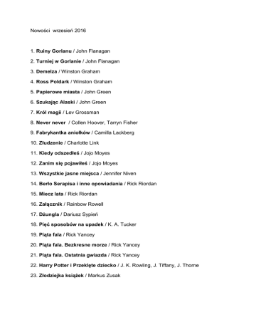 Nowości wrzesień 2016 1. Ruiny Gorlanu / John Flanagan 2. Turniej w Gorlanie / John Flanagan 3. Demelza / Winston Graham 4. Ross Poldark / Winston Graham 5. Papierowe miasta / John Green 6. Szukając Alaski / John Green 7. Król magii / Lev Grossman 8. Never never / Collen Hoover, Tarryn Fisher 9. Fabrykantka aniołków / Camilla Lackberg 10. Złudzenie / Charlotte Link 11. Kiedy odszedłeś / Jojo Moyes 12. Zanim się pojawiłeś / Jojo Moyes 13. Wszystkie jasne miejsca / Jennifer Niven 14. Berło Serapisa i inne opowiadania / Rick Riordan 15. Miecz lata / Rick Riordan 16. Załącznik / Rainbow Rowell 17. Dżungla / Dariusz Sypień 18. Pięć sposobów na upadek / K. A. Tucker 19. Piąta fala / Rick Yancey 20. Piąta fala. Bezkresne morze / Rick Yancey 21. Piąta fala. Ostatnia gwiazda / Rick Yancey 22. Harry Potter i Przeklęte dziecko / J. K. Rowling, J. Tiffany, J. Thorne 23. Złodziejka książek / Markus Zusak