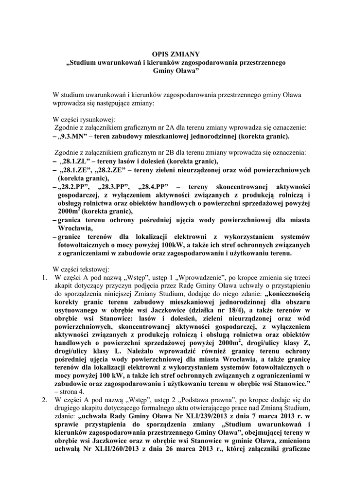 OPIS ZMIANY „Studium uwarunkowań i kierunków zagospodarowania przestrzennego Gminy Oława” W studium uwarunkowań i kierunków zagospodarowania przestrzennego gminy Oława wprowadza się następujące zmiany: W części rysunkowej: Zgodnie z załącznikiem graficznym nr 2A dla terenu zmiany wprowadza się oznaczenie: − „9.3.MN” – teren zabudowy mieszkaniowej jednorodzinnej (korekta granic). Zgodnie z załącznikiem graficznym nr 2B dla terenu zmiany wprowadza się oznaczenia: − „28.1.ZL” – tereny lasów i dolesień (korekta granic), − „28.1.ZE”, „28.2.ZE” – tereny zieleni nieurządzonej oraz wód powierzchniowych (korekta granic), − „28.2.PP”, „28.3.PP”, „28.4.PP” – tereny skoncentrowanej aktywności gospodarczej, z wyłączeniem aktywności związanych z produkcją rolniczą i obsługą rolnictwa oraz obiektów handlowych o powierzchni sprzedażowej powyżej 2000m2 (korekta granic), − granica terenu ochrony pośredniej ujęcia wody powierzchniowej dla miasta Wrocławia, − granice terenów dla lokalizacji elektrowni z wykorzystaniem systemów fotowoltaicznych o mocy powyżej 100kW, a także ich stref ochronnych związanych z ograniczeniami w zabudowie oraz zagospodarowaniu i użytkowaniu terenu. W części tekstowej: 1. W części A pod nazwą „Wstęp”, ustęp 1 „Wprowadzenie”, po kropce zmienia się trzeci akapit dotyczący przyczyn podjęcia przez Radę Gminy Oława uchwały o przystąpieniu do sporządzenia niniejszej Zmiany Studium, dodając do niego zdanie: „koniecznością korekty granic terenu zabudowy mieszkaniowej jednorodzinnej dla obszaru usytuowanego w obrębie wsi Jaczkowice (działka nr 18/4), a także terenów w obrębie wsi Stanowice: lasów i dolesień, zieleni nieurządzonej oraz wód powierzchniowych, skoncentrowanej aktywności gospodarczej, z wyłączeniem aktywności związanych z produkcją rolniczą i obsługą rolnictwa oraz obiektów handlowych o powierzchni sprzedażowej powyżej 2000m2, drogi/ulicy klasy Z, drogi/ulicy klasy L. Należało wprowadzić również granicę terenu ochrony pośredniej ujęcia wody powierzchniowej dla miasta Wrocławia, a także granicę terenów dla lokalizacji elektrowni z wykorzystaniem systemów fotowoltaicznych o mocy powyżej 100 kW, a także ich stref ochronnych związanych z ograniczeniami w zabudowie oraz zagospodarowaniu i użytkowaniu terenu w obrębie wsi Stanowice.” – strona 4. 2. W części A pod nazwą „Wstęp”, ustęp 2 „Podstawa prawna”, po kropce dodaje się do drugiego akapitu dotyczącego formalnego aktu otwierającego prace nad Zmianą Studium, zdanie: „uchwała Rady Gminy Oława Nr XLI/239/2013 z dnia 7 marca 2013 r. w sprawie przystąpienia do sporządzenia zmiany „Studium uwarunkowań i kierunków zagospodarowania przestrzennego Gminy Oława”, obejmującej tereny w obrębie wsi Jaczkowice oraz w obrębie wsi Stanowice w gminie Oława, zmieniona uchwałą Nr XLII/260/2013 z dnia 26 marca 2013 r., której załączniki graficzne 3. 4. stanowiące integralną część uchwały przedstawiają granice obszaru objętego zmianą Studium” – strona 8. W części A pod nazwą „Wstęp”, ustęp 2 „Podstawa prawna”, dodaje się do ostatniego akapitu punkt 12: Zespół autorski zmiany „Studium uwarunkowań i kierunków zagospodarowania przestrzennego Gminy Oława”: 1) dla działki nr 250 położonej w obrębie wsi Sobocisko oraz działki nr 126 położonej w obrębie wsi Oleśnica Mała, 2) dla działek o nr 1425/2, 1424 położonych w obrębie wsi Bystrzyca, 3) dla działek o nr 257/11, 257/12, 257/10 położonych w obrębie wsi Marcinkowice oraz działek o nr 87/1, 88/4, 88/6, 88/7 położonych w obrębie wsi Oleśnica Mała, 4) dla działki nr 72 położonej w obrębie wsi Jankowice Małe, 5) dla działki nr 23/1 położonej w obrębie wsi Stanowice, 6) dla działki nr 18/1 położonej w obrębie wsi Jaczkowice, 7) dla działki nr 822/3 położonej w obrębie wsi Godzikowice, 8) dla działek o nr 218/4, 342/3, 343/1, 343/2 położonych w obrębie wsi Bystrzyca, 9) dla działki nr 159/2 położonej w obrębie wsi Owczary, 10) dla terenu obrębów wsi Siedlce i Zakrzów, 11) dla zmiany wysokości elektrowni wiatrowych ze 140 m na 210 m dla terenów rozwoju elektrowni wiatrowych w okolicach miejscowości Osiek, Chwalibożyce, Jankowice Małe, Owczary, Oleśnica Mała, Niemil, Drzemlikowice, 12) dla lokalizacji elektrowni wiatrowych w obrębie wsi Psary, 13) dla zmiany przebiegu linii elektroenergetycznej napowietrznej wysokiego napięcia 400 kV wraz ze strefą techniczną od linii elektroenergetycznej o szerokości 70 m, 14) dla działek nr 326/6 i 326/8 wraz z przyległą drogą położonych w obrębie wsi Gaj Oławski oraz działki nr 27 wraz z przyległymi drogami położonej w obrębie wsi Bolechów, 15) dla lokalizacji elektrowni wiatrowych oraz elektrowni z wykorzystaniem systemów fotowoltaicznych w obrębie wsi Niwnik i Bolechów, „16) dla lokalizacji elektrowni wiatrowych oraz elektrowni z wykorzystaniem systemów fotowoltaicznych w obrębie wsi Gaj Oławski, Jaczkowice, Godzinowice i Niwnik”, 17) dla działki nr 18/4 położonej w obrębie wsi Jaczkowice oraz terenów w obrębie wsi Stanowice, w tym terenów ochrony pośredniej ujęcia wody powierzchniowej dla miasta Wrocławia, a także terenów dla lokalizacji elektrowni z wykorzystaniem systemów fotowoltaicznych: - mgr inż. Wojciech Kotla, nr czł. ZOIU Z-398, - mgr inż. Grzegorz Szewczyk, nr czł. ZOIU Z-410, - mgr inż. Rafał Odachowski, - mgr inż. Monika Krużołek – strony 9 - 10. W części A pod nazwą „Wstęp”, ustęp 3 „Cele Studium”, po kropce zmienia się ostatni akapit dotyczący celu przeprowadzenia Zmiany Studium, dodając do niego zdanie: „wprowadzenie korekty granic terenu zabudowy mieszkaniowej jednorodzinnej dla obszaru usytuowanego w obrębie wsi Jaczkowice, a także terenów w obrębie wsi Stanowice: lasów i dolesień, zielen