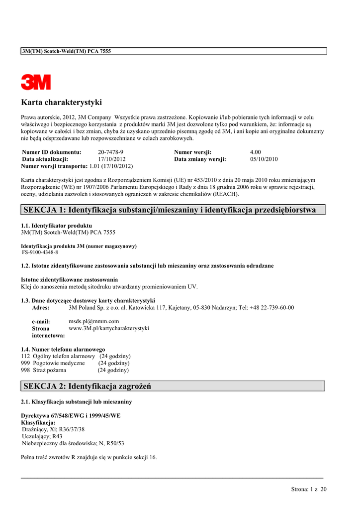 3M(TM) Scotch-Weld(TM) PCA 7555 Karta charakterystyki Prawa autorskie, 2012, 3M Company Wszystkie prawa zastrzeżone. Kopiowanie i/lub pobieranie tych informacji w celu właściwego i bezpiecznego korzystania z produktów marki 3M jest dozwolone tylko pod warunkiem, że: informacje są kopiowane w całości i bez zmian, chyba że uzyskano uprzednio pisemną zgodę od 3M, i ani kopie ani oryginalne dokumenty nie będą odsprzedawane lub rozpowszechniane w celach zarobkowych. 20-7478-9 Numer ID dokumentu: 17/10/2012 Data aktualizacji: Numer wersji transportu: 1.01 (17/10/2012) Numer wersji: Data zmiany wersji: 4.00 05/10/2010 Karta charakterystyki jest zgodna z Rozporządzeniem Komisji (UE) nr 453/2010 z dnia 20 maja 2010 roku zmieniającym Rozporządzenie (WE) nr 1907/2006 Parlamentu Europejskiego i Rady z dnia 18 grudnia 2006 roku w sprawie rejestracji, oceny, udzielania zazwoleń i stosowanych ograniczeń w zakresie chemikaliów (REACH). SEKCJA 1: Identyfikacja substancji/mieszaniny i identyfikacja przedsiębiorstwa 1.1. Identyfikator produktu 3M(TM) Scotch-Weld(TM) PCA 7555 Identyfikacja produktu 3M (numer magazynowy) FS-9100-4348-8 1.2. Istotne zidentyfikowane zastosowania substancji lub mieszaniny oraz zastosowania odradzane Istotne zidentyfikowane zastosowania Klej do nanoszenia metodą sitodruku utwardzany promieniowaniem UV. 1.3. Dane dotyczące dostawcy karty charakterystyki 3M Poland Sp. z o.o. al. Katowicka 117, Kajetany, 05-830 Nadarzyn; Tel: +48 22-739-60-00 Adres: [email protected] e-mail: www.3M.pl/kartycharakterystyki Strona internetowa: 1.4. Numer telefonu alarmowego 112 Ogólny telefon alarmowy (24 godziny) 999 Pogotowie medyczne (24 godziny) 998 Straż pożarna (24 godziny) SEKCJA 2: Identyfikacja zagrożeń 2.1. Klasyfikacja substancji lub mieszaniny Dyrektywa 67/548/EWG i 1999/45/WE Klasyfikacja: Drażniący, Xi; R36/37/38 Uczulający; R43 Niebezpieczny dla środowiska; N, R50/53 Pełna treść zwrotów R znajduje się w punkcie sekcji 16. __________________________________________________________________________________________ Strona: 1 z 20 3M(TM) Scotch-Weld(TM) PCA 7555 2.2. Elementy oznakowania Dyrektywa 67/548/EWG i 1999/45/WE Symbole Drażniący Niebezpieczny dla środowiska Zawiera: Tlenek bis(2,4,6-trimetylobenzoilo)fenylofosfiny; Fenyloglioksylan Zwroty wskazujące rodzaj zagrożenia: R36/37/38 Działa drażniąco na oczy, drogi oddechowe i skórę. R43 Może powodować uczulenie w kontakcie ze skórą. R50/53 Działa bardzo toksycznie na organizmy wodne; może powodować długo utrzymujące się niekorzystne zmiany w środowisku wodnym. Zwroty określające warunki bezpiecznego stosowania: S24 Unikać zanieczyszczenia skóry. S37 Nosić odpowiednie rękawice ochronne. S61 Unikać zrzutów do środowiska. Postępować zgodnie z instrukcją lub kartą charakterystyki. 2.3. Inne zagrożenia Nieznane SEKCJA 3: Skład/informacja o składnikach Nazwa substancji Polimer akrylowy Nr CAS Tajemnica handlowa Nr WE Brak Akrylan izooktylu 29590-42-9 EINECS 249707-8 Stężenie % 30 - 40 25 - 35 Żywica węglowodorowa Mieszanina Brak 10 - 20 Akrylan izobornylu 5888-33-5 EINECS 227561-6 5 - 15 Fenyloglioksylan Mieszanina Brak 1- 5 Klasyfikacja Substancja niesklasyfikowana jako niebezpieczna Xi:R36-37-38; N:R50/53 (EU) Skin Irrit. 2, H315; Eye Irrit. 2, H319; STOT SE 3, H335; Aquatic Acute 1, H400,M=1; Aquatic Chronic 1, H410,M=1 (CLP) Substancja niesklasyfikowana jako niebezpieczna Xi:R36-37-38; N:R50 (Klasyfikacja 3M) Skin Irrit. 2, H315; Eye Irrit. 2, H319; STOT SE 3, H335; Aquatic Acute 1, H400,M=1 (Klasyfikacja 3M) Substancja niesklasyfikowana __________________________________________________________________________________________ Strona: 2 z 20 3M(TM) Scotch-Weld(TM) PCA 7555 jako niebezpieczna 2-Hydroksy-2-metylo-1-fenylo-1-propanon 7473-98-5 EINECS 231272-0 1- 5 Xn:R22 (Klasyfikacja 3M) Acute Tox. 4, H302 (Klasyfikacja 3M) Substancja niesklasyfikowana jako niebezpieczna Produkt reakcji dichlorodimetylosilanu z krzemionką 68611-44-9 EINECS 271893-4 0,25 - 5 Ciekły polimer Tajemnica handlowa Brak 1- 5 Substancja niesklasyfikowana jako niebezpieczna Tlenek bis(2,4,6trimetylobenzoilo)fenylofosfiny 162881-26-7 ELINCS 4233405 0,5 - 5 R43; R53 (EU) Alifatyczny eter polioksyetylenu Tajemnica handlowa Brak 0,1 - 1,5 Kwas akrylowy 79-10-7 EINECS 201177-9 0,2 - 1 Toluen 108-88-3 EINECS 203- < 0,4 625-9 Skin Sens. 1, H317; Aquatic Chronic 4, H413 (CLP) Substancja niesklasyfikowana jako niebezpieczna C:R35; Xn:R20-21-22; N:R50; R10 - Nota D (EU) Flam. Liq. 3, H226; Acute Tox. 3, H311; Acute Tox. 4, H332; Acute Tox. 4, H302; Skin Corr. 1A, H314; STOT SE 3, H335; Aquatic Acute 1, H400,M=1 Nota D (CLP) Aquatic Chronic 2, H411 (Klasyfikacja 3M) Repr.Cat.3:R63; F:R11; Xn:R48/20; Xn:R65; Xi:R38; R67 - Nota 4 (EU) Flam. Liq. 2, H225; Asp. Tox. 1, H304; Skin Irrit. 2, H315; Repr. 2, H361d; STOT SE 3, H336; STOT RE 1, H372 (CLP) Wykaz zwrotów R i H, wskazujących kategorię niebezpieczeństwa, które zamieszczono w punkcie 3 karty charakterystyki oraz ich pełne brzmienie zamieszczono w punkcie 16 niniejszej karty. W celu uzyskania informacji o zastosowanych notach należy zapoznać się z informacjami zawartymi w sekcji 15. Informacje dotyczące najwyższych dopuszczalnych stężeń i substancji PBT i vPvB znajdują się w sekcji 8 i 12 karty charakterystyki. SEKCJA 4: Środki pierwszej pomocy 4.1. Opis środków pierwszej pomocy Kontakt z oczami Natychmiast płukać dużą ilością wody. Wyjąć soczewki kontaktowe, jeżeli są i można je łatwo usunąć. Nadal płukać. Skontaktować się z lekarzem. Kontakt ze skórą Natychmiast przemyć dużą ilością wody z mydłem. Zanieczyszczone ubranie i buty wyczyścić przed ponownym użyciem. __________________________________________________________________________________________ Strona: 3 z 20 3M(TM) Scotch-Weld(TM) PCA 7555 Jeżeli objawy narażenia wystąpią, skontaktować się z lekarzem. Drogi oddechowe Jeżeli objawy nara