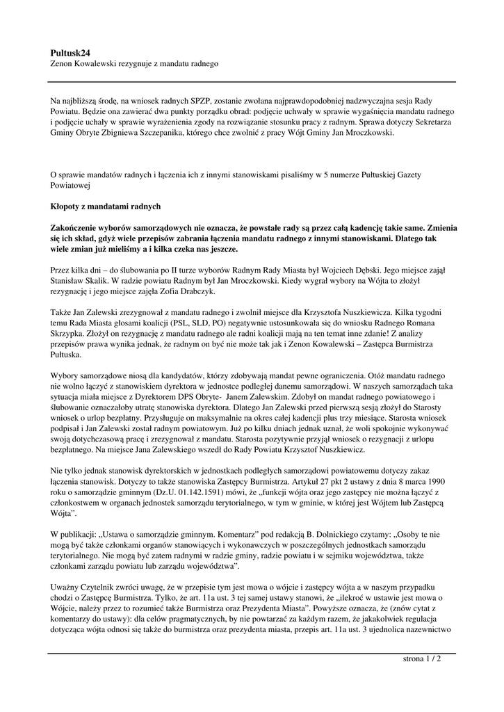 Pultusk24 Zenon Kowalewski rezygnuje z mandatu radnego Na najbliższą środę, na wniosek radnych SPZP, zostanie zwołana najprawdopodobniej nadzwyczajna sesja Rady Powiatu. Będzie ona zawierać dwa punkty porządku obrad: podjęcie uchwały w sprawie wygaśnięcia mandatu radnego i podjęcie uchały w sprawie wyrażenienia zgody na rozwiązanie stosunku pracy z radnym. Sprawa dotyczy Sekretarza Gminy Obryte Zbigniewa Szczepanika, którego chce zwolnić z pracy Wójt Gminy Jan Mroczkowski. O sprawie mandatów radnych i łączenia ich z innymi stanowiskami pisaliśmy w 5 numerze Pułtuskiej Gazety Powiatowej Kłopoty z mandatami radnych Zakończenie wyborów samorządowych nie oznacza, że powstałe rady są przez całą kadencję takie same. Zmienia się ich skład, gdyż wiele przepisów zabrania łączenia mandatu radnego z innymi stanowiskami. Dlatego tak wiele zmian już mieliśmy a i kilka czeka nas jeszcze. Przez kilka dni – do ślubowania po II turze wyborów Radnym Rady Miasta był Wojciech Dębski. Jego miejsce zajął Stanisław Skalik. W radzie powiatu Radnym był Jan Mroczkowski. Kiedy wygrał wybory na Wójta to złożył rezygnację i jego miejsce zajęła Zofia Drabczyk. Także Jan Zalewski zrezygnował z mandatu radnego i zwolnił miejsce dla Krzysztofa Nuszkiewicza. Kilka tygodni temu Rada Miasta głosami koalicji (PSL, SLD, PO) negatywnie ustosunkowała się do wniosku Radnego Romana Skrzypka. Złożył on rezygnację z mandatu radnego ale radni koalicji mają na ten temat inne zdanie! Z analizy przepisów prawa wynika jednak, że radnym on być nie może tak jak i Zenon Kowalewski – Zastępca Burmistrza Pułtuska. Wybory samorządowe niosą dla kandydatów, którzy zdobywają mandat pewne ograniczenia. Otóż mandatu radnego nie wolno łączyć z stanowiskiem dyrektora w jednostce podległej danemu samorządowi. W naszych samorządach taka sytuacja miała miejsce z Dyrektorem DPS Obryte- Janem Zalewskim. Zdobył on mandat radnego powiatowego i ślubowanie oznaczałoby utratę stanowiska dyrektora. Dlatego Jan Zalewski przed pierwszą sesją złożył do Starosty wniosek o urlop bezpłatny. Przysługuje on maksymalnie na okres całej kadencji plus trzy miesiące. Starosta wniosek podpisał i Jan Zalewski został radnym powiatowym. Już po kilku dniach jednak uznał, że woli spokojnie wykonywać swoją dotychczasową pracę i zrezygnował z mandatu. Starosta pozytywnie przyjął wniosek o rezygnacji z urlopu bezpłatnego. Na miejsce Jana Zalewskiego wszedł do Rady Powiatu Krzysztof Nuszkiewicz. Nie tylko jednak stanowisk dyrektorskich w jednostkach podległych samorządowi powiatowemu dotyczy zakaz łączenia stanowisk. Dotyczy to także stanowiska Zastępcy Burmistrza. Artykuł 27 pkt 2 ustawy z dnia 8 marca 1990 roku o samorządzie gminnym (Dz.U. 01.142.1591) mówi, że „funkcji wójta oraz jego zastępcy nie można łączyć z członkostwem w organach jednostek samorządu terytorialnego, w tym w gminie, w której jest Wójtem lub Zastępcą Wójta”. W publikacji: „Ustawa o samorządzie gminnym. Komentarz” pod redakcją B. Dolnickiego czytamy: „Osoby te nie mogą być także członkami organów stanowiących i wykonawczych w poszczególnych jednostkach samorządu terytorialnego. Nie mogą być zatem radnymi w radzie gminy, radzie powiatu i w sejmiku województwa, także członkami zarządu powiatu lub zarządu województwa”. Uważny Czytelnik zwróci uwagę, że w przepisie tym jest mowa o wójcie i zastępcy wójta a w naszym przypadku chodzi o Zastępcę Burmistrza. Tylko, że art. 11a ust. 3 tej samej ustawy stanowi, że „ilekroć w ustawie jest mowa o Wójcie, należy przez to rozumieć także Burmistrza oraz Prezydenta Miasta”. Powyższe oznacza, że (znów cytat z komentarzy do ustawy): dla celów pragmatycznych, by nie powtarzać za każdym razem, że jakakolwiek regulacja dotycząca wójta odnosi się także do burmistrza oraz prezydenta miasta, przepis art. 11a ust. 3 ujednolica nazewnictwo strona 1 / 2 Pultusk24 Zenon Kowalewski rezygnuje z mandatu radnego organów wykonawczych gmin, stanowiąc, że za każdym razem, gdy w przepisach ustawy będzie mowa o wójcie, to rozumieć przez to należy także odpowiednio burmistrza miasta oraz prezydenta miasta”. Ustawa więc zabrania łączenia tych dwóch funkcji. Rozmawialiśmy w tej sprawie z Zenonem Kowalewskim – Zastępcą Burmistrza Pułtuska. Powiedział nam, że na podjęcie decyzji ma 3 miesiące od ślubowania a zatem zostało mu jeszcze trochę czasu (pierwsza sesja była 30 listopada a termin upływa z końcem lutego). Nie chciał już dziś powiedzieć czy zrezygnuje z mandatu radnego czy stanowiska Zastępcy Burmistrza Pułtuska. Analizując wyrok Naczelnego Sądu Administracyjnego z dnia 13 października 2005 r. II OSK 61/2005 wydaje się jednak, że prawo nie pozwala na wybór: 1.Przepis art. 24b ust. 1 ustawy z dnia 8 marca 1990 r. o samorządzie gminnym (Dz. U. 2001 r. Nr 142 poz. 1591 ze zm.) ma charakter bezwzględnie obowiązujący, co oznacza, że naruszenie zawartego w nim zakazu łączenia stanowisk skutkuje na podstawie art. 190 ust. 1 pkt 2a ustawy z dnia 16 lipca 1998 r. - Ordynacja wyborcza do rad gmin, rad powiatów i sejmików województw (Dz. U. 1998 r. Nr 95 poz. 602 ze zm.) wygaśnięciem mandatu radnego. Niezłożenie natomiast w terminie wniosku, o którym mowa w art. 24b ust. 5 ustawy o samorządzie gminnym, równoznaczne jest ze zrzeczeniem się mandatu. Bardzo skomplikowana wydaje się sytuacja Radnego Romana Skrzypka. Jak wiemy złożył on rezygnację z mandatu której Rada Miasta nie przyjęła. Wydaje się jednak, że radni koalicji nie mieli podstaw prawnych by się tym tematem w ogóle zajmować. W LexPolonica nr 2124802 - Orzecznictwo w Sprawach Samorządowych 2008/1 poz. 15 czytamy bowiem: 1. Osoba, która przed dniem wyboru na radnego pełniła funkcję wicedyrektora zespołu szkół, była obowiązana przed przystąpieniem do wykonywania mand