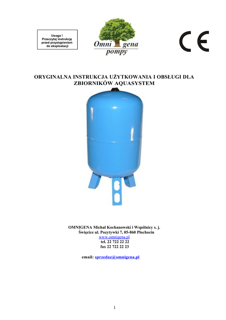 Uwaga ! Przeczytaj instrukcję przed przystąpieniem do eksploatacji ORYGINALNA INSTRUKCJA UŻYTKOWANIA I OBSŁUGI DLA ZBIORNIKÓW AQUASYSTEM OMNIGENA Michał Kochanowski i Wspólnicy s. j. Święcice ul. Pozytywki 7, 05-860 Płochocin www.omnigena.pl tel. 22 722 22 22 fax 22 722 22 23 email: [email protected] 1 WPROWADZENIE Dziękujemy za wybór zbiornika AQUASYSTEM dystrybuowanego przez firmę OMNIGENA. Mamy nadzieję, że dzięki lekturze niniejszej instrukcji dokonacie Państwo wyboru właściwych parametrów zbiornika i będziecie obeznani z zasadami bezpieczeństwa podczas pracy ze zbiornikiem oraz z jego parametrami technicznymi i z zasadami użytkowania. ZASTOSOWANIE Zbiorniki ciśnieniowe wykorzystywane są w domowych instalacjach wodociągowych, przepompowniach, przemysłowych stacjach wodociągowych itp. Mogą współpracować z wszystkimi typami pomp, których parametry odpowiadają parametrom zbiornika takim jak jego pojemność, maksymalne ciśnienie robocze. Zastosowanie zbiorników ciśnieniowych powoduje stabilizację ciśnienia wody oraz zwiększenie czynnej objętości instalacji wodociągowej. W efekcie rośnie żywotność całej instalacji wodociągowej w tym przede wszystkim pomp. OBSŁUGA I KONSERWACJA W zbiorniku zainstalowano elastyczna przeponę (worek ze specjalnej gumy), który rozdziela przestrzeń w zbiorniku na dwie części. W przeponie magazynowana jest woda. Między przeponą a ścianami zbiornika wtłoczone jest powietrze pod ciśnieniem. Zbiorniki o objętości 50l-150l napełnione są fabrycznie powietrzem o ciśnieniu 1.5 bar, zbiorniki o objętości 200l-500l ciśnieniem 2 bar a zbiorniki 1000l 4 bar. Jeżeli ciśnienie powietrza jest większe lub mniejsze od podanej wartości to należy je doprowadzić do właściwego poziomu za pomocą pompki samochodowej lub sprężarki. Ciśnienie powietrza należy okresowo sprawdzać (średnio raz na pół roku). Do pomiaru ciśnienia powietrza w zbiornikach można używać manometru służącego do pomiaru ciśnienia w kołach samochodowych. 2 Do sprawdzania, uzupełniania lub spuszczania powietrza należy wykorzystać zainstalowany specjalny wentyl (pozycja 3) w tylnej lub w górnej części zbiornika. Regulację ciśnienia w zbiorniku należy przeprowadzić po wyłączeniu pompy z sieci elektrycznej i spuszczeniu wody z instalacji i pozostawiając ją otwartą poprzez odkręcone krany. Dotyczy to sytuacji jeżeli zbiornik pracuje jako zestaw hydroforowy czyli z pompą. W zbiornikach o pojemności 100L i większych w górnej części zbiornika (patrz rys.1 poz. Nr 5) i tylnej części zbiornika (rys. 2 poz. nr 5) oprócz wentyla znajduje się specjalny króciec. W przypadku zbiorników firmy AQUASYSTEM króciec jest z gwintem wewnętrznym ½” i gwintem zewnętrznym ¾”. Przed rozpoczęciem użytkowania bezwzględnie należy ten króciec zaślepić odpowiednim korkiem, ewentualnie zamontować na ten króciec zawór bezpieczeństwa lub manometr który będzie mierzył ciśnienie wody w zbiorniku. Jeżeli króćca się nie zaślepi dojdzie do zalania pomieszczenia, w którym znajduje się zbiornik. UWAGA W żadnym przypadku nie należy podłączać do tego króćca węża łączącego pompę ze zbiornikiem. Maksymalne ciśnienie robocze dla zbiorników wynosi 10 bar. Przekroczenie tego ciśnienia może doprowadzić do uszkodzenia zbiornika. Max. Temperatura wody wynosi 100 oC. Zbiornik hydroforowy od wewnątrz ma gwarantowaną odporność na korozję. W celu utrzymania właściwego stanu zabezpieczenia przed korozją zewnętrznej powierzchni płaszcza zbiornika użytkownik we własnym zakresie w odstępach półrocznych powinien dokonywać przeglądu i ewentualnej renowacji powłoki lakierniczej. Aby ułatwić dobór odpowiedniej wielkości zbiornika do pompy należy zastosować poniższy wzór: Qmax Pmax x Pmin V = 16,5 x --------------- x ------------------------------Zmax (Pm.s - Pmin) x Pz Qmax – wydajność pompy max [l/min] Zmax – max ilość załączeń pompy/1h ( ok. 12 do 15) Pmax – ciśnienie max [bar] + 1 Atm(górne ciśn. wyłączania pompy ustawione na wyłącz. ciśn.) Pmin – ciśnienie min [bar] + 1 Atm ( dolne ciśn. załączania pompy ustawione na wyłącz. ciśn.) Pm.s. – ciśnienie max[bar] (górne ciśn. wyłączania pompy ustawione na wyłącz. ciśnieniowym). Pz – ciśnienie w zbiorniku [bar] + 1 Atm (ciśn. wstępne powietrza w zbiorniku 1,5 lub 2 bar). Zalecane jest, aby dobrany zbiornik miał objętość większą niż uzyskaną z obliczeń. Im zbiornik jest większy tym liczba załączeń pompy jest mniejsza. ZBIORNIK PIONOWY RYS 1 1. króciec wlotowy / wylotowy 2. płaszcz (obudowa) 3. wentyl 4. membrana (przepona) 5. króciec pod manometr 6. flansza 7. podpora zbiornika 3 ZBIORNIK POZIOMY RYS 2 1. króciec wlotowy / wylotowy 2. płaszcz (obudowa) 3. wentyl 4. membrana (przepona) 5. króciec pod manometr 6. flansza 7. podpora montażowa pod pompę 8. podpora zbiornika TRANSPORT I MAGAZYNOWANIE. Powinien być dokonywany środkami stosownymi do wagi i wymiarów konkretnego typu zbiornika i z zachowaniem odpowiednich środków ostrożności. Wagi i wymiary zbiorników znajdują się w tabeli nr.1 Zbiornik w oryginalnym opakowaniu może być składowany w temperaturach otoczenia (-10st. Do +60 st), ale z zabezpieczeniem przed opadami atmosferycznymi. TABELA NR 1. W ym ia ry zbio rnikó w Z b io rn ik i p o zio m e A q u a s ys te m ciśnienie m ax (Ps m ax) tem p. Tm in/Tm ax Grupa płynów króciec wysokość H (m m ) długość L (m m ) średnica D (m m ) waga (kg) 24 litry 50 litrów / INOX 80 litrów 100 litrów 150 litrów 200 litrów 300 litrów 10 bar 10 bar 10 bar 10 bar 10 bar 10 bar 10 bar "-10/100 C" "-10/100 C" "-10/100 C" "-10/100 C" "-10/100 C" "-10/100 C" "-10/100 C" 2 2 2 2 2 2 2 1" 1" 1" 1" 1" 1 1/4" 1 1/4" 300 380 430 520 585 628 680 492 570 722 685 820 920 1082 280 365 410 495 550 600 650 4 8 11 12,5 16 31 40 50 litrów 80 litrów 100 litrów 150 litrów