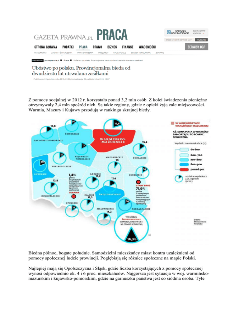 Z pomocy socjalnej w 2012 r. korzystało ponad 3,2 mln osób. Z kolei świadczenia pieniężne otrzymywały 2,4 mln spośród nich. Są takie regiony, gdzie z opieki żyją całe miejscowości. Warmia, Mazury i Kujawy przodują w rankingu skrajnej biedy. Biedna północ, bogate południe. Samodzielni mieszkańcy miast kontra uzależnieni od pomocy społecznej ludzie prowincji. Pogłębiają się różnice społeczne na mapie Polski. Najlepiej mają się Opolszczyzna i Śląsk, gdzie liczba korzystających z pomocy społecznej wynosi odpowiednio ok. 4 i 6 proc. mieszkańców. Najgorsza jest sytuacja w woj. warmińskomazurskim i kujawsko-pomorskim, gdzie na garnuszku państwa jest co siódma osoba. Tyle średnia, bo tak naprawdę niemalże w całej Polsce znajdują się gminy, gdzie z pomocy społecznej żyje po 20, 30, a czasem nawet ponad 50 proc. osób. Najgorsze, że ten stan nie zmienia się od lat. – Strategia rozwoju państwa zakłada nacisk na miasta jako na główne motory innowacyjności. Prowincja zaś, szczególnie ta, która jest słabiej skomunikowana z dużymi ośrodkami, jest zostawiona sama sobie – mówi Dominik Owczarek, ekspert z Instytutu Polityki Społecznej. Mimo że trafiają tam coraz większe pieniądze, to idą na doraźną pomoc społeczną, a nie na aktywizację ludzi z problemami. Gminy wydały na taką pomoc w 2012 r. blisko 26 mld zł, o 815 mln zł więcej niż rok wcześniej. We wspomnianym woj. warmińsko-mazurskim te kwoty stanowią już blisko jedną piątą wszystkich samorządowych wydatków. Najlepiej widać to obciążenie, gdy porównamy je z ogółem mieszkańców województwa. W warmińsko-mazurskim średnio wynoszą one 945 zł na mieszkańca rocznie. Z kolei proporcjonalnie najmniejsze obciążenie jest na Mazowszu, gdzie w 2012 r. wydano na ten cel 563 zł na mieszkańca. Ta różnica wciąż się pogłębia. W 2012 r. wynosiła 382 zł, rok wcześniej 343 zł. Prowincjonalna bieda 48 km na północ od Chełma, a 17 km od granicy z Ukrainą leży niewielka gmina Stary Brus. Chwali się zabytkowym kościołem z początku XIX w. i o sto lat starszą cerkwią unicką. Ale nie to ją wyróżnia na mapie Polski. Gmina ma najwyższy procent mieszkańców korzystających z pomocy społecznej. Żyje z niej 71,9 proc. mieszkańców. – Pomoc społeczna, a właściwie materialna jest u nas głównym źródłem dochodu. Z którego żyją już kolejne pokolenia. Zasiłki biorą dziadkowie, rodzice, dzieci i obawiam się, że ich wnuki wychowywane w takim modelu życia też zaczną żyć od zasiłku do zasiłku – Aneta Zając, kierownik Gminnego Ośrodka Pomocy Społecznej, przyznaje, że sytuacja zaczyna ją i jej pracowników przytłaczać. – Kombinujemy, szukamy, wystaraliśmy się o dotacje unijne z Programu Operacyjnego Kapitał Ludzki na aktywizację społeczną. I nie było chętnych, by z tego skorzystać. Jedyne, co nam się udało, to stworzenie oddziału przedszkolnego. Szkoda tylko, że rodzice, których dzieci z niego korzystają, nie idą w tym czasie do pracy – mówi Zając i dodaje, że to właśnie w tych dzieciach i w zaktywizowaniu ich jest jedyna nadzieja, że gmina wydobędzie się z zasiłkowej matni. Jedna trzecia korzysta z pomocy Nie lepiej jest w zachodniopomorskich Kozielicach, gdzie ze świadczeń społecznych korzysta 71,3 proc. mieszkańców. – To region popegeerowski. A ten system życia – sama go przecież pamiętam – przyzwyczaił ludzi do tego, że woda, prąd, opał są za darmo, że dwa razy w roku dostawali świniaka, mleko dzień w dzień. I ludzie, choć minęło przeszło dwadzieścia lat, wciąż chcieliby takiego życia. Ich bezradności nie pomaga ogromny problem z bezrobociem. Nie mamy w pobliżu dużych miast, żadnych większych zakładów ani pracodawców – tłumaczy Jolanta Zięba, kierownik kozielickiego ośrodka pomocy społecznej. – Ale mamy sukcesy. Dzięki aktywizacji z dotacji unijnych udało nam się z bezrobocia wyciągnąć sześć osób. Tak, dobrze pani słyszy: sześć. Ja wiem, że to dramatycznie mało, ale musimy się cieszyć choćby takimi małymi sukcesami – dodaje Zięba. Jak podliczył DGP, w całej Polsce w 21 gminach więcej niż 30 proc. mieszkańców korzysta z pomocy społecznej. Po dwóch dekadach na mapie Polski wyraźnie już widać, w jakich regionach problem jest największy. To ściana wschodnia, ale także Zachodniopomorskie, miejscowości małe i bardzo małe, położone na uboczu, bez dużych prężnych miast, które dawałyby pracę, w ogromnej części na terenach po PGR-ach. Lepsze statystyki, nie rzeczywistość Prawo do pomocy społecznej mają osoby, których dochód nie przekracza 456 zł na osobę w rodzinie oraz 542 zł dla osoby samotnej (gmina może podwyższyć kryterium dochodowe, ale samorządy robią to bardzo niechętnie). Brane są też pod uwagę takie okoliczności, jak: niepełnosprawność, długotrwała choroba, przemoc w rodzinie, ochrona macierzyństwa i wielodzietności etc. Wśród świadczeń znajdują się wsparcie finansowe (np. zasiłki, pożyczki) oraz niepieniężne, takie jak: praca socjalna, składki na ubezpieczenie, posiłki, ubrania, usługi opiekuńcze oraz szkolenia. Teoretycznie sytuacja się poprawia. W 2009 r. takim wsparciem objętych było 3,7 mln osób, a w 2012 r. już o pół miliona mniej. W porównaniu do 2009 r. zmniejszyła się też, i to blisko o połowę, liczba najmocniej dotkniętych społeczną bezradnością gmin. W części spadły też wskaźniki deprywacji, czyli odsetek osób korzystających z pomocy. Ale wystarczy się przyjrzeć, by okazało się, że to niestety sukces pozorny. Jak piszą autorzy raportu „Ocena zasobów pomocy społecznej województwa łódzkiego 2012”, w tym regionie od kilku lat mamy do czynienia ze spadkiem liczby klientów pomocy społecznej. Zauważalny jest nieznaczny spadek liczby osób korzystających z pomocy społecznej oraz liczby świadczeń. Ale wynika to z