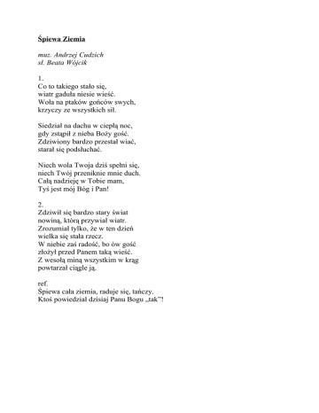 Śpiewa Ziemia muz. Andrzej Cudzich sł. Beata Wójcik 1. Co to takiego stało się, wiatr gaduła niesie wieść. Woła na ptaków gońców swych, krzyczy ze wszystkich sił. Siedział na dachu w ciepłą noc, gdy zstąpił z nieba Boży gość. Zdziwiony bardzo przestał wiać, starał się podsłuchać. Niech wola Twoja dziś spełni się, niech Twój przeniknie mnie duch. Całą nadzieję w Tobie mam, Tyś jest mój Bóg i Pan! 2. Zdziwił się bardzo stary świat nowiną, którą przywiał wiatr. Zrozumiał tylko, że w ten dzień wielka się stała rzecz. W niebie zaś radość, bo ów gość złożył przed Panem taką wieść. Z wesołą miną wszystkim w krąg powtarzał ciągle ją. ref. Śpiewa cała ziemia, raduje się, tańczy. Ktoś powiedział dzisiaj Panu Bogu „tak”!