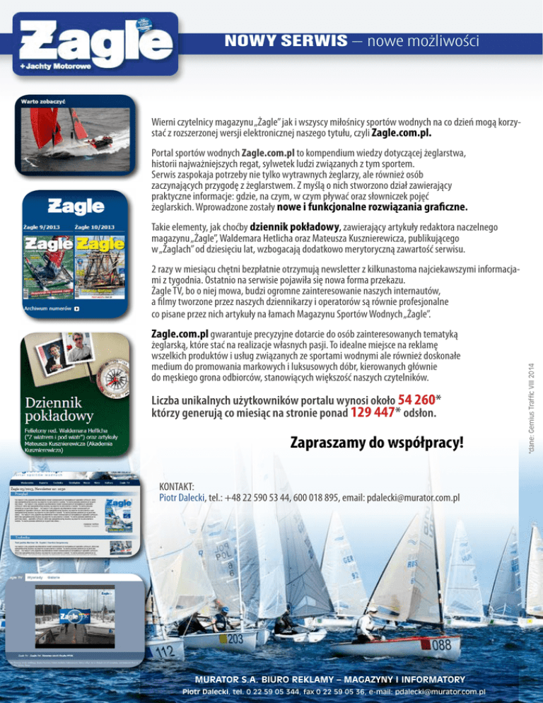 NOWY SERWIS – nowe możliwości Wierni czytelnicy magazynu „Żagle” jak i wszyscy miłośnicy sportów wodnych na co dzień mogą korzystać z rozszerzonej wersji elektronicznej naszego tytułu, czyli Zagle.com.pl. Portal sportów wodnych Zagle.com.pl to kompendium wiedzy dotyczącej żeglarstwa, historii najważniejszych regat, sylwetek ludzi związanych z tym sportem. Serwis zaspokaja potrzeby nie tylko wytrawnych żeglarzy, ale również osób zaczynających przygodę z żeglarstwem. Z myślą o nich stworzono dział zawierający praktyczne informacje: gdzie, na czym, w czym pływać oraz słowniczek pojęć żeglarskich. Wprowadzone zostały nowe i funkcjonalne rozwiązania graficzne. Takie elementy, jak choćby dziennik pokładowy, zawierający artykuły redaktora naczelnego magazynu „Żagle”, Waldemara Hetlicha oraz Mateusza Kusznierewicza, publikującego w „Żaglach” od dziesięciu lat, wzbogacają dodatkowo merytoryczną zawartość serwisu. Zagle.com.pl gwarantuje precyzyjne dotarcie do osób zainteresowanych tematyką żeglarską, które stać na realizacje własnych pasji. To idealne miejsce na reklamę wszelkich produktów i usług związanych ze sportami wodnymi ale również doskonałe medium do promowania markowych i luksusowych dóbr, kierowanych głównie do męskiego grona odbiorców, stanowiących większość naszych czytelników. Liczba unikalnych użytkowników portalu wynosi około 54 260* którzy generują co miesiąc na stronie ponad 129 447* odsłon. Zapraszamy do współpracy! KONTAKT: Piotr Dalecki, tel.: +48 22 590 53 44, 600 018 895, email: [email protected] MURATOR S.A. BIURO REKLAMY – MAGAZYNY I INFORMATORY Piotr Dalecki, tel. 0 22 59 05 344, fax 0 22 59 05 36, e-mail: [email protected] *dane: Gemius Traffic VIII 2014 2 razy w miesiącu chętni bezpłatnie otrzymują newsletter z kilkunastoma najciekawszymi informacjami z tygodnia. Ostatnio na serwisie pojawiła się nowa forma przekazu. Żagle TV, bo o niej mowa, budzi ogromne zainteresowanie naszych internautów, a filmy tworzone przez naszych dziennikarzy i operatorów są równie profesjonalne co pisane przez nich artykuły na łamach Magazynu Sportów Wodnych „Żagle”. CENNIK 1 2 3 Cennik Form reklamowych REKLAMY DISPLAY Cena za 1O tys. odsłon: 1. Billboard 750x100 px – 960 PLN netto (CPM -96 PLN) 2. Double Billboard 750x200 px – 1560 PLN netto (CPM -156 PLN) 3. T riple Billboard 750x300 px – 1920 PLN netto (CPM -192 PLN) 4. S ky Scraper 120x600 px – 960 PLN netto (CPM -96 PLN) 4. S ky Scraper pływający 120x600 px – 960 PLN netto (CPM -96 PLN) 5. R ectangle 300x250 px – 960 PLN netto (CPM -96 PLN) 4 5 6 RECTANGLE 300 x 250 STAŁE OBECNOŚCI Cena za tydzień/miesiąc stałej emisji na SG i ROS*: 1. B illboard 750x100 px – 500/1700 PLN netto SG – 1700/6600 PLN netto ROS 2. D ouble Billboard 750x200 px – 800/2720 PLN netto SG – 2700/10560 PLN netto ROS 4. S ky Scraper 120x600 px – 500/1700 PLN netto SG – 1700/6600 PLN netto ROS 5. R ectangle 300x250 px – 500/1700 PLN netto SG – 1700/6600 PLN netto ROS 6. B elka – 2 news 715x100 px – 500/1700 PLN netto SG 7. B elka – 4 news 715x100 px – 500/1700 PLN netto SG 8. B elka – news 715x100 px – 500/1700 PLN netto SG 5 7 8 *SG – strona główna, ROS – SG + podstrony 8 8 NEWSLETTER Cykliczna informacja dla użytkowników serwisu Zagle.com.pl Regularnie wysyłany newsletter trafia bezpłatnie do wszystkich, którzy on-line wyrażą chęć na jego otrzymywanie. Newsletter składa się z kilkunastu najciekawszych newsów z całego tygodnia i dociera 4 razy w miesiącu. Zarejestrowanie się jest niezwykle szybkie i proste. Bezpośrednio w newsletterze istnieje możliwość zamieszczenia dwóch rodzajów bannerów reklamowych o formatach 300x120 px oraz 150x120 px. Newsletter otrzymuje aktualnie 1019 osób * * dane redakcji serwisu Zagle.com.pl 1 2 3 C ennik 1. Format 300x120 px: 1200 PLN netto 2 newsletery 2. Format 150x120 px: 850 PLN netto 2 newsletery 3. Wysyłka samej reklamy do subskybentów: 1 PLN/os ŻAGLE.tv Najnowszy projekt serwisu Zagle.com.pl Oferujemy Państwu możliwość pokazania swojej oferty w formie audiowizualnej. Nasi dziennikarze wraz z operatorem nagrają wywiad z osobą reprezentującą firmę, która opowie o jej działalności, produktach czy usługach. Sfilmujemy regaty lub inne wydarzenia, które Państwo firmujecie swoją marką. Uwiecznimy proces budowy jachtu lub montażu osprzętu. Omówimy z rozmówcą technologię, czy wreszcie zaprezentujemy na filmie zasady działania każdego urządzenia, którymi chcielibyście się Państwo podzielić z użytkownikami serwisu Zagle.com.pl Żagle TV to nowe, nieograniczone możliwości zareklamowania firmy i jej usług. Wyprodukujemy film na podstawie własnych nagranych materiałów lub skorzystamy z powierzonych nam przez Państwa. Istnieje oczywiście możliwość połączenia i zmontowania ich razem. Stworzony materiał zostanie Państwu udostępniony w formie elektronicznej na własne potrzeby. Z podpisem: ŻAGLE TV). Pokazana na głównej stronie serwisu zajawka w części newsowej będzie po kliknięciu przekierowywać bezpośrednio na zakładkę ŻAGLE TV i Państwa film promocyjny. Przez 14 dni pomimo wchodzących nowych informacji, zakładka o filmie pozostanie na głównej stronie serwisu. Film będzie dostępny również na profilu ŻagleTV. Wywiady sponsorowane C ennik Emisja gotowego filmu: 2 200 PLN netto Emisja wyprodukowanego filmu: 6 500 PLN netto przez ZPR Media Filmowe prezentacje produktowe