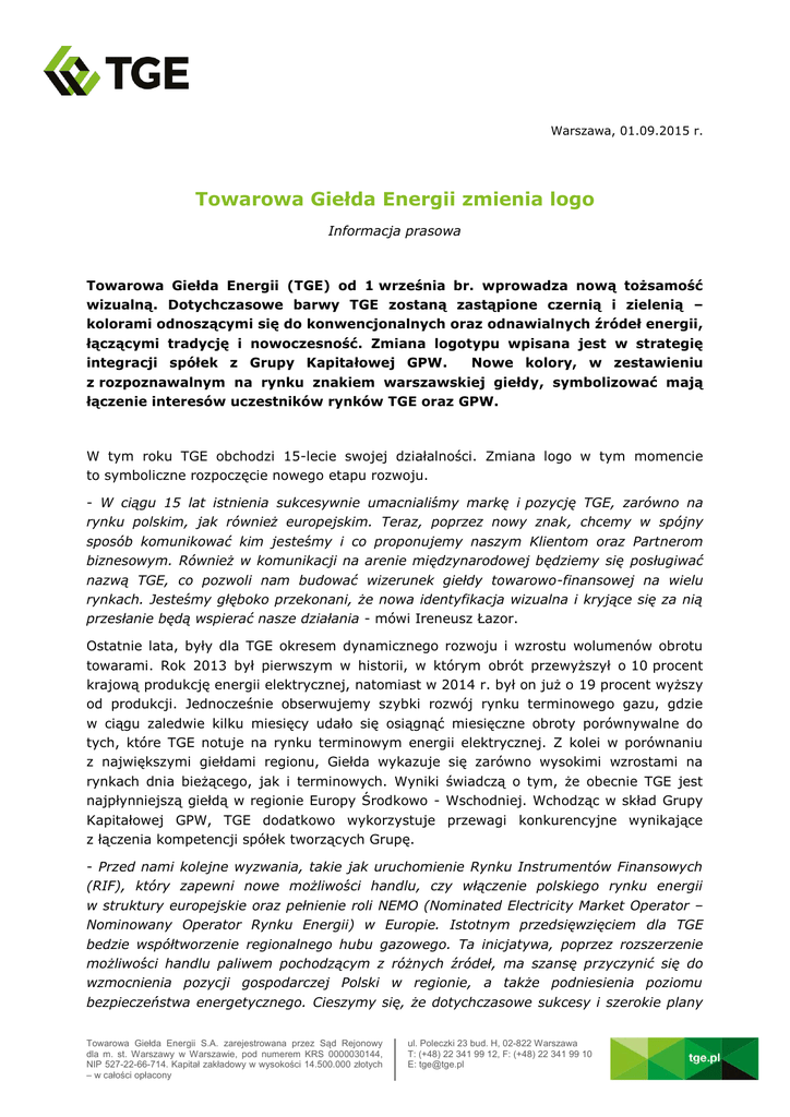 Warszawa, 01.09.2015 r. Towarowa Giełda Energii zmienia logo Informacja prasowa Towarowa Giełda Energii (TGE) od 1 września br. wprowadza nową tożsamość wizualną. Dotychczasowe barwy TGE zostaną zastąpione czernią i zielenią – kolorami odnoszącymi się do konwencjonalnych oraz odnawialnych źródeł energii, łączącymi tradycję i nowoczesność. Zmiana logotypu wpisana jest w strategię integracji spółek z Grupy Kapitałowej GPW. Nowe kolory, w zestawieniu z rozpoznawalnym na rynku znakiem warszawskiej giełdy, symbolizować mają łączenie interesów uczestników rynków TGE oraz GPW. W tym roku TGE obchodzi 15-lecie swojej działalności. Zmiana logo w tym momencie to symboliczne rozpoczęcie nowego etapu rozwoju. - W ciągu 15 lat istnienia sukcesywnie umacnialiśmy markę i pozycję TGE, zarówno na rynku polskim, jak również europejskim. Teraz, poprzez nowy znak, chcemy w spójny sposób komunikować kim jesteśmy i co proponujemy naszym Klientom oraz Partnerom biznesowym. Również w komunikacji na arenie międzynarodowej będziemy się posługiwać nazwą TGE, co pozwoli nam budować wizerunek giełdy towarowo-finansowej na wielu rynkach. Jesteśmy głęboko przekonani, że nowa identyfikacja wizualna i kryjące się za nią przesłanie będą wspierać nasze działania - mówi Ireneusz Łazor. Ostatnie lata, były dla TGE okresem dynamicznego rozwoju i wzrostu wolumenów obrotu towarami. Rok 2013 był pierwszym w historii, w którym obrót przewyższył o 10 procent krajową produkcję energii elektrycznej, natomiast w 2014 r. był on już o 19 procent wyższy od produkcji. Jednocześnie obserwujemy szybki rozwój rynku terminowego gazu, gdzie w ciągu zaledwie kilku miesięcy udało się osiągnąć miesięczne obroty porównywalne do tych, które TGE notuje na rynku terminowym energii elektrycznej. Z kolei w porównaniu z największymi giełdami regionu, Giełda wykazuje się zarówno wysokimi wzrostami na rynkach dnia bieżącego, jak i terminowych. Wyniki świadczą o tym, że obecnie TGE jest najpłynniejszą giełdą w regionie Europy Środkowo - Wschodniej. Wchodząc w skład Grupy Kapitałowej GPW, TGE dodatkowo wykorzystuje przewagi konkurencyjne wynikające z łączenia kompetencji spółek tworzących Grupę. - Przed nami kolejne wyzwania, takie jak uruchomienie Rynku Instrumentów Finansowych (RIF), który zapewni nowe możliwości handlu, czy włączenie polskiego rynku energii w struktury europejskie oraz pełnienie roli NEMO (Nominated Electricity Market Operator – Nominowany Operator Rynku Energii) w Europie. Istotnym przedsięwzięciem dla TGE bedzie współtworzenie regionalnego hubu gazowego. Ta inicjatywa, poprzez rozszerzenie możliwości handlu paliwem pochodzącym z różnych źródeł, ma szansę przyczynić się do wzmocnienia pozycji gospodarczej Polski w regionie, a także podniesienia poziomu bezpieczeństwa energetycznego. Cieszymy się, że dotychczasowe sukcesy i szerokie plany Towarowa Giełda Energii S.A. zarejestrowana przez Sąd Rejonowy dla m. st. Warszawy w Warszawie, pod numerem KRS 0000030144, NIP 527-22-66-714. Kapitał zakładowy w wysokości 14.500.000 złotych – w całości opłacony ul. Poleczki 23 bud. H, 02-822 Warszawa T: (+48) 22 341 99 12, F: (+48) 22 341 99 10 E: [email protected] TGE są wynikiem udanej współpracy i wymiany doświadczeń z naszymi Członkami, Partnerami biznesowymi oraz instytucjami tworzącymi rynki energii elektrycznej i gazu – dodaje Ireneusz Łazor. TGE jest główną platformą giełdowego hurtowego obrotu energią elektryczną oraz buduje taką pozycję na rynku gazu. Jako instytucja zaufania publicznego, TGE zapewnia bezpieczeństwo obrotu oraz przejrzyste procedury zawierania transakcji, co przyczynia się do rynkowego kształtowania się cen towarów giełdowych. W lutym 2012 roku TGE weszła w skład Grupy Kapitałowej GPW. *** Towarowa Giełda Energii S.A. (TGE) powstała pod koniec 1999 roku. Jest jedyną licencjonowaną giełdą energii w Polsce. Działalność operacyjną rozpoczęła 30 czerwca 2000 roku. Uruchomienie TGE było jednym z pierwszych działań w kierunku liberalizacji polskiego rynku energii elektrycznej i prywatyzacji sektora elektroenergetycznego. Od lutego 2012 r. TGE jest wyłączną własnością Giełdy Papierów Wartościowych w Warszawie. TGE prowadzi rynki: energii elektrycznej (Rynek Terminowy Towarowy - RTT, Rynek Dnia Następnego - RDN, Rynek Dnia Bieżącego - RDB) oraz gazu (RTT, RDNg), a także Rynek Praw Majątkowych. Jest obecnie najbardziej dynamicznie rozwijającą się giełdą towarową w regionie. Potwierdza to przynależność do organizacji EUROPEX, promującej idee konsolidacji rynków energetycznych poprzez połączenia transgraniczne i zrzeszającej wszystkie towarowe i finansowe giełdy energii w Europie. Od grudnia 2010 TGE i Nord Pool Spot prowadzą połączone rynki dnia następnego na zasadach market coupling na połączeniu Swe-Pol Link łączącym Szwecję i Polskę. Łączny wolumen obrotu na rynkach energii elektrycznej Towarowej Giełdy Energii w 2014 r. wyniósł 186,8 TWh (wzrost o 5,8% w stosunku do 2013 r.), z czego na rynku spot (Rynek Dnia Następnego oraz Rynek Dnia Bieżącego) – 23,8 TWh (wzrost o 7,05% w porównaniu do 2013 r.), natomiast na Rynku Terminowym Towarowym – 163 TWh (wzrost o 5,6% w porównaniu do 2013 r.). Na parkiecie gazu ziemnego łączny wolumen obrotów osiągnął 111,6 TWh, co oznacza, że wzrósł w odniesieniu do wolumenu z 2013 r. prawie 47-krotnie. Na rynku spot gazu (Rynek Dnia Następnego gazu oraz Rynek Dnia Bieżącego gazu) – handel paliwem osiągnął wartość 6,6 TWh (15-krotny wzrost w stosunku do 2013 r.), a na Rynku Terminowym Towarowym - 105 TWh (53krotny wzrost w porównaniu do 2013 r.). www.tge.pl Kontakt dla mediów: Towarowa Giełda Energii S.A.; Agata Samcik; [email protected], +48 885 885 645, +48 607 030 573, +48 661 878 769 Towarowa Giełda Energii S.A. zarej