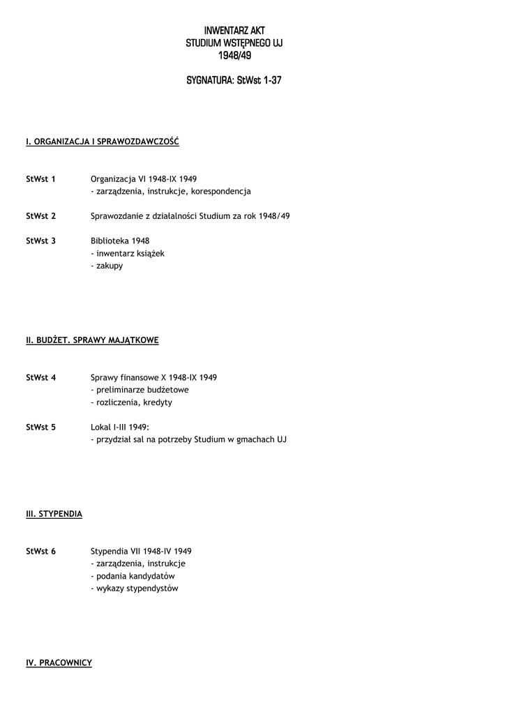 INWENTARZ AKT STUDIUM WSTĘPNEGO UJ 1948/49 SYGNATURA: StWst 1-37 I. ORGANIZACJA I SPRAWOZDAWCZOŚĆ StWst 1 Organizacja VI 1948-IX 1949 - zarządzenia, instrukcje, korespondencja StWst 2 Sprawozdanie z działalności Studium za rok 1948/49 StWst 3 Biblioteka 1948 - inwentarz ksiąŜek - zakupy II. BUDśET. SPRAWY MAJĄTKOWE StWst 4 Sprawy finansowe X 1948-IX 1949 - preliminarze budŜetowe - rozliczenia, kredyty StWst 5 Lokal I-III 1949: - przydział sal na potrzeby Studium w gmachach UJ III. STYPENDIA StWst 6 Stypendia VII 1948-IV 1949 - zarządzenia, instrukcje - podania kandydatów - wykazy stypendystów IV. PRACOWNICY StWst 7 Sprawy osobowe X 1948-IX 1949 - sprawy osobowe personelu Studium - wykazy wykładowców - kartoteka wykładowców V. STUDIA I STUDENCI StWst 8 Podania kandydatów o przyjęcie do Studium 1948/49 - studia prawa - dołączone Ŝyciorysy, opinie, zaświadczenia StWst 9 Podania kandydatów o przyjęcie do Studium 1948/49 - studia lekarskie, cz. I, litery A-N StWst 10 Podania kandydatów o przyjęcie do Studium 1948/49 - studia lekarskie, cz. II, litery O-Z StWst 11 Podania kandydatów o przyjęcie do Studium 1948/49 - kierunki humanistyczne StWst 12 Podania kandydatów o przyjęcie do Studium 1948/49 - kierunki matematyczno-przyrodnicze StWst 13 Podania kandydatów o przyjęcie do Studium 1948/49 - studia rolnictwa i leśnictwa, cz. I StWst 14 Podania kandydatów o przyjęcie do Studium 1948/49 - studia rolnictwa i leśnictwa, cz. II StWst 15 Podania kandydatów o przyjęcie do Studium 1948/49 - studia farmaceutyczne StWst 16 Podania kandydatów o przyjęcie do Studium 1948/49 - Studia spółdzielcze StWst 17 Protokoły Państwowej Komisji Kwalifikacyjnej przy UJ z egzaminów wstępnych na Studium 1948 StWst 18 Protokoły z posiedzeń Państwowej Komisji Kwalifikacyjnej przy UJ dla kandydatów do Studium IX 1948 StWst 19 Listy kandydatów VIII-X 1948 StWst 20 Karty wpisowe słuchaczy 1948/49 układ alfabetyczny StWst 21 Karty indywidualne słuchaczy 1948/49 StWst 22 Wykazy słuchaczy 1948/49 StWst 23 Zaświadczenia wydawane słuchaczom Studium X 1948-VII 1949 - odejście, studia, wyniki nauczania StWst 24 Dziennik lekcyjny 1948/49 - grupa humanistyczna I StWst 25 Dziennik lekcyjny 1948/49 - grupa humanistyczna II StWst 26 Dziennik lekcyjny 1948/49 - grupa przyrodnicza I StWst 27 Dziennik lekcyjny 1948/49 - grupa przyrodnicza II StWst 28 Dziennik lekcyjny 1948/49 - grupa przyrodnicza III VII. EGZAMINY StWst 29 Katalogi okresowe ocen 1948/49 - grupa humanistyczna I - grupa humanistyczna II StWst 30 Katalogi okresowe ocen 1948/49 - grupa przyrodnicza I - grupa przyrodnicza II - grupa przyrodnicza III StWst 31 Egzaminy VIII 1948-XI 1949 - zarządzenia, instrukcje - podania słuchaczy o przesunięcie terminu egzaminów StWst 32 Protokoły z końcowego egzaminu pisemnego z języka polskiego VI-IX 1949 StWst 33 Wypracowania z języka polskiego - egzamin końcowy VI 1949 Cz. I, litery A-Ko StWst 34 Wypracowania z języka polskiego - egzamin końcowy VI 1949 Cz. II, litery Kr-Z StWst 35 Protokoły z egzaminu końcowego - indywidualne 1949 StWst 36 Zaświadczenia ukończenia Studium 1949 StWst 36a Związek Akademickiej MłodzieŜy Polskiej Koło Słuchaczy Roku Wstępnego i Studium Wstępnego 1948-1949 - zarządzenia, instrukcje - ewidencja członków - sprawozdania z działalności StWst 37 Udział Studium w rocznicach i uroczystościach XI 1948-VI 1949