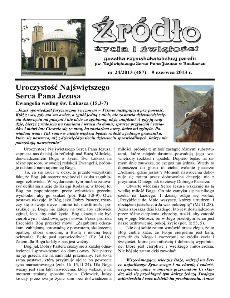gazetka rzymskokatolickiej parafii pw. Najświętszego Serca Pana Jezusa w Raciborzu nr 24/2013 (487) 9 czerwca 2013 r. Uroczystość Najświętszego Serca Pana Jezusa Ewangelia według św. Łukasza (15,3-7) „Jezus opowiedział faryzeuszom i uczonym w Piśmie następującą przypowieść: KtóŜ z was, gdy ma sto owiec, a zgubi jedną z nich, nie zostawia dziewięćdziesięciu dziewięciu na pustyni i nie idzie za zgubioną, aŜ ją znajdzie? A gdy ją znajdzie, bierze z radością na ramiona i wraca do domu; sprasza przyjaciół i sąsiadów i mówi im: Cieszcie się ze mną, bo znalazłem owcę, która mi zginęła. Powiadam wam: Tak samo w niebie większa będzie radość z jednego grzesznika, który się nawraca, niŜ z dziewięćdziesięciu dziewięciu sprawiedliwych, którzy nie potrzebują nawrócenia” Uroczystość Najświętszego Serca Pana Jezusa, zaprasza nas dzisiaj do refleksji nad BoŜą Miłością, doświadczeniem Boga w Ŝyciu. Św. Łukasz na róŜne sposoby, w swojej redakcji Ewangelii, próbuje odsłonić nam tajemnicę Boga. To, co się rzuca w oczy, to przede wszystkim fakt, Ŝe Bóg, jak pasterz wychodzi i szuka zagubionego człowieka. W wydarzeniu tym moŜna zauwaŜyć delikatną aluzję do Księgi Rodzaju, w której to, Bóg po popełnionym przez człowieka grzechu wychodzi, aby go szukać (por. Rdz 3,8-9). Owa postawa ukazuje, iŜ Bóg, jako Dobry Pasterz, troszczy się o swoje owce i mimo ich niesforności poszukuje je. Bogu nie zaleŜy na tym, aby człowiek zginął, lecz aby miał Ŝycie. Bóg ukazuje się być cierpliwym i dochowującym słowa. Przez proroka Ezechiela Bóg przecieŜ mówi: „Zagubioną odszukam, zabłąkaną sprowadzę z powrotem, skaleczoną opatrzę, chorą umocnię, a tłustą i mocną będę ochraniał. Będę pasł sprawiedliwie” (Ez 34,16). Zatem dla Boga kaŜdy z nas jest waŜny. Bóg, jak Dobry Pasterz cieszy się z kaŜdej odnalezionej i sprowadzonej do domu owcy. Nie patrzy na jej grzech, ale na sam fakt przemiany. Jest to ta sama postawa, którą przyjmuje ojciec po powrocie syna marnotrawnego (zob. Łk 15,11-24). Dla Boga waŜny jest sam fakt nawrócenia, który wskazuje na moment zmiany sposobu Ŝycia. Człowiek, który kroczy przez swoje Ŝycie sam bez doświadczenia miłości, próbuje tę miłość zastąpić róŜnymi substytutami, które niejednokrotnie powodują jego wewnętrzny rozkład i upadek. Dopiero będąc na samym dnie zauwaŜa, Ŝe czegoś mu jednak. Wtedy to dopuszcza do głosu to ciche wołanie pasterza: „Adamie, gdzie jesteś”? Moment nawrócenia dokonuje się zatem przez dobrowolna decyzję, nie z przymusu. Dlatego tak to cieszy Dobrego Pasterza. Otwarte włócznią Serce Jezusa wskazuje na tą wielką miłość Boga. On nie zamyka się na nikogo czeka na kaŜdego. I dzisiaj zdaje się wołać: „Przyjdźcie do Mnie wszyscy, którzy utrudzeni i obciąŜeni jesteście, a Ja was pokrzepię” (Mt 11,28). Jezus zaprasza dziś kaŜdego, kto jest doświadczony przez róŜne cierpienia, choroby, troski, aby zatopić się w jego Miłości, bo w Jego przebitym sercu jest nasze uzdrowienie, pokój, Ŝycie (por. Iz 53, 5). Nie daj sobie zatem wmówić przez złego, Ŝe to Bóg ciebie kaŜe, Ŝe twoje cierpienie jest karą, przyjdź do Niego i zaczerpnij ze źródła Ŝycia i świętości, które jest miłością i dobrocią wypełnione, które jest cierpliwe i wielkiego miłosierdzia. Nie bój się zatem dziś zawołać: Wszechmogący, wieczny BoŜe, wejrzyj na Serce najmilszego Syna swego i na chwalę i zadośćuczynienie, jakie w imieniu grzeszników Ci składa; daj się przebłagać tym którzy Ŝebrzą Twojego miłosierdzia i racz udzielić im przebaczenia. Amen 2 Źródło - gazetka Poniedziałek – 10 czerwca 2013 – bł. Bogumiła, biskupa Mt 5,1-12 630 Za †† męŜa Henryka, trzy siostry, dwóch braci, †† z rodziny i dusze w czyśćcu cierpiące 700 Za † mamę Helenę Pendziałek w 2. rocznicę śmierci oraz za †† rodziców i teściów 1800 1. Za † męŜa Zdzisława w dniu urodzin 2. Do BoŜej Opatrzności w 50. rocznicę urodzin syna Janusza z podziękowaniem za otrzymane łaski, z prośbą o zdrowie i BoŜe błogosławieństwo dla całej rodziny 3. Do Serca Jezusowego za wstawiennictwem Matki BoŜej w intencji Pelagii Konsek (z okazji urodzin) i jej rodziny o błogosławieństwo i potrzebne łaski NaboŜeństwo czerwcowe Wtorek – 11 czerwca 2013 – św. Barnaby, apostoła Mt 10,7-13 630 Z okazji urodzin syna Mateusza z prośbą o BoŜe błogosławieństwo i opiekę Matki BoŜej 800 W języku niemieckim: Za † męŜa Wernera Kudelę w 8. rocznicę śmierci, †† dwóch braci Franciszka i Henryka, rodziców z obu stron, †† z całego pokrewieństwa 900 Za †† rodziców Katarzynę i Ignacego, brata Jana, bratową Mariannę, siostrę Dorotę, szwagra Józefa, dziadków i całe pokrewieństwo oraz za dusze w czyśćcu cierpiące 1800 1. Za † męŜa Grzegorza Sochę 2. Za † Ryszarda Barona (w 30. dzień) NaboŜeństwo czerwcowe Środa – 12 czerwca 2013 Mt 5,17-19 630 1. Za † Zbigniewa Korpaczewskiego (od sąsiadów z ulicy Słowackiego 32) 2. Do BoŜej Opatrzności przez wstawiennictwo Matki Boskiej Nieustającej Pomocy o pomyślny przebieg operacji i o zdrowie dla syna oraz o dary Ducha Świętego i opiekę Aniołów StróŜów dla wnuków 700 Za † Marię Szulc (od męŜa) 1800 1. Za † ojca dr Józefa KręŜla w 13. rocznicę śmierci, †† jego rodziców Annę i Juliana, † brata ks. Władysława i wszystkich †† z rodziny 2. Za †† ojca Wojciecha w rocznicę śmierci, matkę Marię, braci Ferdynanda, Józefa, Stanisława, teścia Jana, ciotkę ElŜbietę oraz za wszystkich †† z rodziny NaboŜeństwo czerwcowe Czwartek – 13 czerwca 2013 – św. Antoniego z Padwy, kapł. i doktora K-ła Mt 5,20-26 630 Do Miłosierdzia BoŜego za †† Franciszka i Józefa, rodziców, rodzeństwo oraz za dusze w czyśćcu cierpiące 700 Za †† rodziców Teodor