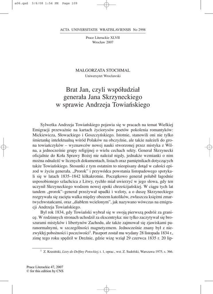 a06.qxd 3/6/08 1:54 PM Page 109 ACTA UNIVERSITATIS WRATISLAVIENSIS No 2998 Prace Literackie XLVII Wrocław 2007 MAŁGORZATA STOCHMAL Uniwersytet Wrocławski Brat Jan, czyli współudział generała Jana Skrzyneckiego w sprawie Andrzeja Towiańskiego Sylwetka Andrzeja Towiańskiego pojawia się w pracach na temat Wielkiej Emigracji przeważnie na kartach życiorysów poetów pokolenia romantyków: Mickiewicza, Słowackiego i Goszczyńskiego. Istotnie, stanowili oni nie tylko śmietankę intelektualną wśród Polaków na obczyźnie, ale także należeli do gro− na towiańczyków – wyznawców nowej nauki stworzonej przez mistyka z Wil− na, a jednocześnie grupy religijnej o wielu cechach sekty. Generał Skrzynecki oficjalnie do Koła Sprawy Bożej nie należał nigdy, jednakże wzmianki o nim można odnaleźć w licznych dokumentach, listach oraz pamiętnikach dotyczących także Towiańskiego. Stosunki z tym ostatnim to nieopisany dotąd w całości epi− zod w życiu generała. „Prorok” i przywódca powstania listopadowego spotyka− li się w latach 1835–1842 kilkakrotnie. Początkowo generał polubił łagodnie usposobionego szlachcica z Litwy, rychło miał uwierzyć w jego słowa, gdy ten uczynił Skrzyneckiego wodzem nowej epoki chrześcijańskiej. W ciągu tych lat tandem „prorok”–generał przeżywał upadki i wzloty, a o duszę Skrzyneckiego rozgrywała się zacięta walka między obozem katolików, zwłaszcza księżmi zmar− twychwstańcami, oraz „diabłem wcielonym”, jak nazywano wówczas na emigra− cji Andrzeja Towiańskiego. Był rok 1834, gdy Towiański wybrał się w swoją pierwszą podróż za grani− cę. W rodzinnych stronach uchodził za ekscentryka: nie tylko zaczytywał się bro− szurami mistyków i libertynów Zachodu, ale także zajmował się zjawiskami pa− ranormalnymi, w szczególności magnetyzmem. Jednocześnie znany był z nie− zwykłej pobożności i poczciwości1. Paszport został mu wydany 28 listopada 1834 r., zimę tego roku spędził w Dreźnie, gdzie wizę wziął 29 czerwca 1835 r. 20 lip− 1 Z. Krasiński, Listy do Delfiny Potockiej, t. 1, oprac., wst. Z. Sudolski, Warszawa 1975, s. 366. Prace Literackie 47, 2007 © for this edition by CNS a06.qxd 3/6/08 1:54 PM Page 110 110 MAŁGORZATA STOCHMAL ca był w Teplicach, skąd udał się do Karlowych Warów. W ciągu dwóch lat wie− lokrotnie przerywał kurację zdrowotną i poruszał się na trasie Norymber− ga–Karlsbad–Teplice–Praga, kilkanaście razy zmieniając miejsce pobytu2. W tym czasie doszło do pierwszego spotkania z Janem Skrzyneckim. Po upadku powstania listopadowego władze austriackie internowały gene− rała w Linzu. Chwilowo przybrał nazwisko Staniszewski. We wrześniu 1832 r., kiedy urodziła się córka Zofia, pozwolono mu się osiedlić na stałe w Pradze. Skrzyneccy zamieszkali na Końskim Targu, a stosunki towarzyskie generała by− ły tematem policyjnych raportów. W Pradze Skrzynecki kontaktował się z emi− sariuszami z Polski, w 1834 r. w apartamencie generała w Teplicach odbywały się tajne spotkania rodaków. Skrzynecki był w stałym kontakcie z zagraniczny− mi komitetami polskiej emigracji, pośredniczył także w przesyłaniu korespon− dencji3. W praskim mieszkaniu generała odwiedził Karol Montalembert. Młode− go Francuza i dwukrotnie starszego Polaka połączyły podobne poglądy politycz− ne oraz zainteresowanie sprawami duchowymi. Montalembert był jednym z redaktorów katolickiego czasopisma „L’Avenir”, założonego przez księdza Lammenais, którego rozprawy czytywał Skrzynecki. Ten ostatni – politycznie sparaliżowany – całą uwagę skierował w stronę religii i filozofii. Studiował pi− sma Bonalda, Chateaubrianda oraz de Maistre’a4. Policyjne raporty donoszą, że swój los emigranta znosił z godnością, doszukując się w dziejach Polski planu Boskiego. Skrzynecki, mąż okazałej postawy, oblicza pogodnego, jaśniejącą czystością sumienia, wy− glądał jako natchniony zbawca ojczyzny; na twarzy tego bohatera dziwna walka pokory chrześci− jańskiej z dumą ludzką5. Tak widział jednego z przywódców powstania listopadowego Aleksander Je− łowicki, podczas „polskiej rewolucji”. To samo musiał dostrzec Andrzej Towiań− ski, gdy po raz pierwszy doszło do spotkania generała z przybyszem z Wilna. Towiański w maju 1828 r. doświadczył iluminacji religijnej. Rzecz miała miej− sce na Litwie w kościele Bernardynów. Od tego czasu młody prawnik poczuł się prorokiem i mężem Bożym. Wkrótce zaczął formować wokół siebie ugrupowa− nie religijne, którego stał się przywódcą. Szukał także wpływów poza kręgami wileńskimi: początkowo krzewił swoje idee w Petersburgu, później w Dreźnie. Szczególnie zabiegał Towiański o względy osób wpływowych, których autory− tet uwiarygodniłby jego misję w oczach współczesnych. Wsparcie Skrzyneckie− 2 Por. M. Szyjkowski, Polskie peregrynacje do Pragi i Karlowych Warów od Augusta Moc− nego do Adama Mickiewicza, Bydgoszcz 1936, s. 184–187. 3 Ibidem, s. 184. 4 H. Żaliński, Emigracyjne losy gen. Jana Skrzyneckiego, [w:] Polacy w cywilizacjach świa− ta. Biografie emigrantów – portret zbiorowy, pod red. N. Kasparka i M. Prokopa, Olsztyn 1999, s. 114. 5 A. Jełowicki, Moje wspomnienia, Warszawa 1970, s. 246. Prace Literackie 47, 2007 © for this edition by CNS a06.qxd 3/6/08 1:54 PM Page 111 Współudział generała J. Skrzyneckiego w sprawie A. Towiańskiego 111 go, którego poznał w tym czasie, pozwoliłoby całkowicie anonimowemu Towiań− skiemu rozpropagować swoją naukę. Udało mu się ująć generała charyzmą i oso− bowością: ten znalazł „proroka” jako „dobrego, potulnego i łatwego”6. Warto przeanalizować duchową dyspozycję generała poddanego wpływom mistyka. Zarówno Towiański, jak i Skrzynecki to dzieci pokolenia romantyczne− go, którego jednym z najcharak