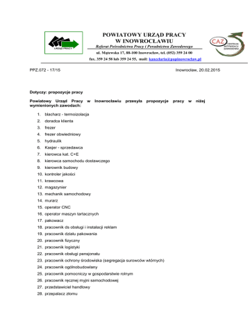 POWIATOWY URZĄD PRACY W INOWROCŁAWIU Referat Pośrednictwa Pracy i Poradnictwa Zawodowego ul. Mątewska 17, 88-100 Inowrocław, tel. (052) 359 24 00 fax. 359 24 58 lub 359 24 55, mail: [email protected] PPZ.072 - 17/15 Inowrocław, 20.02.2015 Dotyczy: propozycje pracy Powiatowy Urząd Pracy w wymienionych zawodach: Inowrocławiu przesyła propozycje 1. blacharz - termoizolacja 2. doradca klienta 3. frezer 4. frezer obwiedniowy 5. hydraulik 6. Kasjer - sprzedawca 7. kierowca kat. C+E 8. kierowca samochodu dostawczego 9. kierownik budowy 10. kontroler jakości 11. krawcowa 12. magazynier 13. mechanik samochodowy 14. murarz 15. operator CNC 16. operator maszyn tartacznych 17. pakowacz 18. pracownik ds obsługi i instalacji reklam 19. pracownik działu pakowania 20. pracownik fizyczny 21. pracownik logistyki 22. pracownik obsługi pensjonatu 23. pracownik ochrony środowiska (segregacja surowców wtórnych) 24. pracownik ogólnobudowlany 25. pracownik pomocniczy w gospodarstwie rolnym 26. pracownik ręcznej myjni samochodowej 27. przedstawiciel handlowy 28. przepalacz złomu pracy w niżej 29. referent ds sprzedaży i rozliczeń 30. specjalista ds kadr i płac 31. sprzedawca 32. stolarz meblowy 33. technolog obróbki skrawaniem 34. tokarz tokarek karuzelowych konwencjonalnych z odczytem numerycznym 35. wytaczarz wytaczarko - frezarek GIEŁDA PRACY – PRZEDSTAWICIEL HANDLOWY Powiatowy Urząd Pracy informuje, iż 5 marca 2015 roku (czwartek) o godzinie 9:00 w siedzibie Urzędu przy ulicy Mątewskiej 17 w sali 314 (III piętro) odbędzie się giełda pracy, organizowana dla firmy GRENE na stanowisko przedstawiciel handlowy. Wymagania: wykształcenie wyższe lub średnie techniczne; mile widziane doświadczenie zawodowe; prawo jazdy kat. B; obsługa komputera oraz pakietu MS Office. Prosimy o wcześniejsze przesłanie cv na adres e-mail: [email protected] Wszystkie oferty pracy są zamieszczane na stronie internetowej Powiatowego Urzędu Pracy w Inowrocławiu www.pupinowroclaw.pl, gdzie są na bieżąco aktualizowane Rozdzielnik: [email protected],[email protected], [email protected], [email protected], [email protected], [email protected], [email protected], inowrocł[email protected], [email protected], [email protected], Inowrocł[email protected], [email protected], [email protected], [email protected], [email protected], [email protected], [email protected], [email protected], Inowrocł[email protected], [email protected], [email protected], [email protected], [email protected], [email protected], [email protected], [email protected], [email protected], urzą[email protected], [email protected], [email protected], [email protected], [email protected], [email protected], [email protected]