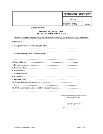 FORMULARZ OFERTOWY strona z ogólnej liczby stron (pieczęć oferenta) FORMULARZ OFERTOWY PRZETARG NIEOGRANICZONY Dostawa sprzętu komputerowego do Muzeum Narodowego we Wrocławiu i jego oddziałów. Wykonawca : 1. Zarejestrowana nazwa Przedsiębiorstwa : ................................................................... ................................................................... 2. Zarejestrowany adres Przedsiębiorstwa : ................................................................... ................................................................... 3. Województwo: . . . . . . . . . . . . . . . . . . . . . . . . . . . . . . . . . . . . . . . . . . . . . . . . . . . . . . 4. Powiat: . . . . . . . . . . .. . . . . . . . . . . . . . . . . . . . . . . . . . . . . . . . . . . . . . . . . . . . . . . . . 5. Numer telefonu: . . . . . . . . . . . . . . . . . . . . . . . . . . . . . . . . . . . . . . . . . . . . . . . . . . . . . 6. Numer fax-u: . . . . . . . . . . . . . . . . . . . . . . . . . . . . . . . . . . . . . . . . . . . . . . . . . . . . . . . 7. Numer REGON : . . . . . . . . . . . . . . . . . . . . . . . . . . . . . . . . . . . . . . . . . . . . . . . . . . . . . 8. E - mail : . . . . . . . . . . . . . . . . . . . . . . . . . . . . . . . . . . . . . . . . . . . . . . . . . . . . . . . . . . 9. Internet: http:// . . . . . . . . . . . . . . . . . . . . . . . . . . . . . . . . . . . . . . . . . . . . . . . . . . . . . . 10. Numer konta bankowego : . . .. . . . . . . . . . . . . . . . . . . . . . . . . . . . . . . . . . . . . . . . . . ................................................................... 11. Osoba upoważniona do kontaktów z Zamawiającym . . . . . . . . . . . . . . . . . . . . . . . . ................................................................ Upełnomocniony przedstawiciel Przedsiębiorstwa ................................................ (podpis, pieczęć) Data : ..................................... Numer postępowania 25/2006 Strona 1 z 22 FORMULARZ OFERTOWY strona z ogólnej liczby stron (pieczęć oferenta) ZAŁĄCZNIK Nr 1: "Oświadczenia Wykonawcy" 1. Wyrażamy chęć uczestnictwa w postępowaniu o zamówienie publiczne - przetargu nieograniczonym, organizowanym przez Zamawiającego – Muzeum Narodowe we Wrocławiu - w terminach i pod warunkami określonymi w Specyfikacji Istotnych Warunków Zamówienia. 2. Oświadczamy, że jesteśmy uprawnieni do występowania w obrocie prawnym zgodnie z wymaganiami ustawowymi. 3. Oświadczamy, że posiadamy ustawowo wymagane uprawnienia niezbędne do wykonania prac lub czynności określonych w niniejszej Specyfikacji Istotnych Warunków Zamówienia. 4. Oświadczamy, że posiadamy niezbędną wiedzę i doświadczenie oraz dysponujemy potencjałem technicznym i osobami zdolnymi do wykonywania zamówienia. 5. Oświadczamy, że znajdujemy się w sytuacji ekonomicznej i finansowej zapewniającej wykonanie zamówienia określonego w niniejszej Specyfikacji Istotnych Warunków Zamówienia. 6. Oświadczamy, że zapoznaliśmy się ze szczegółowymi warunkami przetargu zawartymi w Specyfikacji Istotnych Warunków Zamówienia i przyjmujemy je bez zastrzeżeń. 7. Oświadczamy, że jesteśmy związani ofertą do terminu ważności oferty wskazanego w Specyfikacji Istotnych Warunków Zamówienia. Jednocześnie zobowiązujemy się do podpisania umowy w razie utrzymania się przy przetargu. 8. Oświadczamy, iż nie podlegamy wykluczeniu z ubiegania się o udzielenie zamówienia publicznego zgodnie z art. 24 ustawy z dnia 29 stycznia 2004r. (Dz. U. Nr 19 poz. 177, z późniejszymi. zmianami) Prawo zamówień publicznych. 9. Przyjmujemy do wiadomości, że protokół, oferty oraz wszelkie oświadczenia i zaświadczenia składane w trakcie postępowania są jawne, z wyjątkiem informacji stanowiących tajemnicę przedsiębiorstwa w rozumieniu przepisów o zwalczaniu nieuczciwej konkurencji, a Wykonawca składając ofertę zastrzegł w odniesieniu do tych informacji, że nie mogą być one udostępnione innym uczestnikom postępowania. 10. Deklarujemy, że wszystkie oświadczenia i informacje zamieszczone w niniejszym FORMULARZU OFERTOWYM są kompletne, prawdziwe i dokładne w każdym szczególe. 11. Upoważniamy Muzeum Narodowe we Wrocławiu lub jego upoważnionych przedstawicieli do przeprowadzenia wszelkich badań mających na celu sprawdzenie oświadczeń, dokumentów i przedłożonych informacji oraz do wyjaśnienia finansowych i technicznych aspektów tego zgłoszenia. Dla tych celów upoważniamy każdą osobę publiczną, bank lub przedsiębiorstwa wymienione w naszym FORMULARZU OFERTOWYM do dostarczenia stosownej informacji uznanej przez Muzeum Narodowe we Wrocławiu za konieczną i wymaganą w celu sprawdzenia oświadczeń i informacji zawartych w naszej ofercie. 12. Nazwiska i stanowiska osób, z którymi można się kontaktować w celu uzyskania dalszych informacji, jeżeli będą wymagane, podaje się poniżej: ........................................................................................................................................... Numer postępowania 25/2006 Strona 2 z 22 FORMULARZ OFERTOWY strona z ogólnej liczby stron (pieczęć oferenta) 13. Do niniejszego „Oświadczenia Oferenta” dołączone są następujące dokumenty w formie oryginału lub kserokopii poświadczonej za zgodność z oryginałem przez wykonawcę - osobę(y) uprawnioną(e) do podpisywania oferty: Aktualny odpis z właściwego rejestru albo aktualne zaświadczenie o wpisie do ewidencji działalności gospodarczej, jeżeli odrębne przepisy wymagają wpisu do rejestru lub zgłoszenia do ewidencji działalności gospodarczej, wystawiony nie wcześniej niż 6 miesięcy przed upływem terminu składania ofert. b) aktualne zaświadczenia właściwego urzędu skarbowego oraz właściwego Oddziału ZUS potwierdzających odpowiednio, że wykonawca nie zalega z opłacaniem podatków, opłat, oraz składek za ubezpieczenie zdro