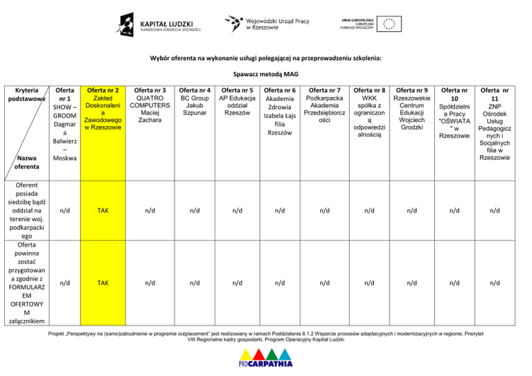 Wybór oferenta na wykonanie usługi polegającej na przeprowadzeniu szkolenia: Spawacz metodą MAG Kryteria podstawowe Nazwa oferenta Oferent posiada siedzibę bądź oddział na terenie woj. podkarpacki ego Oferta powinna zostać przygotowan a zgodnie z FORMULARZ EM OFERTOWY M załącznikiem Oferta nr 1 SHOW – GROOM Dagmar a Balwierz – Moskwa Oferta nr 2 Oferta nr 3 Oferta nr 4 Oferta nr 5 Zakład Doskonaleni a Zawodowego w Rzeszowie QUATRO COMPUTERS Maciej Zachara BC Group Jakub Szpunar AP Edukacja oddział Rzeszów Oferta nr 6 Akademia Zdrowia Izabela Łajs filia Rzeszów Oferta nr 7 Oferta nr 8 Oferta nr 9 Podkarpacka Akademia Przedsiębiorcz ości WKK spółka z ograniczon ą odpowiedzi alnością Rzeszowskie Centrum Edukacji Wojciech Grodzki n/d TAK n/d n/d n/d TAK n/d n/d Oferta nr 10 Oferta nr 11 Spółdzielni a Pracy "OŚWIATA "w Rzeszowie ZNP Ośrodek Usług Pedagogicz nych i Socjalnych filia w Rzeszowie n/d n/d n/d n/d n/d n/d n/d n/d n/d n/d n/d n/d n/d n/d Projekt „Perspektywy na (samo)zatrudnienie w programie outplacement” jest realizowany w ramach Poddziałania 8.1.2 Wsparcie procesów adaptacyjnych i modernizacyjnych w regionie, Priorytet VIII Regionalne kadry gospodarki, Program Operacyjny Kapitał Ludzki nr 1 do niniejszego zapytania. Oferta sporządzona w języku polskim, w formie pisemnej, atramentem lub długopisem, maszynowo lub komputerow o n/d TAK n/d n/d n/d n/d n/d n/d n/d n/d n/d Oferta wraz z załącznikami była umieszczona w zamkniętej kopercie wraz z opisem n/d TAK n/d n/d n/d n/d n/d n/d n/d n/d n/d Zaoferowana cena uwzględnia wykonanie wszystkich n/d 5400,00 PLN n/d n/d n/d n/d n/d n/d n/d n/d n/d Projekt „Perspektywy na (samo)zatrudnienie w programie outplacement” jest realizowany w ramach Poddziałania 8.1.2 Wsparcie procesów adaptacyjnych i modernizacyjnych w regionie, Priorytet VIII Regionalne kadry gospodarki, Program Operacyjny Kapitał Ludzki prac i czynności świadczonyc h przez okres i na warunkach określonych w ofercie. Wykonawcy złożyli oferty wraz z wymaganymi załącznikami Oferowana cena za przeprowadz enia szkolenia Liczba zrealizowany ch godzin szkoleniowyc h w ostatnich 3 latach o tematyce zbliżonej do szkoleń objętych przedmiotow ym n/d TAK n/d n/d n/d n/d n/d n/d n/d n/d n/d n/d TAK n/d n/d n/d n/d n/d n/d n/d n/d n/d n/d 600 n/d n/d n/d n/d n/d n/d n/d n/d n/d Projekt „Perspektywy na (samo)zatrudnienie w programie outplacement” jest realizowany w ramach Poddziałania 8.1.2 Wsparcie procesów adaptacyjnych i modernizacyjnych w regionie, Priorytet VIII Regionalne kadry gospodarki, Program Operacyjny Kapitał Ludzki zamówienie m (min.50 h) Akredytacja Ministerstwa Edukacji Narodowej Suma uzyskanych punktów n/d TAK n/d n/d n/d n/d n/d n/d n/d n/d 103 Projekt „Perspektywy na (samo)zatrudnienie w programie outplacement” jest realizowany w ramach Poddziałania 8.1.2 Wsparcie procesów adaptacyjnych i modernizacyjnych w regionie, Priorytet VIII Regionalne kadry gospodarki, Program Operacyjny Kapitał Ludzki n/d