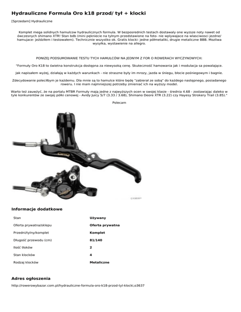 Hydrauliczne Formula Oro k18 przod/ tył + klocki [Sprzedam] Hydrauliczne Komplet mega solidnych hamulcow hydraulicznych formula. W bezposrednich testach dostawaly one wyzsze noty nawet od ówczesnych shimano XTR! Stan bdb (mini pękniecie na tylnym przedstawione na foto- nie wplywajace na wlasciwosci jezdne/ hamujace- jeździłem i testowałem). Technicznie wszystko ok. Gratis klocki- jedne półmetaliki, drugie metaliczne BBB. Mozliwa wysyłka, wystawienie na allegro. PONIZEJ PODSUMOWANIE TESTU TYCH HAMULCÓW NA JEDNYM Z FOR O ROWERACH WYCZYNOWYCH: "Formuły Oro K18 to świetna konstrukcja dostępna za niewysoką cenę. Skuteczność hamowania jak i modulacja sa powalające. Jak napisałem wyżej, działają w każdych warunkach - nie straszne były im mrozy, jazda w śniegu, błocie pośniegowym i bagnie. Zdecydowanie poleciłbym je każdemu. Dla mnie są to hamulce które będę "zabierał ze sobą" do każdego następnego, posiadanego roweru. I nie mam najmniejszej potrzeby zmieniać ich na wyższy model. Warto też zauwżyć, że na portalu MTBR Formuły mają jedne z najwyższych ocen w swojej klasie - średnia 4.68 - zostawiając daleko w tyle konkurentów ze swojej półki cenowej - Avidy Juicy 5/7 (3.33 / 3.68), Shimano Deore XTR (3.22) czy Hayesy Strokery Trail (3.85)." Polecam Informacje dodatkowe Stan Używany Oferta prywatna/sklepu Oferta prywatna Przedni/tylny/komplet Komplet Długość przewodu (cm) 81/140 Ilość tłoków 2 Stan klocków 4 Rodzaj klocków Metaliczne Adres ogłoszenia http://rowerowybazar.com.pl/hydrauliczne-formula-oro-k18-przod-tyl-klocki,o3637 Kontakt Mail: [email protected] Telefon: Lokalizacja , Warszawa Mazowieckie (Polska) Ogłoszenie dodano: 2016-03-14 13:27:11 Ogłoszenie wygasa: 2017-04-25 13:27:11 Powered by TCPDF (www.tcpdf.org)
