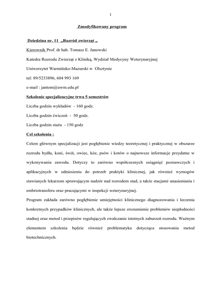 1 Zmodyfikowany program Dziedzina nr. 11 „Rozród zwierząt „ Kierownik Prof. dr hab. Tomasz E. Janowski Katedra Rozrodu Zwierząt z Kliniką, Wydział Medycyny Weterynaryjnej Uniwersytet Warmińsko-Mazurski w Olsztynie tel: 89/5233896, 604 993 169 e-mail : [email protected] Szkolenie specjalizacyjne trwa 5 semestrów Liczba godzin wykładów - 160 godz. Liczba godzin ćwiczeń - 50 godz. Liczba godzin stażu - 150 godz Cel szkolenia : Celem głównym specjalizacji jest pogłębienie wiedzy teoretycznej i praktycznej w obszarze rozrodu bydła, koni, świń, owiec, kóz, psów i kotów o najnowsze informacje przydatne w wykonywaniu zawodu. Dotyczy to zarówno współczesnych osiągnięć poznawczych i aplikacyjnych w odniesieniu do potrzeb praktyki klinicznej, jak również wymogów stawianych lekarzom sprawującym nadzór nad rozrodem stad, a także stacjami unasieniania i embriotransferu oraz pracującymi w inspekcji weterynaryjnej. Program zakłada zarówno pogłębienie umiejętności klinicznego diagnozowania i leczenia konkretnych przypadków klinicznych, ale także lepsze zrozumienie problemów niepłodności stadnej oraz metod i przepisów regulujących zwalczanie istotnych zaburzeń rozrodu. Ważnym elementem szkolenia biotechnicznych. będzie również problematyka dotycząca stosowania metod 2 Tematyka wykładów, seminariów,ćwiczeń 1. Zagadnienia wstępne Wykłady – 6 godzin Cykl reprodukcyjny, cykl płciowy i jego przejawianie, neuroendokrynna regulacja układu rozrodczego samic i samców, aspekty biologiczne i kliniczne, specyfika gatunkowa, sezonowość rozrodu, dojrzałość hodowlana i rozrodcza, płodność i niepłodność, znaczenie gospodarcze, przepisy prawne regulujące weterynaryjny nadzór nad rozrodem zwierząt, zagadnienia epidemiologiczne, zasady etyki, problemy dobrostanu. 2. Zeński układ rozrodczy – aspekty kliniczne i biologiczzne Wykłady i ćwiczenia – 10 godz Anatomia i funkcja, cykl jajnikowy i jego przejawy kliniczne, owulacja i metody jej wykrywania, macica i jej znaczenie, srom i pochwa, metody kliniczne i laboratoryjne diagnozowania fizjologicznych i patologicznych stanów narządu płciowego, zaburzenia hormonalne i metody ich terapii, inne metody terapii (antybiotyki). 3. Męski układ rozrodczy – aspekty kliniczne i biologiczne Wykłady i ćwiczenia - 6 godzin Anatomia i funkcja fizjologiczne, biochemiczne i endokrynne aspekty czynności jąder, rola najądrzy i dodatkowych gruczołów płciowych, budowa i ultrastruktura plemników oraz ich produkcja i wydalanie, plazma nasienia i jej znaczenie, rozpoznawanie zaburzeń rozwojowych plemników oraz laboratoryjne badanie nasienia, kliniczne badanie męskiego narządu płciowego, badania uzupełniające. 4. Zapłodnienie i wczesna ciąża Wykłady – 4 godziny Unasienianie i kopulacja, termin owulacji, kapacytacja, reakcja akrosomowa, komórka jajowa, zapłodnienie, zygota i jej rozwój, znaczenie jajowodu, środowisko maciczne, nidacja, implantacja, typy łożysk. 3 5. Ciąża, poród i okres poporodowy Wykłady i ćwiczenia – 8 godzin Mechanizmy regulacyjne ciąży, ciąże pojedyncze i bliźniacze, hormonalna regulacja, wczesna śmierć zarodkowa, ronienia, diagnozowanie ciąży i jej znaczenie (metody kliniczne, fizyczne, endokrynologiczne i biochemiczne), poród i jego mechanizmy, różnice gatunkowe, okres poporodowy, aktywność jajników, inwolucja macicy, metody hormonalnego sterowania ciążą i porodem, indukcja ronień i porodów. 6. Schorzenia noworodków Wykłady – 6 godzin Podstawowe definicje neonatologiczne, kliniczno-fizjologiczne parametry noworodków, poród a stan noworodków, zamartwica, zakaźne i niezakaźne schorzenia noworodków, postępowanie i metody leczenia. 7. Immunologiczne aspekty rozrodu Wykłady – 6 godzin Podstawy immunologii, antygeny jąder, plemników i plazmy nasienia, antygeny i przeciwciała narządu rozrodczego samic, przeciwplemnikowe reakcje immunologiczne samic, immunologiczne aspekty ciąży, immunosupresja, immunomodulacja. 8. Przenoszenie zarodków Wykłady seminaria – 8 godzin Rola i znaczenie w rozrodzie, aspekty hodowlane i higieniczne, regulacje prawne, podstawy fizjologiczno-hormonalne, wybór i przygotowanie dawczyń, przygotowanie biorczyń, metody pozyskiwania zarodków, ocena i klasyfikacja zarodków, metody przenoszenia zarodków, zamrażanie zarodków, ocena zarodków po rozmrożeniu, hodowla in vitro, mikromanipulacje na zarodkach, wybrane zagadnienia inżynierii genetycznej, przepisy prawne dotyczące obrotu materiałem biologicznym. 9. Sztuczna inseminacja – część ginekologiczna Wykłady i ćwiczenia – 12 godzin Przedinseminacyjne badanie samic, rozpoznawanie rui oraz określanie terminu owulacji (metody kliniczne i dodatkowe), wybrane zaburzenia owulacji, technika inseminacji, różnice gatunkowe, kontrola terminowości unasieniania, weterynaryjne, higieniczne oraz hodowlane 4 aspekty sztucznej inseminacji, aktualny stan sztucznej inseminacji w kraju i na świecie, przepisy prawne. 10. Sztuczna inseminacja – tok produkcji nasienia Wykłady i ćwiczenia – 10 godzin Organizacja i podstawy prawne funkcjonowania stacji, wymogi dotyczące oceny przydatności rozpłodowej samców, metody pozyskiwania nasienia, ocena jakości nasienia, rozcieńczalniki, metody konserwacji nasienia i jego przechowywania, dokumentacja towarzysząca przekazywania i przechowywania nasienia, badania cytogenetyczne samców, nadzór lekarsko-weterynaryjny nad tokiem produkcji nasienia, przepisy prawne dotyczące nadzoru nad produkcją oraz obrotem nasienia. 11. Sterowanie oraz indukowanie cyklu płciowego, owulacji i porodu Wykłady i ćwiczenia – 6 godzin Definicja, znaczenie gospodarcze i hodowlane, synchronizacja cyklu rui i owulacji, metody biologiczne i hormonalne (prostaglandyny, GnRH/PGF2, gestageny, melatonina), indukowanie porodów, metody hormonalne (prostaglandyny, kortykosterydy, oksytocyna), sterowanie rozrodem w duż